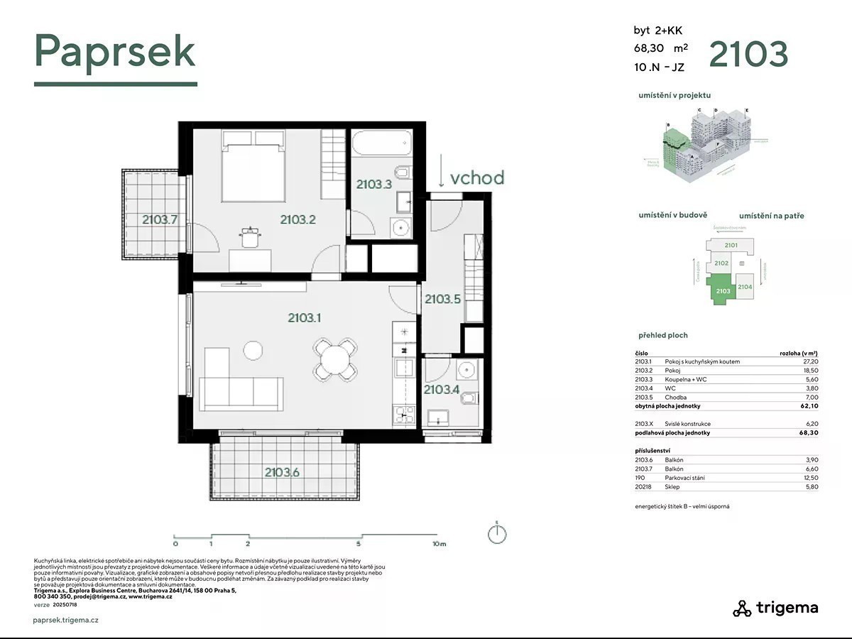 Na jihozápad orientovaný vzdušný byt 2+kk o celkové rozloze přes 68 m2 s balkonem o velikosti téměř 4 m2 a druhým balkonem o velikosti přes 6 m2. Byt okouzlí vzdušností a dostatkem prostoru, stejně jako dechberoucími výhledy. Byt je umístěn v devátém nadzemním podlaží bytového domu a obytné místnosti nabízí výhled do klidného vnitrobloku a ulice směrem k poště. Srdcem bytu je velkorysý obývací pokoj. Byt nabízí velké množství úložných prostor, a to jak v prostorné členěné vstupní chodbě, tak v obytných místnostech. Koupelna je vybavena vanou, toaletou a umyvadlem a nachází se v ní připojení pračky, v bytě se pak nachází ještě další samostatné wc s umývátkem. Byt je ideální volbou pro singles či mingles, jako startovací bydlení nebo jako investiční byt k následnému pronájmu. BENEFIT: Prostorný byt s balkony a dechberoucím výhledem. TIP: Ideální volbou pro singles či mingles, jako startovací bydlení nebo jako investiční byt k následnému pronájmu. Fotografie interiéru jsou pouze referenční. Pro prohlídku nemovitosti kontaktujte makléře společnosti. Nabídka dalších dokončených bytů na stránkách developerského projektu.