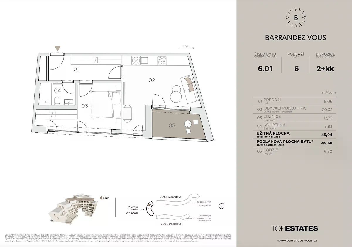 Krásný byt s výhledy do přírody a okolí! Poslední v nejvyšším patře nové rezidence. Byt 6.01 (2+kk 50m2) je umístěn ve 6.patře šestipatrové rezidence a bude dokončený na konci letošního roku. Obytný prostor s kuchyňským koutem prodlužuje prostorná krytá lodžie s obkladem z přírodního dřeva. Pokoj doplňuje kout s velkoformátovým sníženým oknem, které se v ještě velkorysejším rozměru nachází i v ložnici. V ložnici je navíc podél okna další velký prostor, který může sloužit buď jako dětský koutek spojený s ložnicí nebo jako úložné prostory. Pokoje jsou orientované na jihozápadní stranu, kde bude celé odpoledne příjemný pobyt s odpoledním sluncem a výhledy do okolí. K pohodové atmosféře domova budou přispívat světlé prostory díky velkoformátovým hliníkovým oknům. Poskytnou dostatek přirozeného světla a moderní snížené parapety vytvoří posezení, odkud si můžete vychutnávat krásné výhledy v každém ročním období. Pro tepelnou pohodu i stínění jsou již ve standardu venkovní žaluzie a příprava klimatizace. Promyšlené dispozice a prostorné interiéry s vyšší světlou výškou budou doplňovat dřevěné podlahy a designové koupelny s podlahovým vytápěním a sprchovým koutem walk-in. Celkový komfort bydlení zajistí moderní technologie a parkování v podzemních garážích s možností dobíjecích stanic pro elektromobily. V novém rezidenčním projektu se potkalo vše. Moderní design, vysoký standard, nový domov i pro váš elektromobil, bydlení s výhledy na panorama Prahy i propojení s přírodou. Developerská skupina TOP ESTATES zahájila výstavbu druhé etapy v 02/2024, hrubá stavba je dokončena a kolaudace bytového domu ZÁPAD je naplánována na konec roku 2025. K rezervaci bytu nyní stačí pouze 15% a zbývající částka až po dokončení. Výjimečným benefitem je v BARRANDEZ-VOUS i venkovní prostor. Originální rukopis Ferdinanda Lefflera, krále českých zahrad, je tady znát na každém kroku. Sdílený park uprostřed nejsou jen stromy a květiny. Součástí jsou i venkovní relaxační a herní prvky, které jsou citlivě zasazeny do celého konceptu zeleně. Pro děti vznikla bezpečná místa pro zábavu a hry a pro všechny ostatní věkové kategorie zóny pro odpočinek i setkávání. Neváhejte se přijít podívat i na dokončenou I. etapu, překvapí vás klidná lokalita, relaxační zóny a příjemná atmosféra nového parku. Naleznete jej v ulici Kurandové na Barrandově, v lokalitě s kompletní občanskou vybaveností a přímým spojením do centra jak MHD, tak autem. V okolí můžete k procházkám do přírody využít blízký Chuchelský háj, Červený lom i kouzelné Prokopské údolí. Unikátnost a kvalitu I. etapy projektu několikrát ocenila také odborná porota prestižními cenami za architekturu a veřejný prostor. OBJEVTE propojení města s přírodou a ŽIJTE SPOKOJENĚ v BARRANDEZ-VOUS. Kompletní nabídku bytů naleznete na stránce projektu.