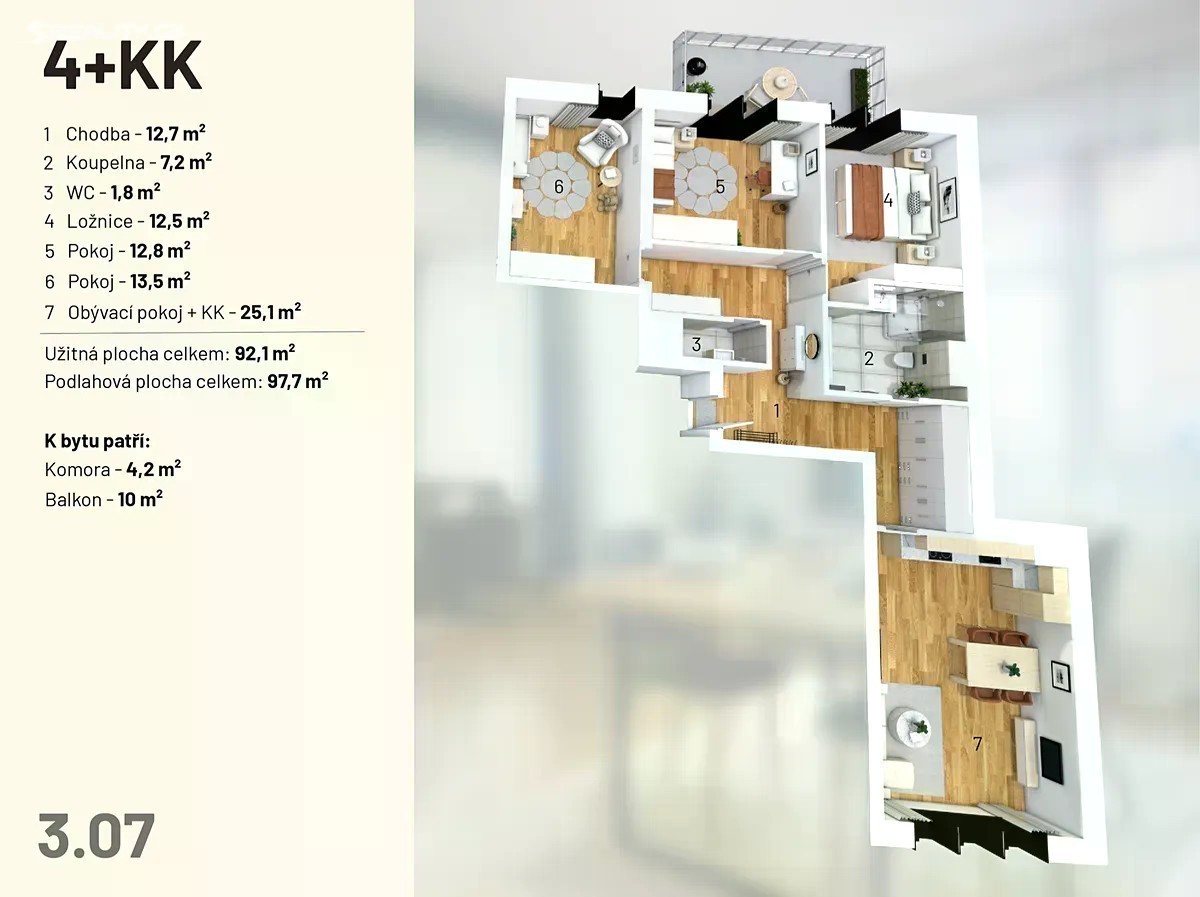 Dovolujeme si Vám nabídnout k prodeji moderní byt 3+kk s možností úpravy na 4+kk v bytovém domě v centru Českých Budějovic. Tento byt s podlahovou plochou 97m² je umístěn ve 4. patře a nabízí komfortní bydlení s výtahem a bezbariérovým přístupem. Součástí bytu je balkon a komora umístěná v patře a možnost přikoupení parkovacího stání. Do uliční fasády jsou osazena okna se štěrbinovým větráním a s minimálním hlukovým útlumem 42 db a s možností montáže venkovních žaluzií. V bytě je příprava pro montáž klimatizace. Dokončení a předání proběhne v březnu 2027. Akce na cenové zvýhodnění až 210.000,-Kč, byla prodloužena d ********* Cena bytu je vč. komory, balkonu ev.lodžie a je konečná bez dalších poplatků za realitní služby. Pro více informací o této nemovitosti nebo sjednání informativní schůzky nás prosím kontaktujte nebo vyplňte níže uvedený formulář, rádi Vás budeme o všem informovat.