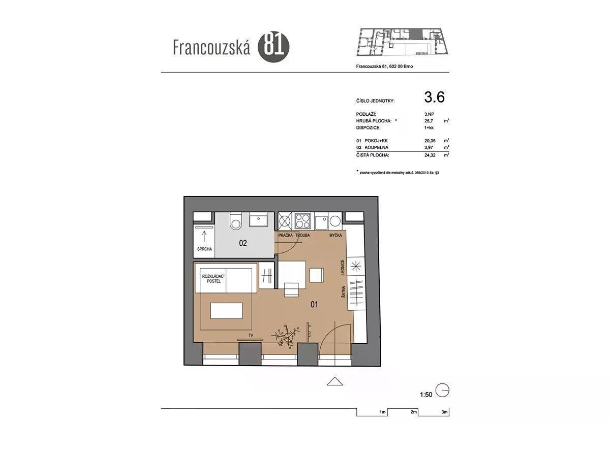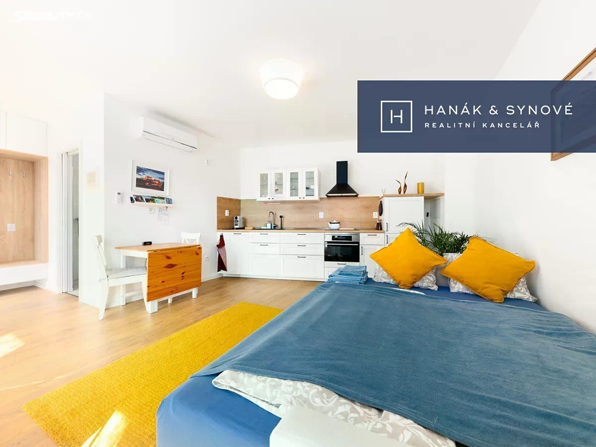 Jste zvyklí bydlet luxusně a bez starostí? Přijíždíte na Erasmus a chcete zařízenou jednotku? K dlouhodobému pronájmu Vám nabízíme nový, krásný, světlý, moderní ateliér OV 1+kk v novostavbě bytového domu na ulici Francouzská, Brno s výbornou dopravní dostupností. Byt o ploše 26,2 m2 je umístěn ve 4.NP cihlového domu s výtahem a je orientován na východ do klidného vnitrobloku. Ateliér je zařízený ve vysokém standardu a je nabízen kompletně zařízený - kuchyňská linka se spotřebiči (varná deska, digestoř, trouba, mikrovlnná trouba, myčka, vestavěná lednice s mrazákem, pračka), vestavěná skříň, rozkládací postel, jídelní stůl se židlemi, botník, věšák, venkovní žaluzie. Koupelna je vybavena sprchovým koutem se skleněnou zástěnou značky HÜPPE, záchodem a umyvadlem s umyvadlovou skříňkou. Jednotka je kompletně zařízená, od skleniček až po ložní prádlo. Dům je napojen na optickou datovou síť, která umožňuje připojení až o rychlosti 300 Mbit. Internet není součástí nákladů za služby, nájemník si zřizuje připojení k internetu samostatně. Dům Francouzská 417/81, Brno se nachází v bezprostřední blízkosti centra města, brněnské části Zábrdovice. V docházkové vzdálenosti se nachází Park 28. října či pěkná stezka podél řeky Svitavy. V místě je také veškerá občanská vybavenost a výborná dostupnost MHD (ze zastávky Dětská nemocnice TRAM č. 3, 5, 9, ze zastávky Tkalcovská TRAM 2, 4, 7). Nájem je možný od 1.11.2025, výše měsíčního nájmu činí 14.990, -Kč/měsíčně, přičemž cena je uvedena bez záloh na služby. Zálohy na služby jsou 2.500, -Kč/měsíčně a zahrnují zálohy na vodné/stočné, plynové vytápění a elektřinu spotřebovanou v bytě. Vratná kauce je ve výši 30.000, -Kč. Provize realitní kanceláři je ve výši jednoho nájmu (14.990,-Kč ). Pronájem je vhodný pro jednotlivce, či pár, maximálně však pro 2 osoby. Byt je striktně nekuřácký. Pro více dotazů jsme Vám k dispozici. Za poplatek je možné objednat pravidelný úklid.