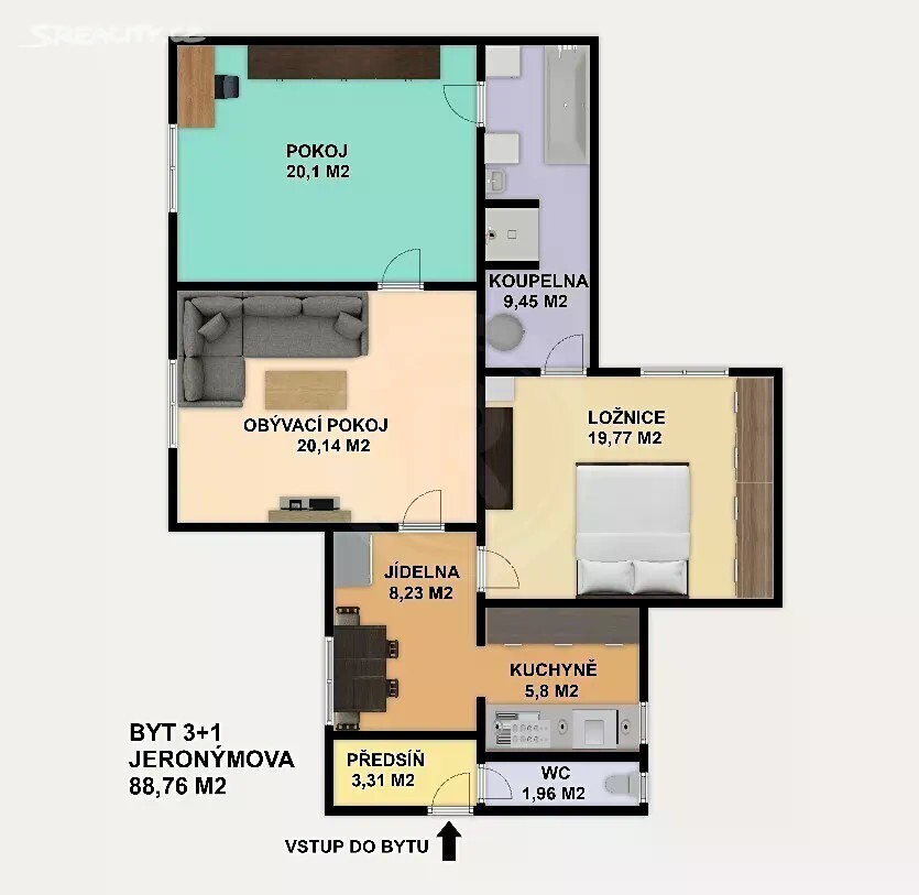 Nabízíme prodej zděného bytu 3+1 v osobním vlastnictví, v ulici Jeronýmova, v širším centru města Českých Budějovic. Bytová jednotka o celkové výměře 94,1 m2 se nachází ve třetím patře zděného činžovního domu s výtahem. Velmi pěkný a prostorný byt sestává ze vstupní předsíně, kuchyně, jídelního koutu, obývacího pokoje, ložnice, dětského pokoje, koupelny s vanou, sprchovým koutem, samostatného WC. Bytová jednotka prošla kompletní rekonstrukcí (kuchyňská linka, podlahy laminátové - plovoucí, zděné koupelnové jádro, interiérové dveře, vestavěné skříně, rozvody vody, odpadů a elektřiny atd.) Vytápění bytu je centrální vlastním kondenzačním plynovým kotlem se zásobníkem na ohřev teplé vody. K bytu náleží také sklep umístěný v suterénu domu. Parkování je zajištěno ve vnitrobloku domu s výjezdem přes elektronickou bránu. V dosahu zastávka MHD a veškerá občanská vybavenost (škola, školka, lékař, pošta, obchody). Doporučujeme osobní prohlídku.