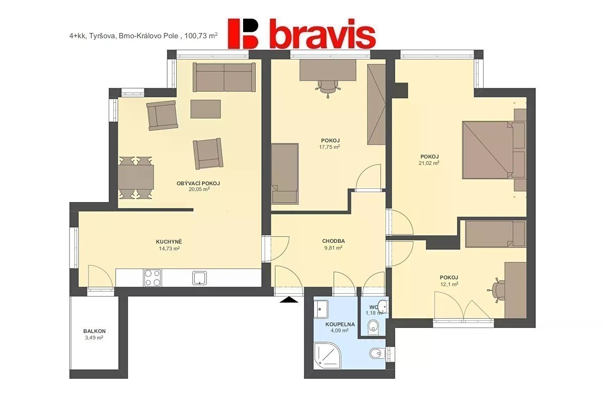 Ve výhradním zastoupení majitele nabízíme k pronájmu prostorný byt o velikosti 4+kk v žádané lokalitě Brno - Královo Pole na ul. Tyršova. Nově zrekonstruovaný byt o celkové ploše 100 m² se nachází ve 3. patře bytového domu bez výtahu. Kuchyňská linka je vybavená sklo-keramickou varnou deskou s elektrickou troubou a digestoří. Koupelna je zařízena novou vanou, umyvadlem se zrcadlovou skříňkou a otopným žebříkem. Toaleta je samostatně, V pokojích je nová plovoucí podlaha, zbylé části sou pokryty dlažbou. Okna jsou vybavena žaluziemi. K bytu je možné si pronajmout i sklep. Parkování přímo před domem. Připojení internetu za příplatek. Byt se nachází v klidné části Brna se snadnou dostupností do centra, zastávka MHD kousek od domu. Výborná občanská vybavenost (lékárna, mateřská a základní škola, dětské hřiště, obchody, restaurace, park), v okolí potřebné a nezbytné instituce a služby. Byt je ihned k dispozici. Prohlídky možné po domluvě s níže uvedeným makléřem. Možnost zajištění jednorázového či pravidelného úklidu naší úklidovou firmou.