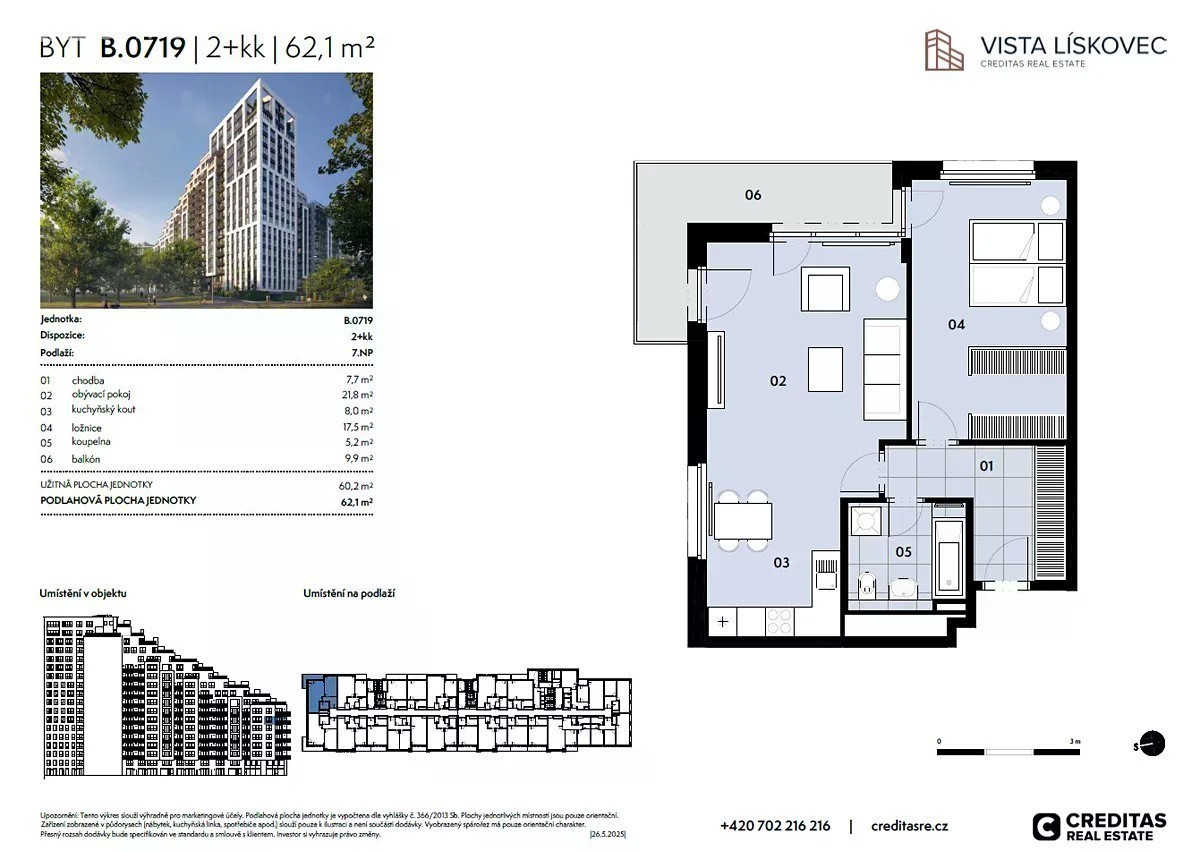 První etapa nového brněnského rezidenčního projektu Vista Lískovec je právě v prodeji! Nabízíme byt 2+kk o celkové výměře 62 m², umístěný v 7. nadzemním podlaží. První etapa projektu nabídne celkem 260 promyšlených jednotek - od útulných 1+kk pro první bydlení až po rodinné 4+kk a prémiové mezonety v nejvyšších patrech. Většina bytů a ateliérů disponuje balkonem, přízemní jednotky nabízejí soukromé předzahrádky. Od devátého patra výše pak díky unikátnímu tvaru budovy vznikají prostorné terasy s dechberoucími výhledy na široké okolí a dostatkem místa pro trávení volného času. Jsou vybaveny integrovanými květníky, které zajišťují soukromí a nechybí ani praktický venkovní úložný prostor. V přízemí najdete komerční prostory pro služby, které zpříjemní život rezidentů. Samozřejmostí jsou garážová stání, sklepy, kolárna, myčka kol i uzavřený vnitroblok plný zeleně s dětským hřištěm a relaxačními zónami. Lokalita vás nezklame. Vista Lískovec se nachází v oblíbené části Brna - Starém Lískovci - jen pár kroků od zastávky šaliny Západní brána a v těsné blízkosti Jihlavské ulice. V pěší vzdálenosti máte školky, školy, nákupní centrum Campus Square, Fakultní nemocnici, kampus Masarykovy univerzity i sportovní areály. V okolí nechybí ani lesopark, přírodní rezervace Kamenný vrch nebo rozsáhlý park Bobrava. Plánované dokončení projektu je ve 4.Q roku 2028. Cena nezahrnuje garážové stání a sklep - jednotková cena garážového stání je 600 000 Kč vč. DPH, cena sklepu dle velikosti. Prodej probíhá přímo od developera. Pro více informací nás neváhejte kontaktovat.