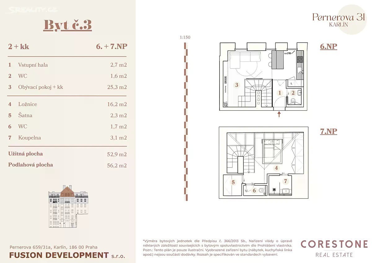Pernerova 31 je komorní rezidenční projekt v srdci pražského Karlína, který spojuje moderní městské bydlení s respektem k historickému prostředí. Stylová nástavba na tradičním činžovním domě nabízí jedinečné výhledy na Karlínské náměstí a jeho ikonickou dominantu - kostel sv. Cyrila a Metoděje. Výjimečná poloha, nadčasová architektura a příležitost vtisknout interiéru vlastní charakter dělají z projektu místo, které má duši i budoucnost. V rámci projektu nabízíme mezonetový byt 2+kk o podlahové ploše 61,7 m2, umístěný v 6. a 7. nadzemním podlaží. Dispozice zahrnuje vstupní halu, obývací pokoj s přípravou pro kuchyňský kout, ložnici a koupelnu s praktickou technickou místností. Byt je navržen s důrazem na efektivní využití prostoru a pohodlí pro každodenní život. Díky umístění v nejvyšších patrech domu nabízí klid, dostatek denního světla a příjemné výhledy na okolní historickou zástavbu Karlína. Začátek výstavby projektu je plánován na srpen 2025, přičemž kolaudace se předpokládá na jaře 2027. V této fázi je navíc možné realizovat klientské změny a upravit dispozice či vybavení bytu podle vlastních představ. Karlín patří mezi nejžádanější pražské čtvrti - kombinuje historickou atmosféru s moderním městským životem. V docházkové vzdálenosti od projektu se rozprostírá Karlínské náměstí s majestátním kostelem sv. Cyrila a Metoděje, ikonou celé čtvrti. Volný čas můžete trávit v blízkém parku Vítkov, na cyklostezkách podél Vltavy nebo na ostrově Štvanice, který je snadno dostupný díky nové lávce HolKa. Karlín je také známý svou gastro scénou - najdete tu oblíbenou Esku, Etapu, Štangl, Lokál Hamburk i pivovar Dva Kohouti. Čtvrť s vlastním rytmem, stylem a výbornou dostupností do centra.