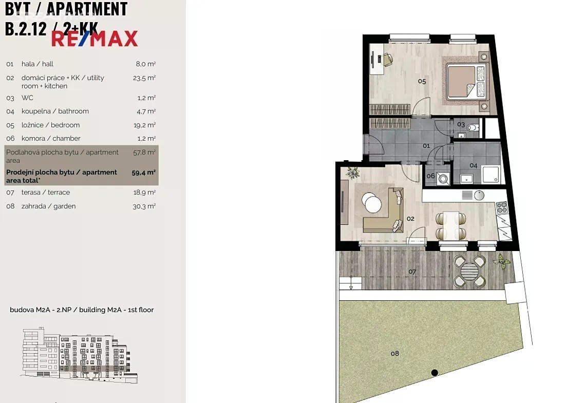 Hledáte domov, který kombinuje moderní architekturu, soukromí a zeleň v jedné z nejoblíbenějších pražských lokalit? Tento nadstandardně zařízený byt o dispozici 2+kk a ploše 59 m² s téměř 50 m² privátní zahrádky vás osloví na první pohled - a nepustí. Byt se nachází v architektonicky výjimečném projektu Victoria Košíře z roku 2020, za kterým stojí renomovaný developer Real-Treuhand. Obytný komplex citlivě zapadá do okolní zástavby a nabízí příjemné soukromí i esteticky propracované prostředí. Interiér bytu byl navržen v duchu skandinávské elegance - světlý, vzdušný a nadčasový. Veškerý nábytek na míru z truhlářské dílny včetně vestavěných skříní, kuchyňské linky a dalších prvků zůstává součástí vybavení. Kuchyňská linka je osazena kvalitními spotřebiči s energetickou třídou A a navržena s maximálním důrazem na funkčnost i design. V bytě jsou instalovány praktické rolety i venkovní žaluzie, dřevěné podlahy, špičková dřevěná okna s izolačním zasklením i chytrý pracovní kout v ložnici. Z obývací části se vychází na prostornou terasu s posezením, která plynule přechází v pečlivě udržovanou zahrádku. Vysazené vzrostlé rostliny zajišťují maximální soukromí a vytvářejí příjemnou, téměř meditační atmosféru. Jde o místo jako stvořené pro relaxaci, odpolední kávu nebo letní večery s přáteli. Lokalita Košíř patří k nejzelenějším částem širšího centra Prahy, a zároveň disponuje špičkovou občanskou vybaveností. V pěší vzdálenosti najdete školy, školky, obchody, kavárny, restaurace i lékárnu. Milovníci pohybu ocení blízké lesoparky, veřejné zahrady i sportovní areály. Tramvajová zastávka Kavalírka je pár minut od domu a dopraví vás na metro Anděl za pouhých 7 minut. Parkovací stání je možné si pronajmout od konkrétního majitele. Sklep o výměře 3,4m² je součástí prodeje. Půdorys je na konci galerie. K dispozici od 1.11. 2025. Pro koupi nemovitosti Vám ráda zajistím výhodné financování na míru - využijte možnost zprostředkování úvěru nebo poradenství od našeho hypotéčního specialisty. Pro více informací volejte. Těším se na Vaši návštěvu.