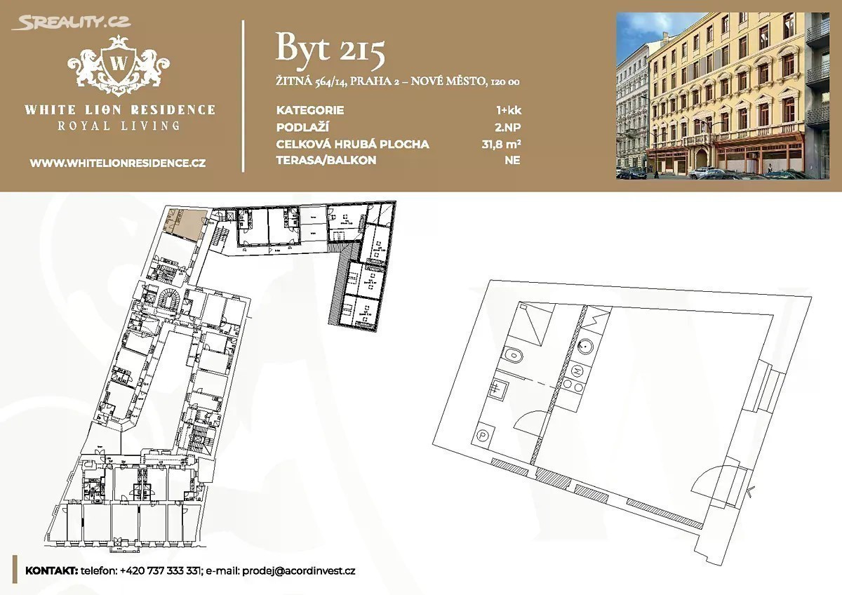 Nabízíme k prodeji byt o dispozici 1+kk v historickém domě po kompletní rekonstrukci na adrese Žitná 14. • přímo od developera • celý dům prošel kompletní rekonstrukcí (nová střecha, rozvody, okna a fasáda) • byt 1+kk o rozloze 31,8 m² se nachází v 2. nadzemním podlaží ve vnitrobloku domu Unikátní nemovitost v samotném centru Prahy - White Lion Residence, dříve známou jako dům „U Bílého lva“, na prestižní adrese Žitná 14. Tento historický měšťanský dům je nejen architektonickým skvostem, ale i místem s mimořádnou kulturní hodnotou - v minulosti zde žil slavný hudební skladatel Antonín Dvořák. Lokalita nabízí ideální kombinaci klidného městského bydlení a pulzujícího života centra. V těsné blízkosti se nachází Václavské náměstí, Národní muzeum, restaurace, kavárny, kulturní instituce i stanice metra a tramvají. White Lion Residence představuje ideální investiční příležitost i stylové bydlení s historickou atmosférou.