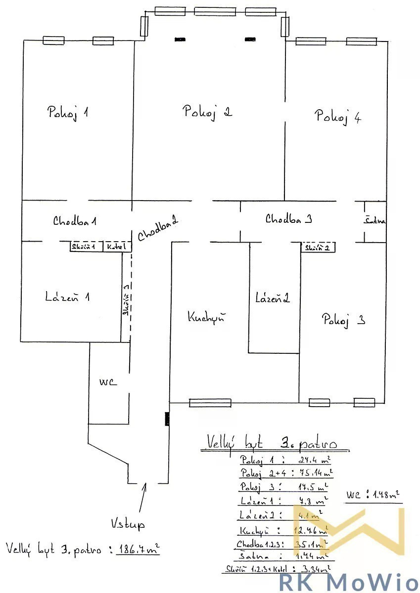 K pronájmu nabízíme klasický byt č. 5 bez nábytku, o dispozici 4+1 s podlahovou plochou 186,7 m2, situovaný ve 3. patře (4. nadzemní podlaží) secesní budovy s výtahem, ve vyhledávané lokalitě Senovážné náměstí na Praze 1 - Nové Město. Půdorys bytové jednotky nabízí vstupní chodbu, vzdušný obývací pokoj s jídelním prostorem, oddělenou kuchyni, 3 ložnice, 2 koupelny, toaletu pro hosty a šatnu. Vybavení bytu: kuchyňská linka (včetně lednice s mrazákem, sklokeramické varné desky, digestoře, myčky a elektrické trouby), vestavěné skříně, pračka, příprava pro vysokorychlostní internet, dřevěné parkety a dlažba. Nemovitost se nachází ve vyhledávané lokalitě Prahy 1 s veškerou občanskou vybaveností v krátké vzdálenosti - restaurace (Takumi, Bistro U Býka, Restaurace Obecní dům), kavárny (Kavárna Kampus, Sicily café, Zrno zrnko), supermarkety (Billa, Albert) a lokální obchody, úřady, bankomaty a další. Výhodou je téměř bezprostřední poloha od Slovanského domu (multikino Cinema City) a obchodního centra Palladium (např. Mango, The North Face, Gap, Karl Lagerfeld, Swarovski, Foot Locker.). Výborná dopravní dostupnost - stanice metra B - Náměstí Republiky, přestupní stanice metra A a B - Můstek. Nájemné na vyžádání v RK, poplatky 8.000,- Kč/měsíc (domovní služby a služby za byt), převod elektřiny a plynu na nájemce, parkovací stání za 5.000,- Kč/měsíc. Požadovaná jistota (kauce) ve výši dvou měsíčních nájmů. Minimální délka pronájmu 1 rok, ubytování formou Airbnb či spolubydlení nelze realizovat. Dle vyhlášky 78/2013 Sb. uvádíme třídu energetické náročnosti budovy G.