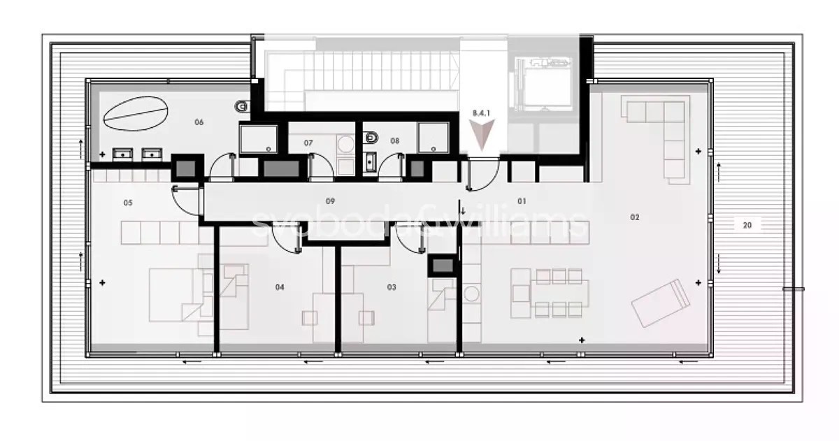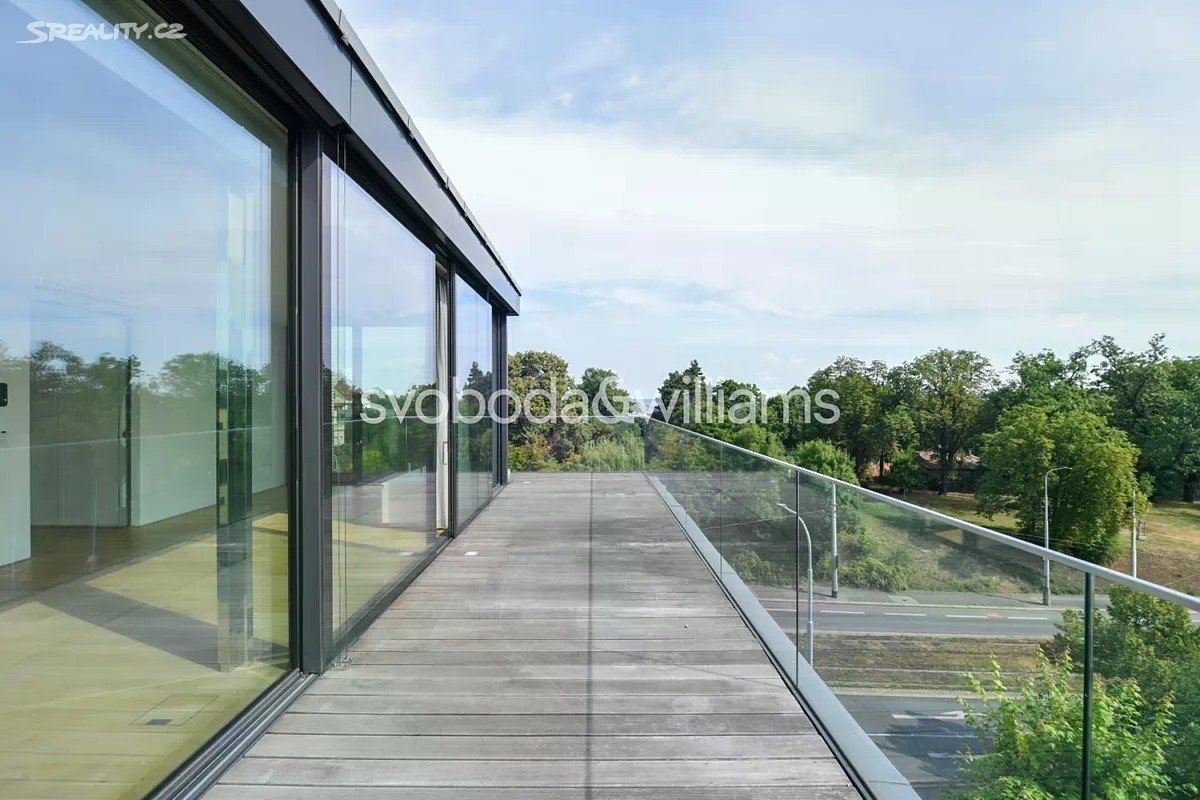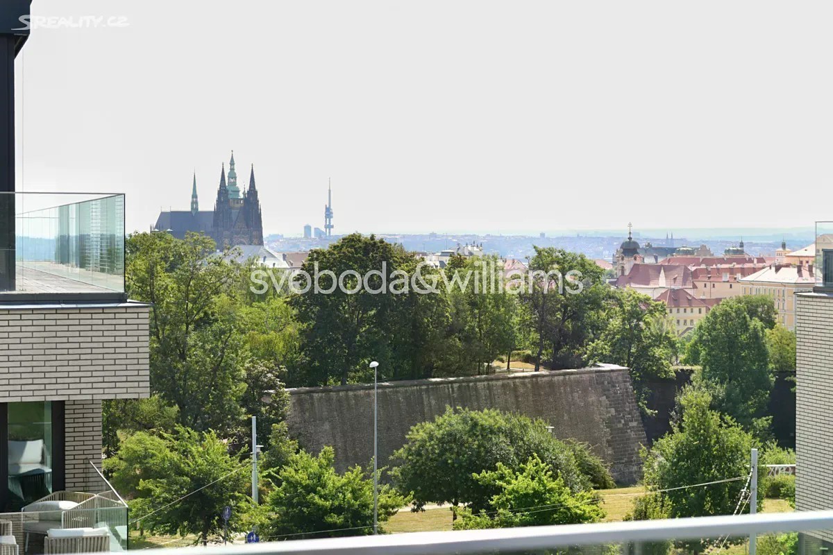 Úchvatný prosklený penthouse se 2 koupelnami, terasou po celém obvodu a krásnými výhledy na Pražský hrad je situovaný v exkluzivním projektu Royal Triangle navrženém renomovaným architektonickým ateliérem. Uzavřený zabezpečený areál s recepcí, společnou zahradou a podzemním parkováním se nachází ve Střešovicích, v pěší vzdálenosti Hradčan i petřínských zahrad. Střešní byt zaujímá celé poslední patro energeticky úsporné budovy s výtahem. Interiér je dispozičně členěn na obývací pokoj s kuchyňským koutem a jídelním prostorem, 3 ložnice, hlavní koupelnu se samostatně stojící vanou a sprchovým koutem, druhou koupelnu, technickou místnost a chodbu. Nadstandardně velká terasa je přístupná ze všech obytných místností. Součástí ceny jsou 2 prostorná garážování stání a téměř 17metrový sklep. Penthouse je vybaven špičkovými materiály a technologiemi odpovídajícími nejvyšším standardům současného bydlení. Hliníková celoplošná okna s izolačním trojsklem jsou doplněna o elektricky ovládané předokenní žaluzie. V obytných místnostech jsou položeny dubové podlahy, na terase tropické dřevo. Kuchyň je kompletně zařízena spotřebiči Miele včetně vestavné vinotéky. Samozřejmostí jsou bezpečnostní vstupní dveře. Nemovitost střeží alarm a kamerový systém, k dispozici je videotelefon. Příjemné klima zajišťuje podlahové vytápění, kapilární stropní chlazení a systém řízeného větrání s rekuperací tepla. Atraktivní lokalita na pomezí vyhledávaných rezidenčních čtvrtí Střešovice a Ořechovka, s rychlým spojením do centra a k plné občanské vybavenosti, s výbornou dostupností na letiště a do mezinárodních škol. V letních dnech potěší blízké koupaliště Petynka s plážovým volejbalem, v blízkosti prochází také cysklostezka vedoucí skrz Letenské sady a Stromovku do Tróje. Přes příjemný městský park Maxe van der Stoela se dá procházkou dojít k Pražskému hradu a na Petřín. Podlahová plocha 137,3 m2, terasa 67,04 m2, sklep 16,8 m2.