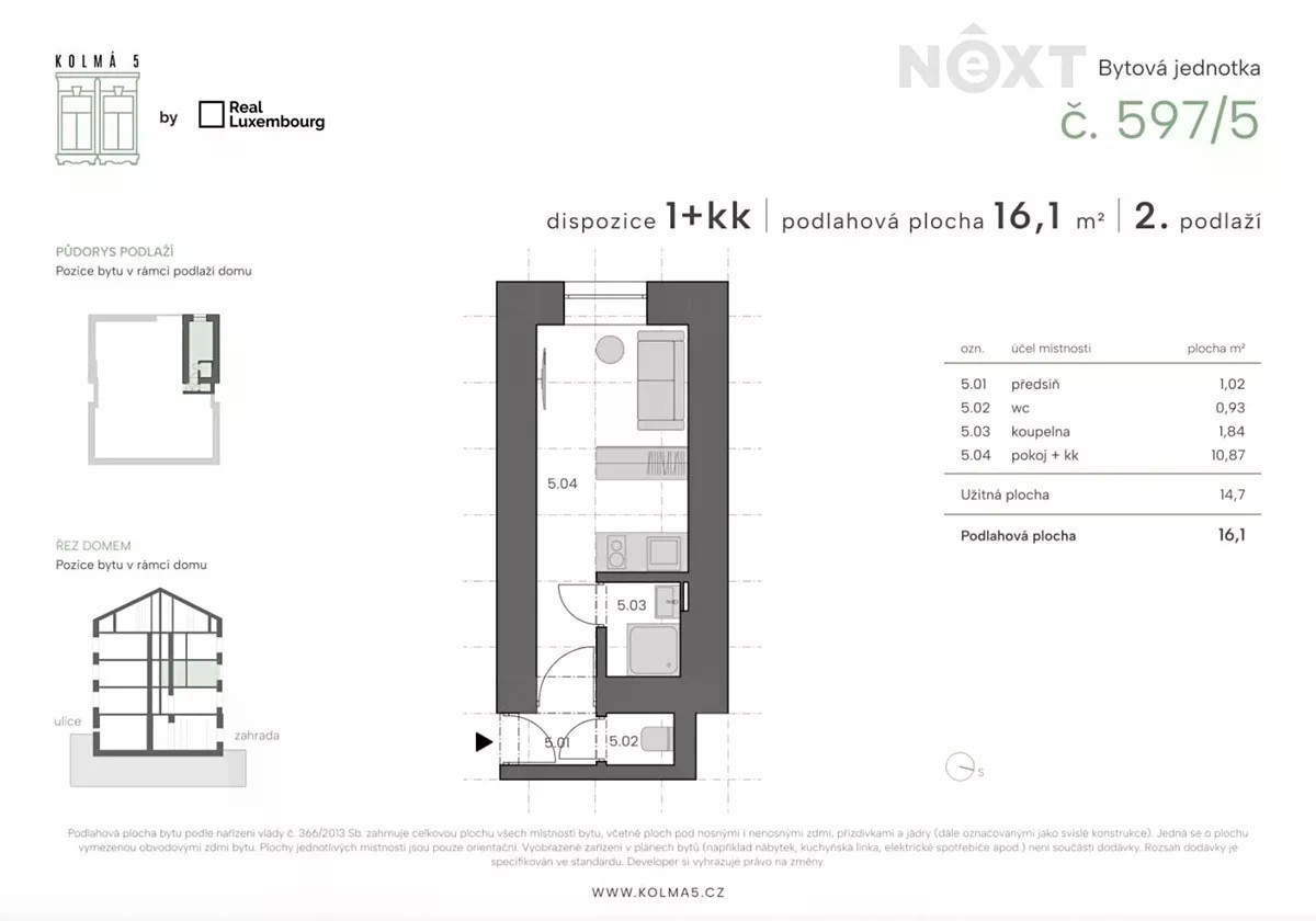 Náš projekt KOLMÁ 5 v pražských Vysočanech má vše, co si od startovacího, nebo investičního bydlení můžete přát. Perfektní lokalita: všechnu důležitou infrastrukturu máte v docházkové vzdálenosti, stejně tak parky a přírodu. MHD: tramvajová a autobusová zastávka (Podkovářská) - 3 minuty a v úplném centru jste do půl hodinky, metro (Kolbenova) - 15 minut, vlak (nádraží Libeň) - 13 minut Nákupní možnosti: Billa přímo naproti projektu přes ulici Poděbradská, v blízkosti ještě Albert Zábava a sportovní vyžití: O2 aréna - 20 minut, Rugby club Praha, fitness louka Rokytka - 10 minut, Factory Form fitness Harfa - 25 minut Příroda a místo pro odpočinek: Park Zahrádky 15 minut, Park Smetanka a meandry Rokytky 20 minut Gastronomie: v bezprostředním okolí je nespočet restaurací, bister, fast foodů či kaváren, takže v tomto ohledu Vám zde také nebude nic chybět Činžovní dům aktuálně prochází rozsáhlou rekonstrukcí, po které nabídne 20 jednotek ve vysokém standardu. Rekonstrukce zahrnuje centrální rozvody médií, fasádu, společné prostory. V jednotkách pak nové rozvody, podlahy, koupelny, sanita a mnoho dalšího. Zbývá už jen vybavení, které Vám rád zařídíme a můžete kvalitně a pohodlně bydlet, nebo bezproblémově pronajímat. Tato konkrétní jednotka č. 5 o dispozici 1kk a podlahové ploše 16,1 m2 se nachází ve 2 nadzemním podlaží s výhledem do zahrady. Je členěna na vstupní chodbu, oddělenou koupelnu, samostatnou toaletu a obývací pokoj s kuchyňským koutem. Přesné rozložení místností, či možný budoucí stav si můžete prohlédnout na přiloženém půdorysu a vizualizacích. Vytápění je řešeno elektrickými přímotopy a ohřev vody elektrickým bojlerem. Prohlídky budou možné během září. Dokončení rekonstrukce je naplánováno na říjen s předáním do konce roku. Pokud Vás již nyní něco zajímá, nebo máte určité dotazy, tak se mi ozvěte. Rád se Vám budu věnovat. Nabízíme Vám kompletní servis včetně právních služeb, zajištění potřebných dokumentů, pomoc s financováním, pojištěním nemovitosti, pojištěním nájmu a domácnosti, vybavením bytu, bytovým designem či přepisem energií. U nás máte možnost využít moderní družstevní financování až na 30 let, bez ohledu na věk či prokazování příjmů - ideální i pro podnikatele bez nutnosti předkládat daňové přiznání. Zjistěte, jak můžete bydlet chytře! Pro komunikaci uvádějte evidenční číslo zakázky N112311.