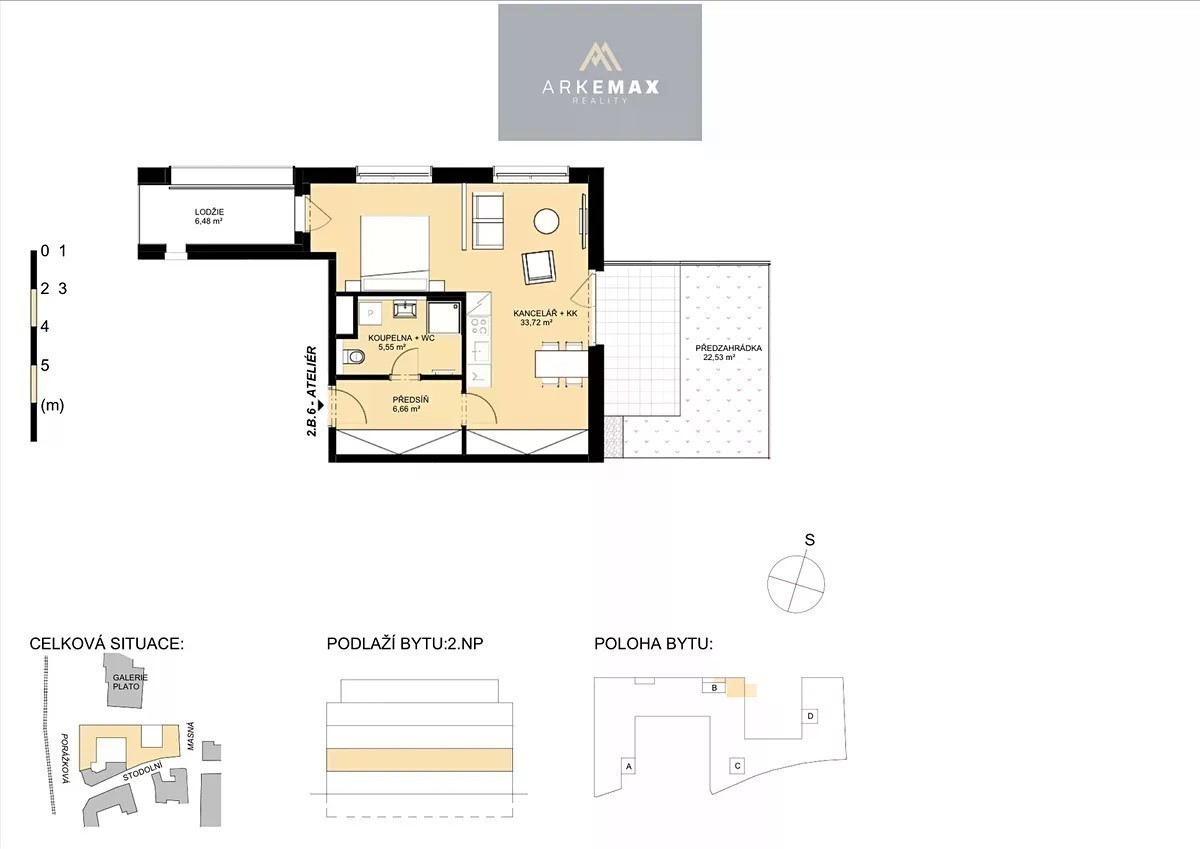 Moderní 2+kk (47,9 m²) s lodžií, předzahrádkou (22,5 m²) a parkováním - centrum Ostravy Nabízíme postoupení smluvní dokumentace k jednotce č. 2.B.6 v rámci developerského projektu Rezidence Stodolní, který vzniká v samotném centru Ostravy. Jednotka je vedena jako ateliér (2+kk) o podlahové ploše 47,91 m² a nachází se ve 2. nadzemním podlaží. Součástí jednotky je: • lodžie o ploše 6,48 m² • předzahrádka o výměře 22,53 m² (výlučné užívání) • parkovací stání č. 01.P.44 ve 2. podzemním podlaží • sklep/komora, která je umístěna přímo za parkovacím stáním (součást stání, pohodlný přístup) Moderní městské bydlení v atraktivní lokalitě s výbornou dostupností i občanskou vybaveností. Vhodné pro vlastní bydlení i jako investiční příležitost. Pokud ateliér splňuje parametry bytu (kuchyňský kout, koupelna + WC, denní osvětlení, přímé větrání) a je “obyvatelný” - některé banky jej pak akceptují jako bytový typ a lze financovat hypotékou. Cena 5.530.000Kč s dph V případě zájmu mě prosím kontaktujte pro více informací.