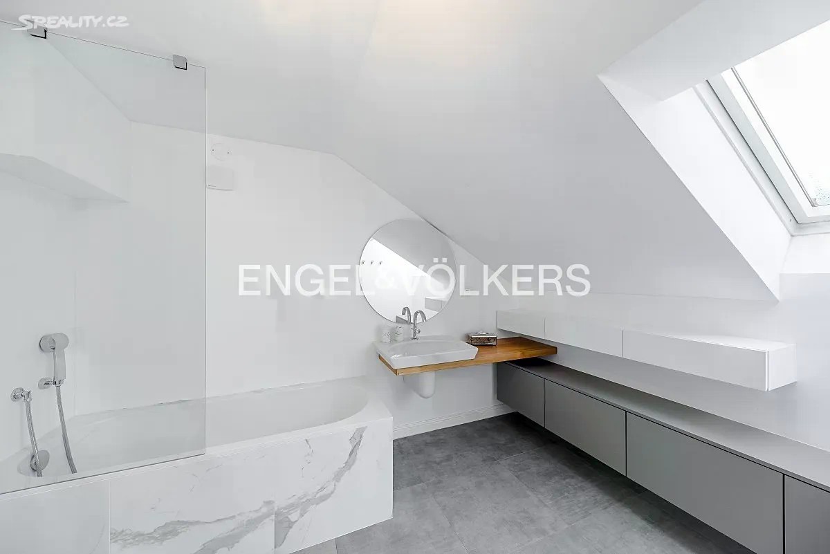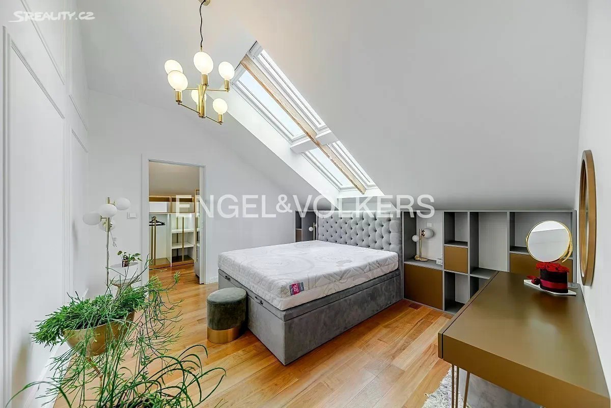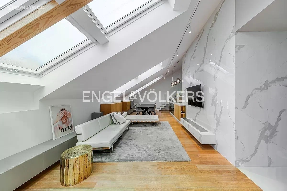 Nabízíme k pronájmu od 1. 11. 2025 zrekonstruovaný mezonetový byt situovaný v atraktivní lokalitě Prahy, ve zrekonstruovaném činžovním domě s výtahem, umístěný v pátém nadzemním podlaží. V domě se nachází recepce, neustálá security a podzemní garáže. Byt prošel nákladnou rekonstrukcí od architekta a má praktické rozvržení: Vstupní část tvoří otevřený koncept, který spojuje obývací pokoj, jídelní prostor a plně zařízenou kuchyň s elektronicky ovládaným push systémem, spotřebiče značky Siemens, vinotéku, kávovar a indukční varnou desku s integrovanou digestoří. Nachází se zde také ložnice se šatnou a vlastní koupelnou. V podkrovní části bytu je centrální koupelna a dvě ložnice s přístupem na terasu orientovanou na východ směrem do klidného vnitrobloku. V bytě jsou dvě klimatizace v dolním patře a jedna klimatizace v horním patře, přírodní materiály jako dřevo, kámen a sklo. V celém bytě je spoustu úložného prostoru s otvíráním na push system. K bytu jsou v ceně dvě parkovací stání. Poplatky spojené s užíváním bytu činí 11 500 Kč měsíčně. Elektřina se hradí zvlášť. Do poplatků bude zahrnut úklid, který bude probíhat jednou za dva měsíce.