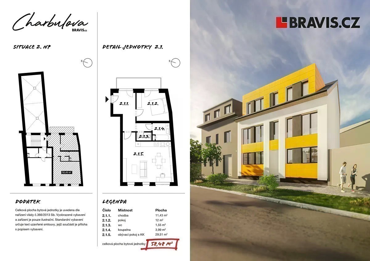 Hledáte moderní a komfortní bydlení v klidné lokalitě s dobrou dostupností do centra Brna? Ve výhradním zastoupení developera Vám představujeme developerský projekt na ulici Charbulova v městské části Černovice. Tento nový bytový dům nabízí ideální kombinaci klidného prostředí, kvalitního provedení s nízkými náklady. Byt č. 3.1 - ideální pro jednotlivce, páry i investory Nabízíme k prodeji bytovou jednotku č. 3.1 o dispozici 2+kk a užitné ploše 58m2 + 26,5m2 úložný prostor (z toho 6,5m2 s pochozí výškou 1,9m). Tento byt je perfektní volbou pro jednotlivce, mladé páry nebo jako investiční příležitost. Díky promyšlenému dispozičnímu řešení a použití kvalitních materiálů splňuje byt všechny požadavky na moderní a pohodlné bydlení. Hlavní výhody bytu a projektu • Novostavba - moderní bydlení s minimálními náklady na údržbu a nízkými provozními náklady. • Vysoký standard vybavení - plastová okna s tepelněizolačním trojsklem a 6komorovým rámem, podlahové vytápění a otopná tělesa zajišťující komfortní teplotu v každém ročním období. • Úsporné vytápění - zdrojem tepla je plynový kotel, což přispívá k efektivnímu ohřevu vody a vytápění. • Praktické dispoziční řešení - důraz na funkčnost a pohodlí, ideální pro každodenní život. • Klidná lokalita - Černovice jsou známé svou příjemnou atmosférou, zelení a výbornou dostupností do centra Brna, a to jak autem, tak MHD. Lokalita, která má co nabídnout Bytový dům se nachází v klidné části Brna, na ulici Charbulova, která je ideální pro ty, kteří hledají kombinaci klidného bydlení a snadné dostupnosti do centra města. V okolí najdete veškerou občanskou vybavenost - školy, školky, obchody, restaurace i sportovní zařízení. Lokalita je také skvěle dostupná autem i městskou hromadnou dopravou. Technické parametry projektu • Bytový dům má dvě nadzemní podlaží a obytné podkroví. • Celkem 7 bytových jednotek o dispozicích 1+kk až 2+kk. • Celková plocha pozemku: 824 m2 (z toho 594 m2 zahrada, 230 m2 zastavěná plocha a nádvoří). Zastavěná plocha domu: 207 m2. • Dokončení výstavby: IV. kvartál 2025. Proč si vybrat právě tento byt? • Moderní novostavba s nízkými provozními náklady. • Klidná a dobře dostupná lokalita. • Ideální pro vlastní bydlení i jako investice. V případě Vašeho zájmu kontaktuje uvedeného makléře. S financováním Vám rádi pomůžeme.