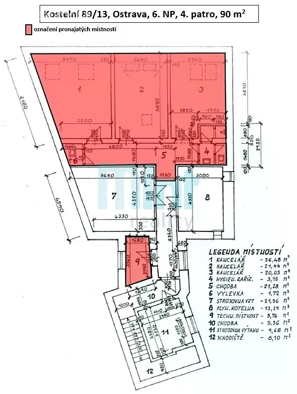 Nabízíme Vám k pronájmu prostorný byt o velikosti 3 + kk a celkové podlahové ploše 90 m², nacházející se v samotném centru Ostravy. • Bytový prostor se nachází v 6. NP budovy s výtahem a skládá se ze tří místností, z nichž jedna slouží jako obývací pokoj propojený s kuchyňským koutem. • Kuchyně je vybavena myčkou nádobí a dřezem. • Byt disponuje 2 samostatnými toaletami s umyvadlem a možností připojení pračky. Koupelna se sprchovým koutem. • Byt má také vynikající dostupnost veřejnou dopravou, díky blízkosti zastávky MHD. • V okolí se nachází veškerá občanská vybavenost a dopravní infrastruktura. Tento bytový prostor poskytuje ideální podmínky pro komfortní a moderní bydlení v srdci Ostravy. Cena nájmu činí 10.500, - Kč/měsíc, zálohy na služby činí 8.000, - Kč/měsíc. Vratná jistota činí 37.000, - Kč a administrativní poplatek RK 18.000, - Kč. V případě zájmu o prohlídku kontaktujte makléře.