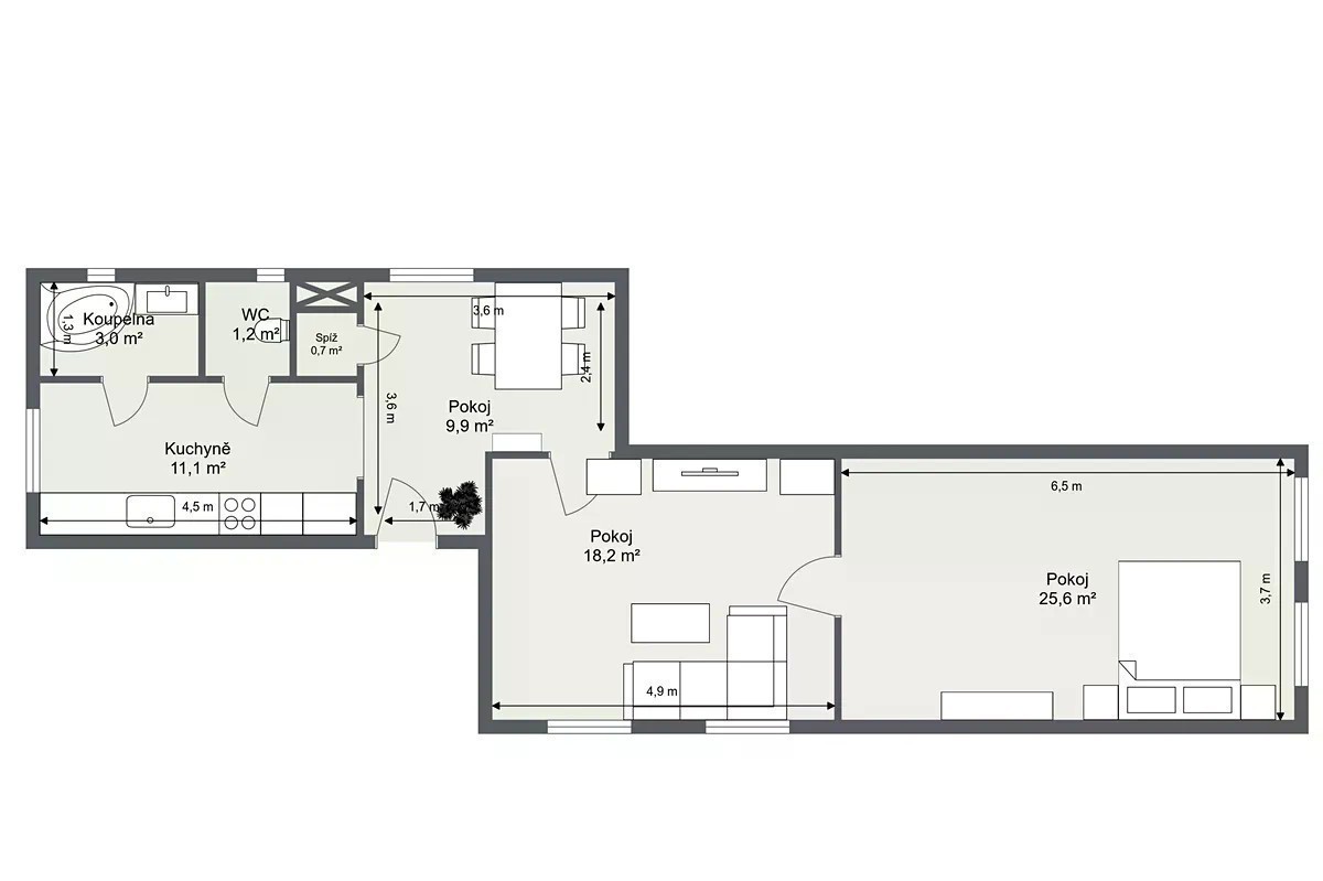 Nabízíme k prodeji byt o dispozici 3+1 a podlahové ploše 70 m², který se nachází v přízemí cihlového domu v Hradci Králové, v městské části Kukleny. Byt je v osobním vlastnictví a prošel kompletní rekonstrukcí - má nové rozvody elektřiny a vody, renovované podlahy, novou koupelnu a samostatné WC. Okna jsou plastová s trojskly, které zajišťují dobré odhlučnění i tepelný komfort. Dispozice bytu zahrnuje vstupní chodbu, samostatnou kuchyni, koupelnu, toaletu a technickou místnost s umístěním elektrokotle a bojleru. Dále jsou zde tři pokoje, přičemž dva z nich jsou vzájemně průchozí. Největší z pokojů má přes 25 m² a slouží jako hlavní obytný prostor. V jeho centrální části je dostatek místa pro jídelní kout. Další dva pokoje mohou sloužit jako ložnice, dětský pokoj, pracovna nebo pokoj pro hosty. Byt je situován u rušnější ulice, což zajišťuje velmi dobrou dopravní obslužnost a dostupnost služeb. Díky kvalitnímu zasklení je však interiér tichý. Přízemní poloha je ideální pro seniory, rodiny s malými dětmi nebo kohokoli, kdo hledá bydlení bez bariér. V okolí se nachází veškerá občanská vybavenost - školy, školky, obchody i zastávky MHD. Součástí prodeje je také spoluvlastnický podíl na dvoře, který zajišťuje vlastní parkovací místo ve vnitrobloku. Byt je ihned k dispozici a bez právních vad. V případě zájmu o prohlídku nás neváhejte kontaktovat.