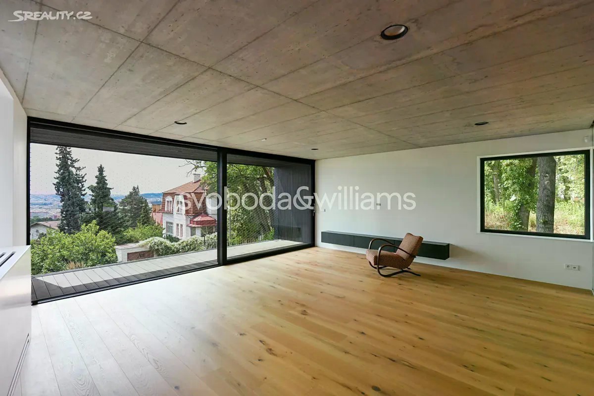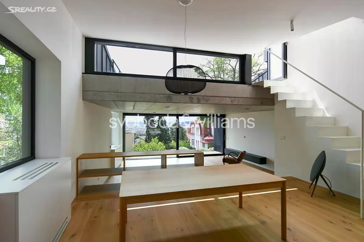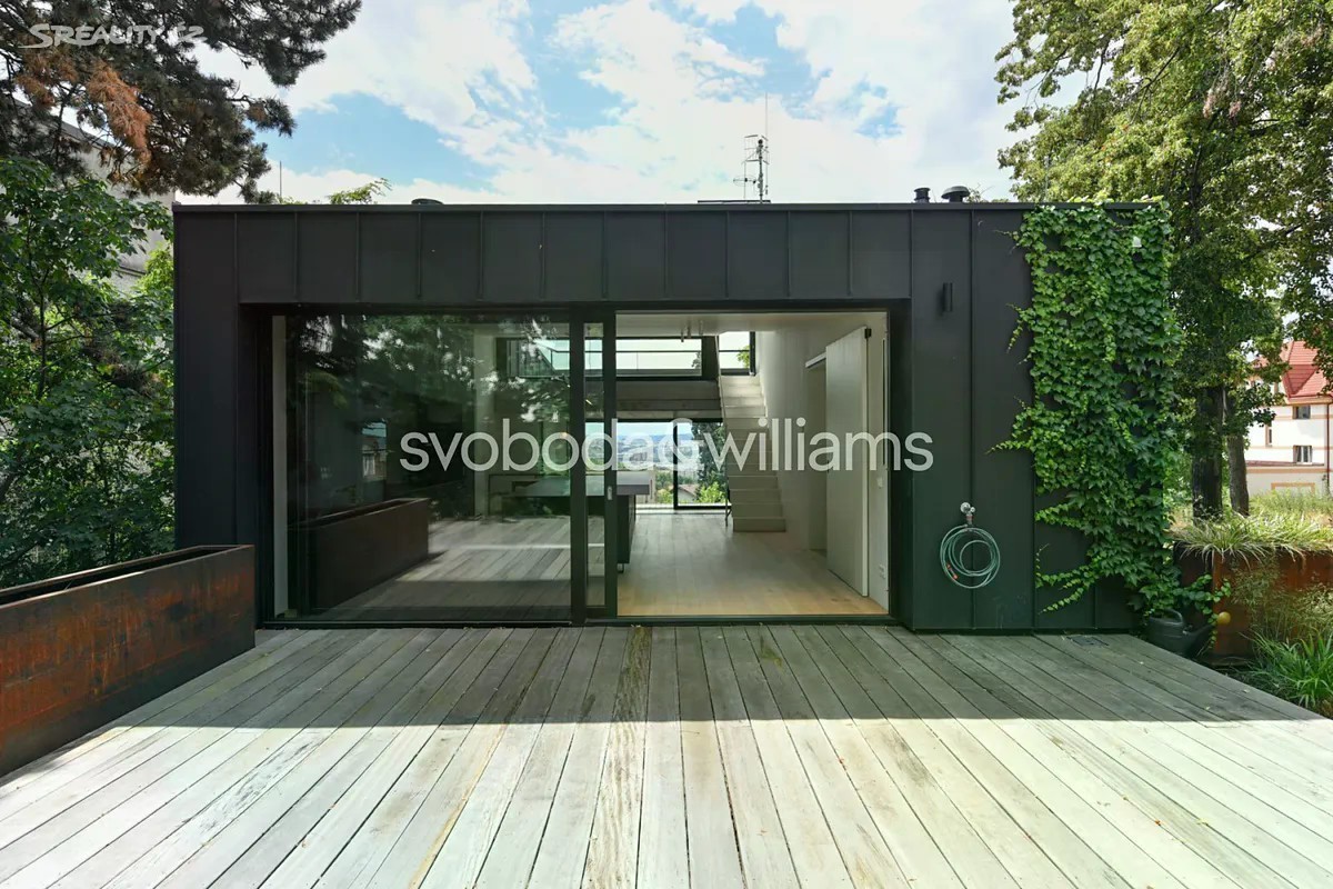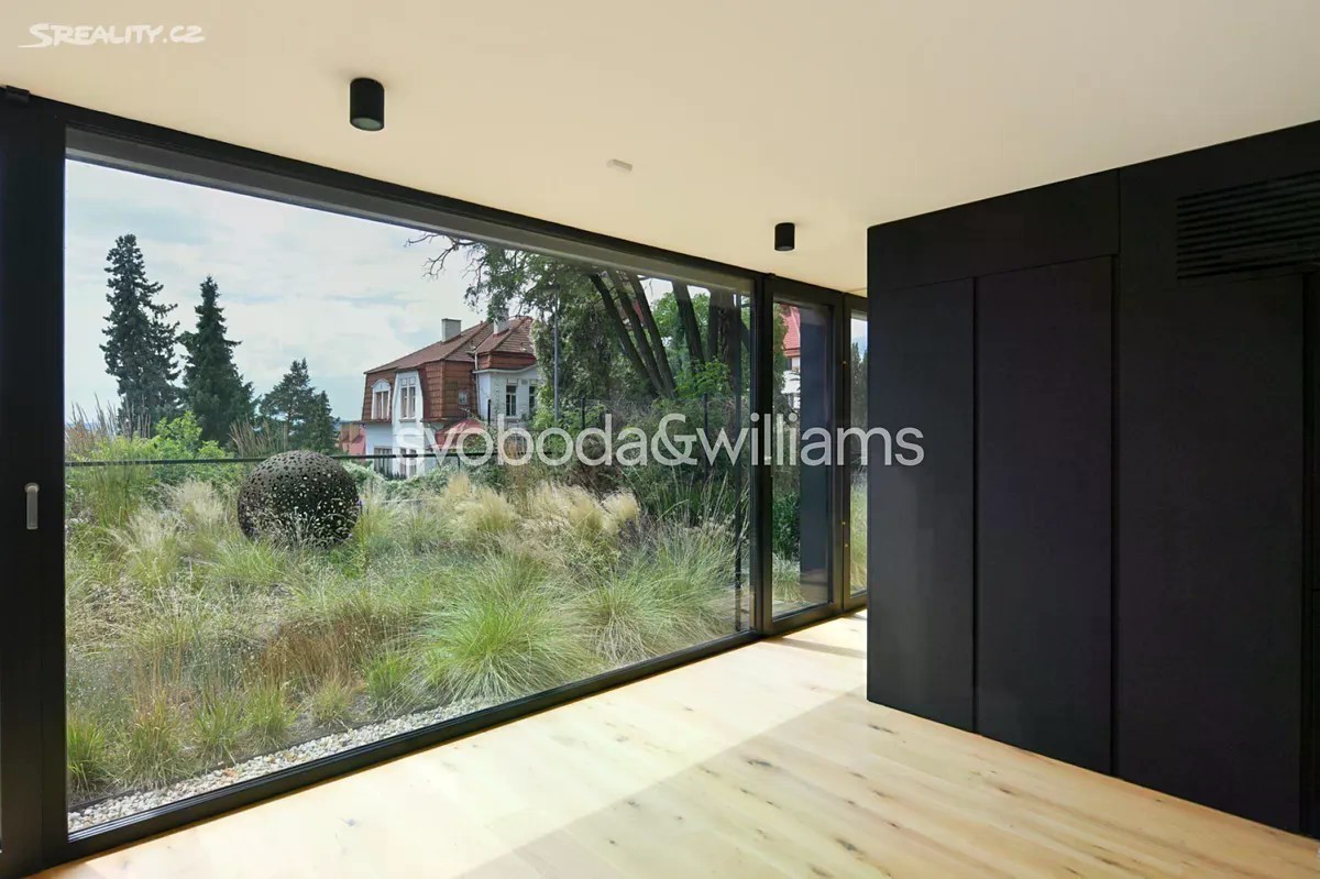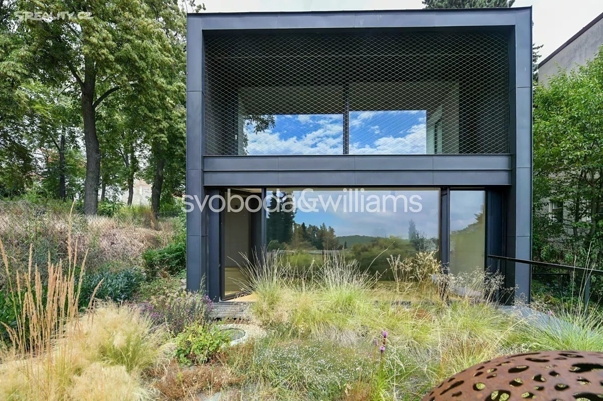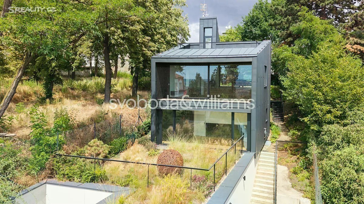 Novostavba sebevědomé vily s minimalistickým designovým interiérem, terasami poskytujícími výhledy přes centrum Prahy až do dalekého okolí, se zahradou nenáročnou na údržbu a s bezproblémovým parkováním stojí v tradiční vilové čtvrti Prahy 8 v jižním svahu nad Vltavou na rozhraní čtvrtí Libeň a Troja. První podlaží slouží jako soukromá zóna obsahující 4 ložnice, 2 koupelny (1 s vanou, 1 se sprchovým koutem, samostatnou toaletu, technickou místnost, chodbu a schodiště. Místem setkávání rodiny i přátel je 2. podlaží, kde se nachází velkolepý obytný prostor propojený třemi schůdky s jídelnou a kuchyní, na niž navazuje velká zahradní terasa. K obývacímu pokoji přiléhá lodžie poskytující působivé výhledy. Celý dům korunuje střešní terasa, která svými mnohakilometrovými výhledy ještě předčí lodžii. Suterén obsahuje garáž pro 3 vozy (stojící za sebou), jedno venkovní stání ve vjezdu, toaletu, zádveří a schodišťovou halu. Vila byla zkolaudována na konci r. 2024. Ke špičkové technologii a vybavení patří rekuperace a klimatizace zhotovené s maximálním důrazem na estetiku (skryté rozvody), velkoplošná okna s předokenními kovovými žaluziemi ovládanými přes aplikaci, vestavný nábytek a kuchyně dle autorského návrhu renomovaného architektonického studia, kuchyňské spotřebiče Miele, designová svítidla vyrobená na zakázku. V celém domě je podlahové vytápění (zdroj tepla plynový kotel Geminox), dům střeží zabezpečovací systém Jablotron. Hlavní terasa je pokryta přírodními fošnami z exotického mahagonu dovezeného z Libérie, pod terasou je skryta příprava na bazén (3 x 7 m) a technickou místnost. Zahrada byla založena dle návrhu úspěšného brněnského studia a skladba rostlin je pojata tak, aby nevyžadovala pravidelnou automatickou závlahu. Moderní stavba je zasazena do boční ulice, přibližně 5 minut chůze od stanice metra Kobylisy a tramvajových zastávek, cesty autem usnadňuje nedaleký tunelový komplex a nájezdy na dálnice D8 a D10. V okolí nebo krátké dojezdové vzdálenosti je vše potřebné, v pěším dosahu jsou kavárny, restaurace, obchody, lékárna, mateřská i základní škola, četná sportovní centra včetně koupaliště. Oblast vyniká množstvím zeleně, blízko je lesopark Okrouhlík, park Dlážděnka, daleko není ani do Ďáblického háje nebo rozlehlého přírodního parku Drahaň-Troja, jehož součástí je i botanická a zoologická zahrada. Celková plocha 356,1 m2, zastavěná plocha 173 m2, zahrada 295 m2, pozemek 468 m2.