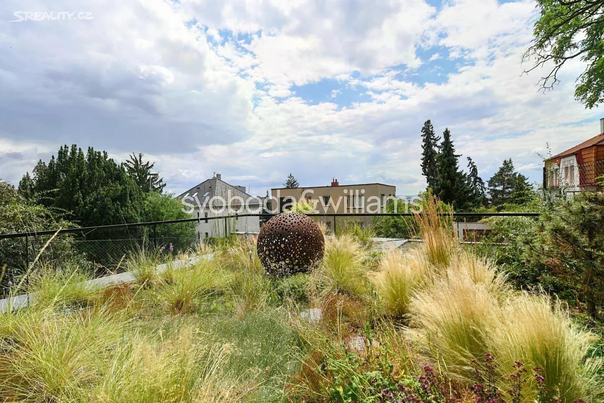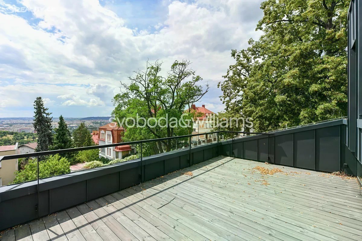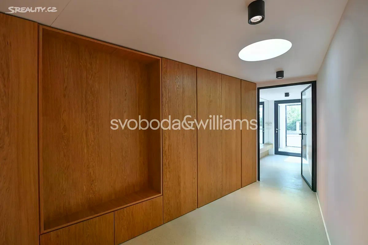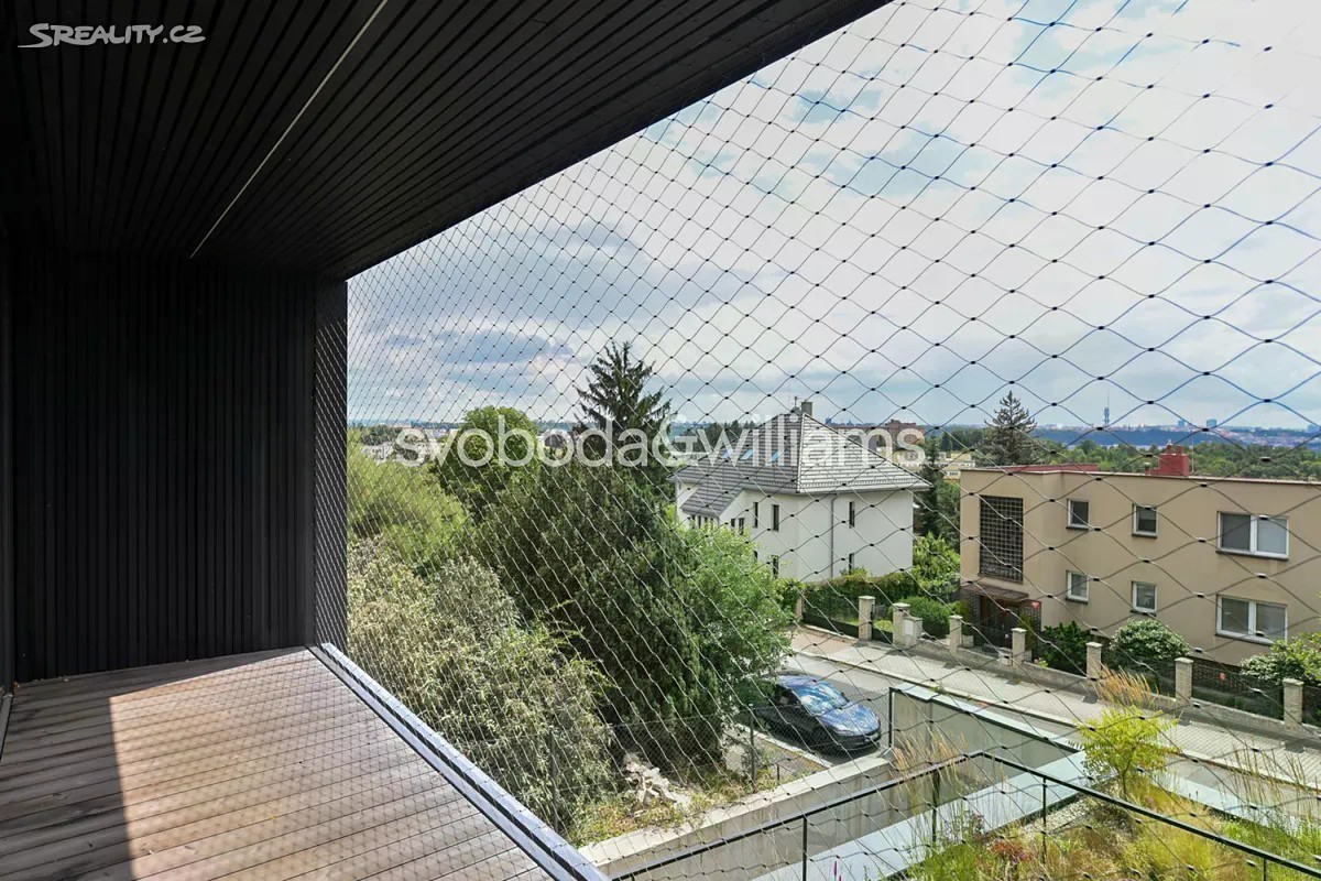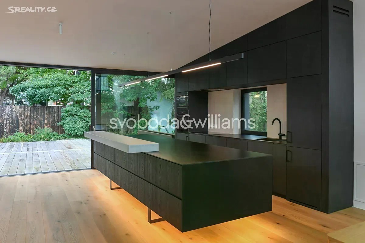 Novostavba sebevědomé vily s minimalistickým designovým interiérem, terasami poskytujícími výhledy přes centrum Prahy až do dalekého okolí, se zahradou nenáročnou na údržbu a s bezproblémovým parkováním stojí v tradiční vilové čtvrti Prahy 8 v jižním svahu nad Vltavou na rozhraní čtvrtí Libeň a Troja. První podlaží slouží jako soukromá zóna obsahující 4 ložnice, 2 koupelny (1 s vanou, 1 se sprchovým koutem, samostatnou toaletu, technickou místnost, chodbu a schodiště. Místem setkávání rodiny i přátel je 2. podlaží, kde se nachází velkolepý obytný prostor propojený třemi schůdky s jídelnou a kuchyní, na niž navazuje velká zahradní terasa. K obývacímu pokoji přiléhá lodžie poskytující působivé výhledy. Celý dům korunuje střešní terasa, která svými mnohakilometrovými výhledy ještě předčí lodžii. Suterén obsahuje garáž pro 3 vozy (stojící za sebou), jedno venkovní stání ve vjezdu, toaletu, zádveří a schodišťovou halu. Vila byla zkolaudována na konci r. 2024. Ke špičkové technologii a vybavení patří rekuperace a klimatizace zhotovené s maximálním důrazem na estetiku (skryté rozvody), velkoplošná okna s předokenními kovovými žaluziemi ovládanými přes aplikaci, vestavný nábytek a kuchyně dle autorského návrhu renomovaného architektonického studia, kuchyňské spotřebiče Miele, designová svítidla vyrobená na zakázku. V celém domě je podlahové vytápění (zdroj tepla plynový kotel Geminox), dům střeží zabezpečovací systém Jablotron. Hlavní terasa je pokryta přírodními fošnami z exotického mahagonu dovezeného z Libérie, pod terasou je skryta příprava na bazén (3 x 7 m) a technickou místnost. Zahrada byla založena dle návrhu úspěšného brněnského studia a skladba rostlin je pojata tak, aby nevyžadovala pravidelnou automatickou závlahu. Moderní stavba je zasazena do boční ulice, přibližně 5 minut chůze od stanice metra Kobylisy a tramvajových zastávek, cesty autem usnadňuje nedaleký tunelový komplex a nájezdy na dálnice D8 a D10. V okolí nebo krátké dojezdové vzdálenosti je vše potřebné, v pěším dosahu jsou kavárny, restaurace, obchody, lékárna, mateřská i základní škola, četná sportovní centra včetně koupaliště. Oblast vyniká množstvím zeleně, blízko je lesopark Okrouhlík, park Dlážděnka, daleko není ani do Ďáblického háje nebo rozlehlého přírodního parku Drahaň-Troja, jehož součástí je i botanická a zoologická zahrada. Celková plocha 356,1 m2, zastavěná plocha 173 m2, zahrada 295 m2, pozemek 468 m2.