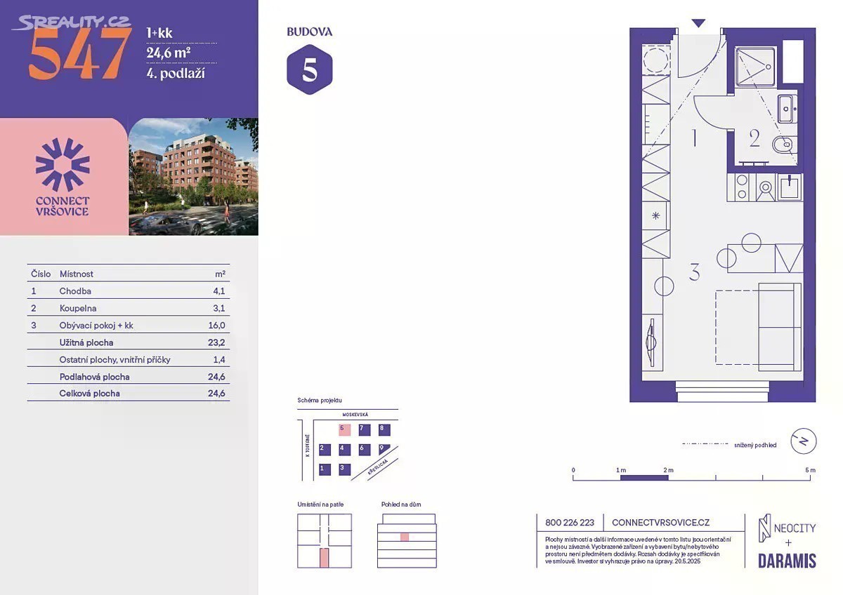 Prodej bytu 1+kk v novostavbě s nadstandardním vybavením a službami pro rezidenty Nabízíme k prodeji moderní byt 1+kk v exkluzivním projektu Connect Vršovice, který kombinuje komfort, design a špičkové vybavení. Tento byt je ideální volbou pro ty, kteří hledají kvalitní bydlení s veškerým zázemím a službami přímo v domě. Byt má dispozici 1+kk, tedy obývací pokoj s kuchyňským koutem a ložnici. Jedná se o novostavbu, byt bude k nastěhování 06/2028. Standard vybavení zahrnuje stropní chlazení, které je již zahrnuté v ceně bytu. Dále jsou zde venkovní žaluzie, dřevěná okna s trojsklem pro maximální tepelnou i zvukovou izolaci, rekuperace vzduchu a nadstandardní výška stropů obytných místností, která se pohybuje od 2,8 do 3,0 metrů dle podlaží. Koupelny jsou vybaveny velkoformátovými obklady o rozměru 120×60 cm. Součástí projektu je centrální recepce. V druhém podzemním podlaží najdete řadu služeb, které zpříjemní a usnadní váš každodenní život. Patří sem moderní a plně vybavené fitness, kino pro soukromé projekce, dětská herna pro nejmenší a další společné prostory a zázemí určené výhradně pro rezidenty. Byt se nachází v atraktivní lokalitě s výbornou dostupností MHD. V blízkosti jsou obchody, restaurace, školy a parky. Klidné prostředí s veškerou občanskou vybaveností je ideální pro pohodlné a kvalitní bydlení.