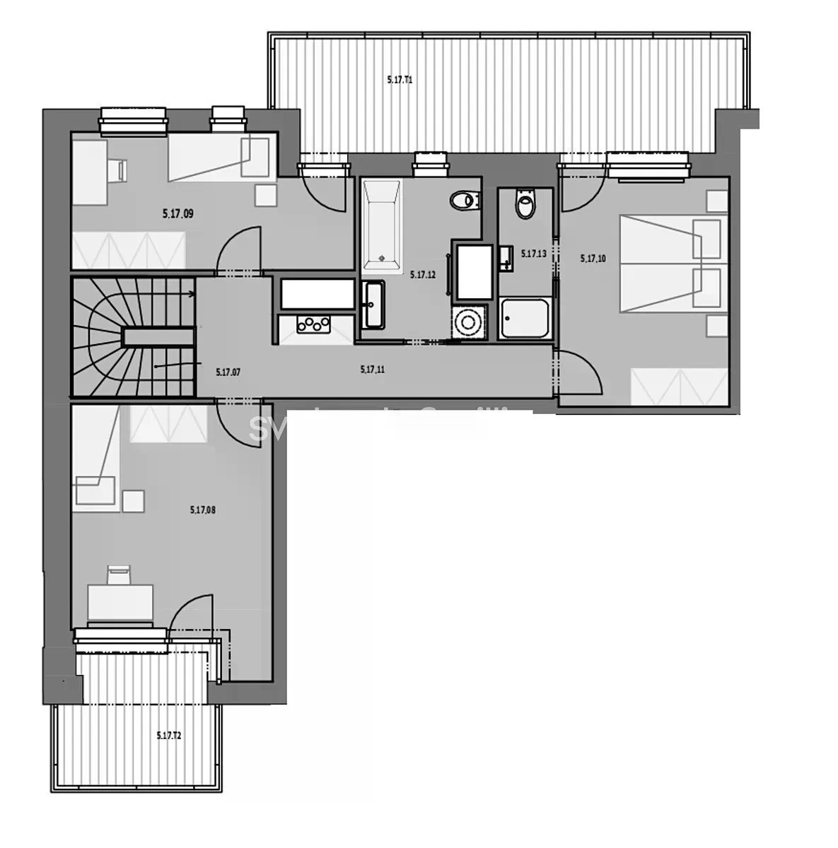 Neuvěřitelně prostorný nový mezonetový byt se dvěma lodžiemi a dvěma terasami poskytujícími výhledy do zeleně je součástí nástavby bytového domu s výtahem a zahradou v Praze - Hostivaři blízko lesoparku i golfového hřiště. V dolní části bytu (5. NP) se rozkládá otevřená společenská zóna s prostorem pro kuchyni, jídelnu a obývací pokoj. Plochu doplňuje předsíň a samostatná toaleta. Na interiér navazují 2 lodžie. Horní podlaží tvoří privátní zónu, kde je hlavní ložnice s en-suite koupelnou (sprchový kout, WC, umyvadlo), další 2 ložnice, centrální koupelna (vana, umyvadlo, WC, přípojka na pračku a sušičku) a schodišťová chodba. Ze všech ložnic vede vstup na jednu ze dvou teras. Aktuální dispozice je 4+kk, v případě uzavření prostoru možné jídelny může vzniknout další pokoj a tedy dispozice 5+kk. Byt je po nedávné kolaudaci. Má dřevěné lamelové podlahy, velkoformátové obklady a dlažby, plastová okna s izolačními trojskly a vnějšími roletami, vstupní dveře bezpečnostní třídy 3, obložkové bezfalcové interiérové dveře, rekuperační jednotku pro úsporu energií a automatický přísun čerstvého vzduchu, vytápění plynovým kotlem Brötje. Jednotlivé byty jsou odděleny příčkami s akustickou izolací. Dům má novou fasádu a výtah, obyvatelům je k dispozici společná zahrada. Kupní cena zahrnuje 2 venkovní vyhrazená parkovací stání. Výhodná poloha umožňuje mít v pohodlném dosahu vše potřebné, v okolí fungují mateřské a základní školy i gymnázium, obchody včetně nákupního centra, sportoviště i restaurace. Výborné dopravní spojení zajišťují tramvaje a vlaky z blízké zastávky, cesty autem usnadňuje nedaleký Městský okruh. Oblast zpříjemňuje spousta zeleně, blízko se rozprostírá oblíbený lesopark Hostivař nebo přírodní památka Meandry Botiče, 3 minuty autem je areál Galerie Golf Hostivař. Vizualizace mají informativní charakter. Podlahová plocha 144,1 m2, terasy 17,8 m2 a 6,9 m2, lodžie 6,9 m2 a 7,1 m2.