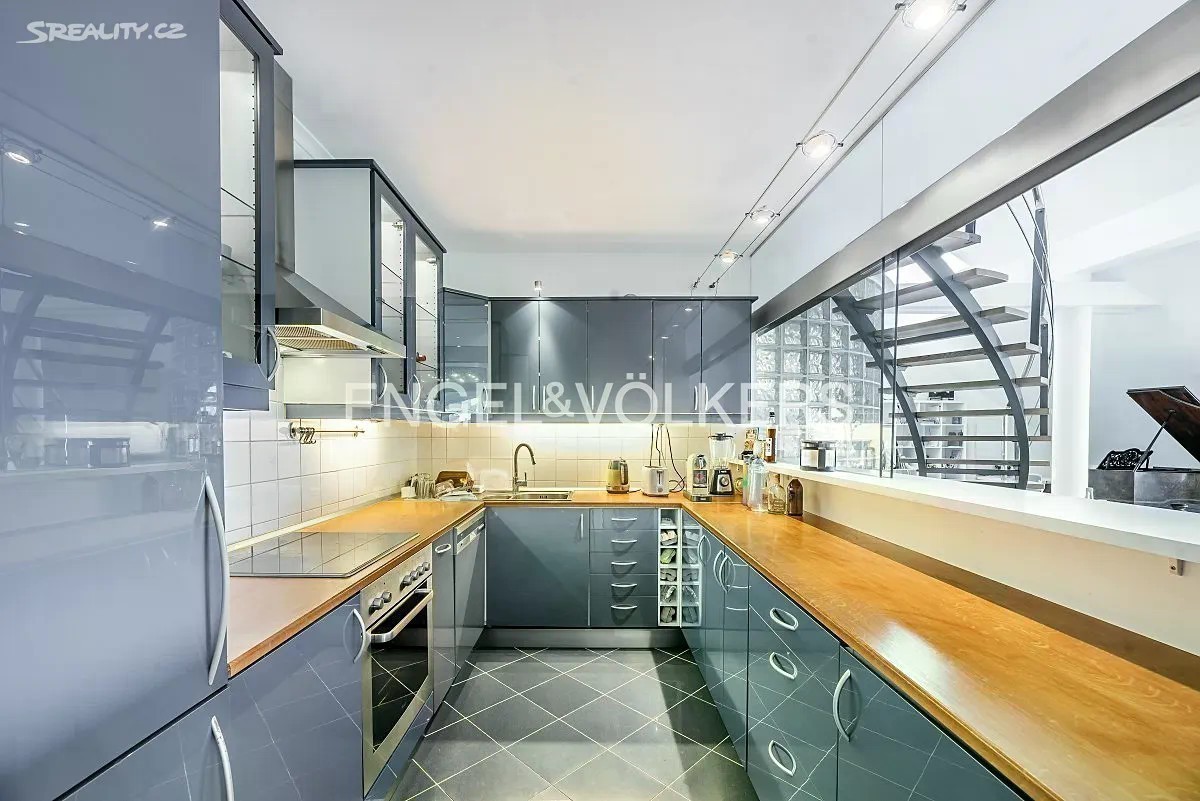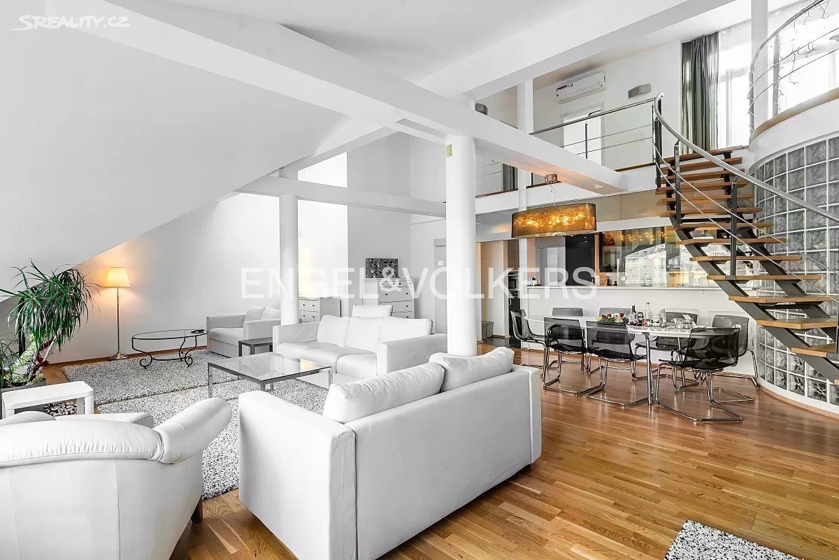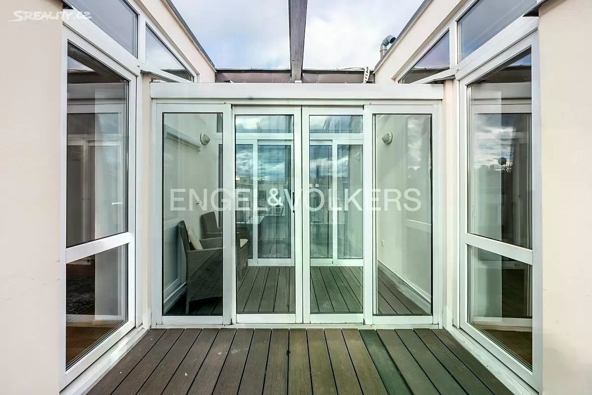 Moderní a vzdušný mezonet situovaný v nejvyšším podlaží historického činžovního domu na Rašínově nábřeží poskytující nepopsatelné výhledy na Vltavu a Hradčany. Díky velkým proskleným plochám je apartmán velmi světlý. Srdcem bytu je prostorný obývací pokoj propojený s galerií ve vyšším podlaží. Kuchyně je oddělená a kompletně zařízená vestavěnými spotřebiči. Apartmán má 4 ložnice, z nichž 3 jsou situovány v patře, v klidové zóně mezonetu. Tři koupelny, každá s vanou sprchovým koutem a bidetem. Terasa je orientovaná do klidného vnitrobloku a navazuje na zimní zahradu. Dřevěná podlaha, kvalitní dřevěná okna, dlažba. V domě je výtah. K bytu náleží jedno parkovací místo v garáži. Byt se pronajímá kompletně vybavený.