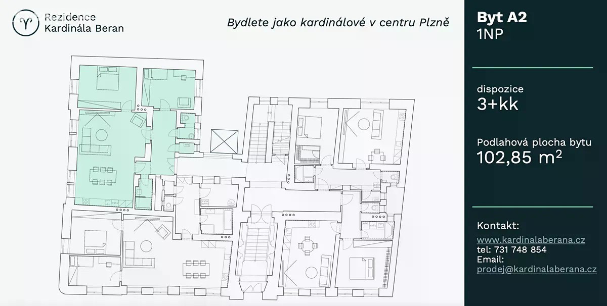 Nabízíme k prodeji elegantní byt 3+kk (možný dispozičně upravit také jako 4+kk) o podlahové ploše 100 m², situovaný v 1. nadzemním podlaží projektu Rezidence Kardinála Berana, oceněného tituly Realitní projekt roku Plzeňského kraje - cenou architektů, poroty i veřejnosti. Tento moderní developerský projekt se nachází v docházkové vzdálenosti od historického centra Plzně i Bezručových sadů v rezidenční lokalitě s kompletní občanskou vybaveností - zastávka MHD Náměstí Míru je doslova za rohem. Dispozice bytu zahrnují prostorný obývací pokoj s přípravou na kuchyňskou linku, 2-3 ložnice, komoru, koupelnu a samostatné WC. Okna jsou orientována do klidné jednosměrné ulice, což zaručuje maximální soukromí a ticho i v centru města. Projekt propojuje historický charakter budovy s moderním komfortem. Zachována byla původní vzdušnost a prostornost, historická fasáda pak byla plně renovována a doplněna o nové technologie a energeticky efektivní řešení - např. zateplení fasády a střechy, velká nová okna s trojsklem nebo dálkové vytápění a ohřev vody. Standard všech bytových jednotek obsahuje nová okna s izolačním trojsklem, kvalitní laminátové podlahy ve dubovém dřevo dekoru či luxusní koupelny se sanitou Geberit a Grohe. Aktuálně nabízíme možnost koupě s výhodnými podmínkami - nyní zaplatíte pouze 10 % kupní ceny, zbytek až po dokončení stavby v 1. kvartálu 2026. Rezidence Kardinála Berana je ideální volbou pro ty, kteří hledají stylové a kvalitní bydlení v Plzni s vynikající dopravní dostupností i službami v blízkém okolí. Pro více informací o bytové jednotce nebo celém projektu nás neváhejte kontaktovat. Rádi vám zajistíme osobní prohlídku i pomoc s financováním.