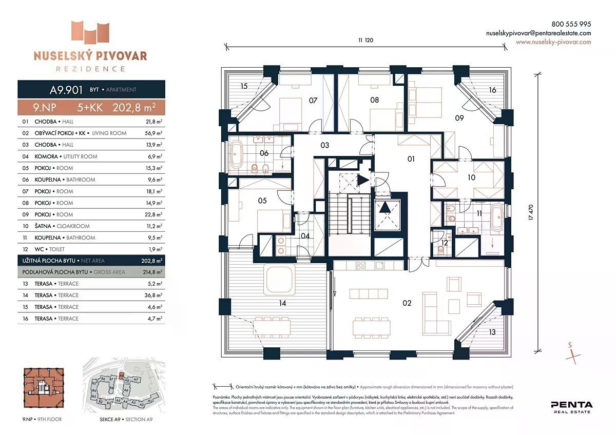 Nový byt č. A9.901 o dispozici 5+kk (202,8 m2) se čtyřmi terasami (5,2 m2, 36,8 m2, 4,6 m2 a 4,7 m2) se nachází v 9. nadzemním podlaží budovy A9 v projektu Rezidence Nuselský pivovar. Provedení bytu ve vysokém standardu Premium nabízí např. celoplošně lepenou dřevěnou podlahu v obytných místnostech, lakované nebo dýhované interiérové dveře, koupelnu s velkoformátovými keramickými obklady a prémiovými zařizovacími předměty. Součástí vybavení koupelny je také elektrické podlahové přitápění a žebříčkový radiátor. Byt je dále vybaven podlahovým topením, klimatizací, dřevěnými EURO okny s izolačním trojsklem a předokenními elektrickými žaluziemi. K bytu je nutné zakoupit garážové stání (GS) a parkovací stání (PS), jejichž ceny nejsou obsaženy v ceně bytu. Cena garážového stání je 1 815 000 Kč včetně DPH. Cena parkovacího stání činí 605 000 Kč včetně DPH. Developerský projekt Nuselský pivovar od společnosti Penta Real Estate se nachází na úpatí Vinohrad v areálu bývalého pivovaru. Celé území na ploše téměř 32 tisíc m2 prošlo citlivou revitalizací. Vyrostlo zde více než 400 nových bytů v nové rezidenční výstavbě a zrekonstruovaném historickém pivovaru. Moderní prostory určené pro obchody a služby jsou k dispozici nejen v rámci rekonstrukce historického pivovaru, ale i v přízemních podlažích rezidenčních domů v těsné blízkosti pěší zóny a pivovarského náměstí. Obchodní pasáž, procházející historickou budovou, nově propojí Křesomyslovu ulici s klidným pivovarským náměstím bez ruchu dopravy, a nabídne široké spektrum služeb. Byty jsou dokončené a připravené k nastěhování ihned. Více informací o projektu a lokalitě naleznete na našich webových stránkách projektu.