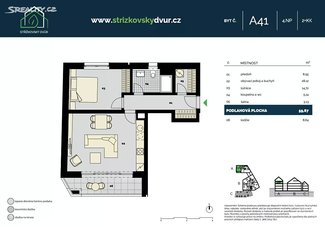 Garážové stání a sklep v ceně bytu! Nabízíme k prodeji světlý a moderně řešený byt 2+kk o velkorysé užitné ploše 60 m², situovaný v prestižním rezidenčním projektu Střížkovský dvůr. Nachází se v jedinečně klidné části Prahy 8 - Střížkov/Prosek, avšak s veškerou občanskou vybaveností a stanicí metra C 'Střížkov' v pohodlné docházkové vzdálenosti (jen 5 minut). O Projektu Střížkovský dvůr: Tento komorní projekt tří citlivě propojených rezidenčních budov (celkem 34 bytů od 1+kk po mezonetové 3+kk s galerií) harmonicky navazuje na původní střížkovskou zástavbu. Architektura v moderním minimalistickém stylu čerpá inspiraci z přírody, klade důraz na nadčasovost a trvalou hodnotu. • Vysoký standard: Celý projekt, který je již ve výstavbě, bude od základu proveden ve vysokém standardu - těšit se můžete na dřevěné podlahy, elegantní dřevěná okna a velkoformátové obklady v koupelnách. • Komfort a soukromí: Přízemní byty nabízejí soukromé předzahrádky, vybrané jednotky ve vyšších patrech zase lodžie nebo terasy. Pro každý byt je k dispozici možnost dokoupení parkovacího stání a sklepa. Některé byty v horních patrech nabídnou atraktivní výhledy na panorama Prahy a nadstandardní výšku stropů otevřených do krovu. • Dokončení: Předpokládaný termín kolaudace je stanoven na listopad 2025. Lokalita snů - Klid, zeleň a skvělá dostupnost: Střížkovský dvůr se nachází v horní části Střížkovské ulice, na rozhraní starého Střížkova a nového Proseku. • Doprava: Stanice metra C 'Střížkov' je vzdálena jen cca 300 metrů. Autem se během pár minut napojíte na ulici Liberecká, městský okruh, tunel Blanka i dálnice D8, D10 a D11. • Občanská vybavenost: V okolí naleznete vše potřebné: obchody, restaurace, kavárny, mateřské, základní i střední školy (včetně sousedícího Gymnázia Thomase Manna a nedalekého Gymnázia Litoměřická), Polikliniku Prosek i Nemocnici Bulovka. • Příroda a volný čas: V bezprostřední blízkosti je park s dětským hřištěm a kavárnou. Kousek dál najdete rozlehlý Park Přátelství, Prosecké skály s vyhlídkou Emy Destinové, vinici Máchalka, park Podvinný či lesopark Ládví s hvězdárnou. Najděte svůj nový domov ve Střížkovském dvoře! Tento byt představuje ideální volbu pro jednotlivce, páry i malé rodiny, kteří hledají kvalitní, moderní bydlení s vynikající dostupností, kompletní občanskou vybaveností a přírodou na dosah ruky. Nenechte si ujít šanci stát se součástí tohoto výjimečného projektu. Pro více informací, zaslání podrobných materiálů nebo domluvení osobní prezentace projektu nás neváhejte kontaktovat. Těšíme se na váš zájem! Váš tým Střížkovský dvůr.