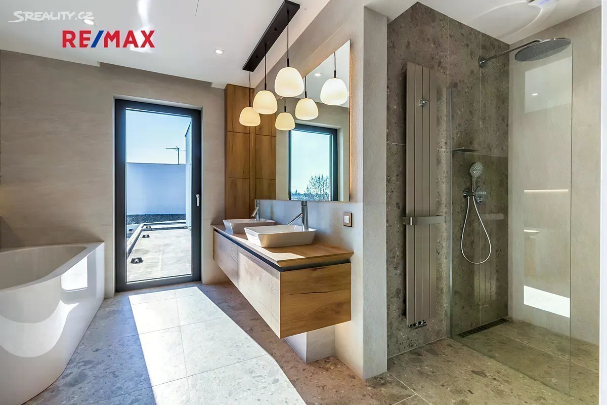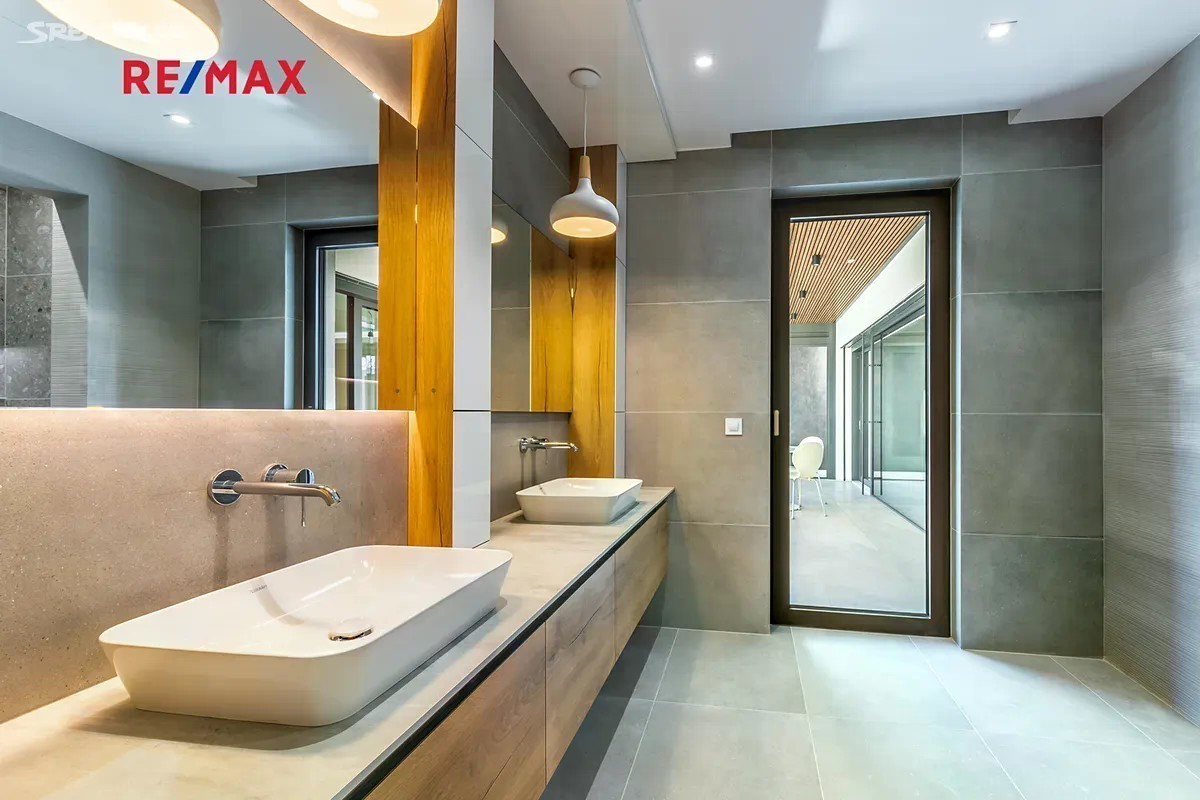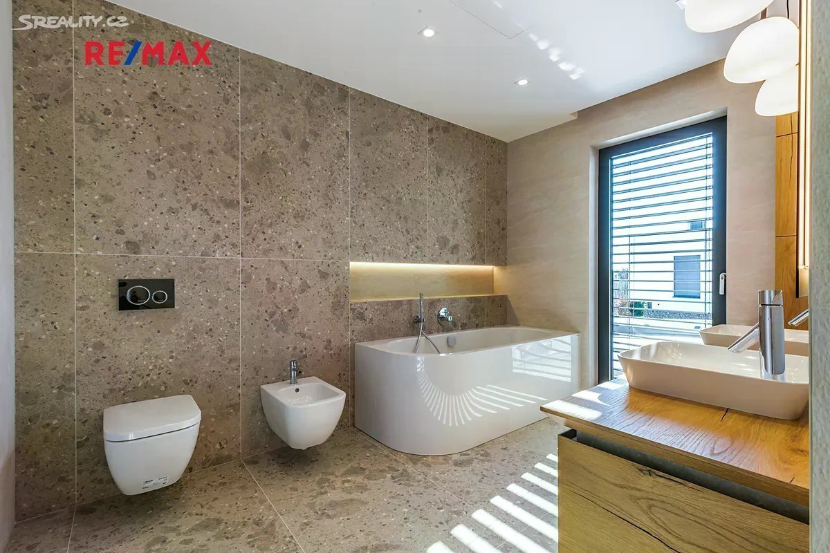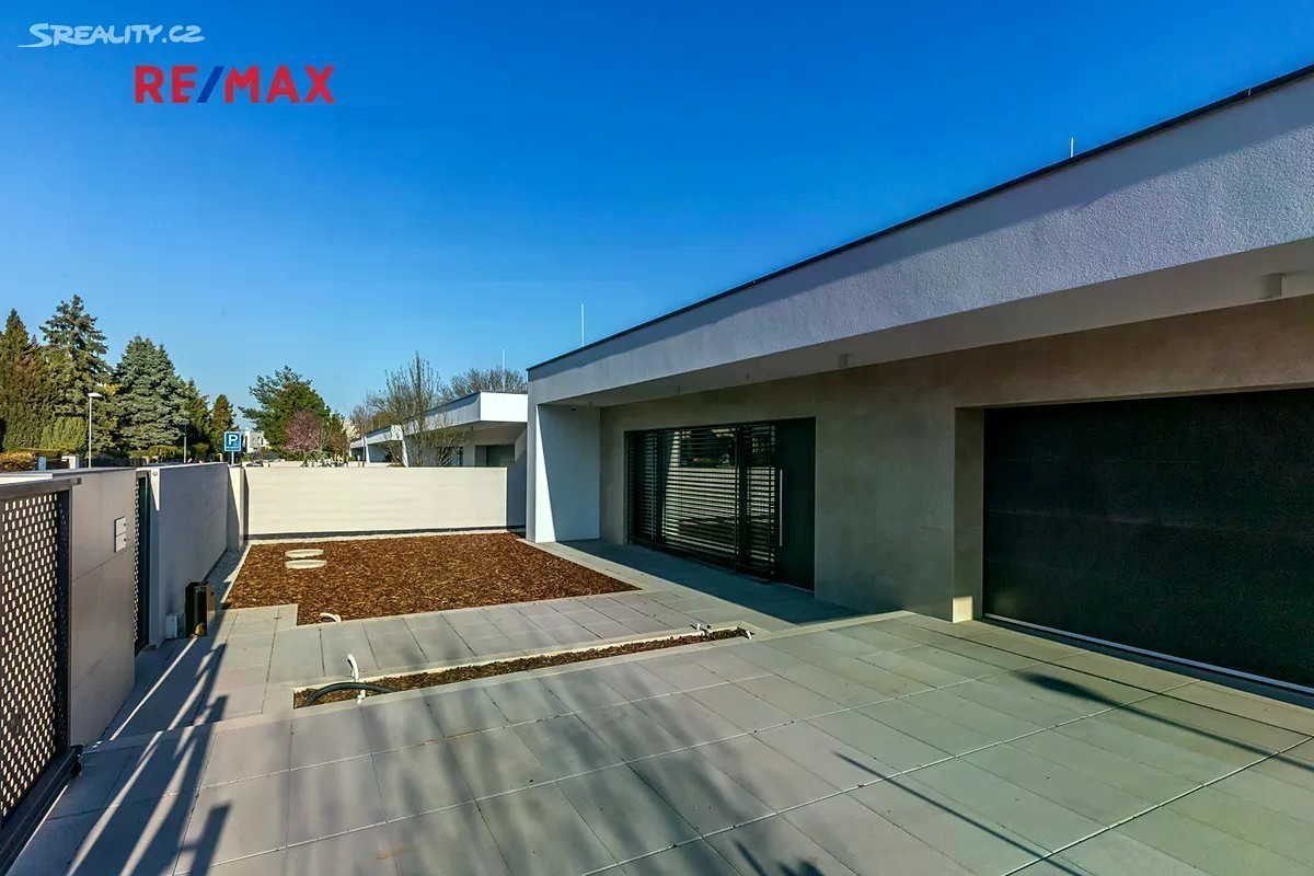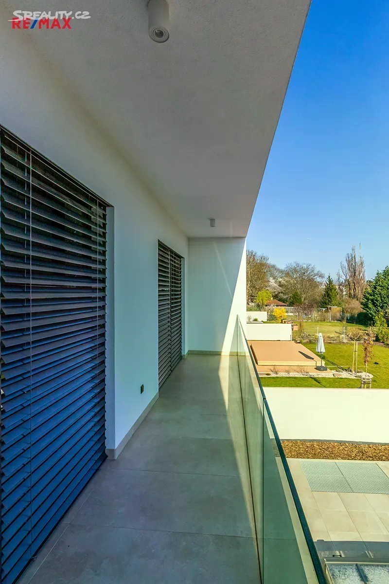 Dovolujeme si vám nabídnout mimořádnou, nadčasovou rodinnou vilu postavenou ve funkcionalistickém stylu. Do prodeje nyní majitel uvolňuje již poslední vilu, která má dispozici 7+kk, celkovou užitnou plochu 334m2 + 37m2 zimní zahrada. Vila je umístěna na hranici mírně svažitého pozemku s ideální jižní orientací. Ve vstupním patře se nachází reprezentativní vstupní hala, 3x ložnice, 2x koupelna, 2x šatna. Přízemí domu tvoří velkorysý obývací prostor (70m2) s krbem a kuchyňský koutem, dvě ložnice, koupelna, šatna, wc. Kromě velkoformátových posuvných okenních stěn přivádí do prostoru denní světlo i světlovody v kombinaci s osvětlením. Na obývací pokoj přímo navazuje venkovní terasa 37m2, zastřešená el. ovládanou skleněnou pergolou a dálkově ovládaným systémem zastínění. Terasu lze alternativně úplně uzavřít a vytvořit z ní pasivní zimní zahradu, díky systému posuvných skel. Na terase je příprava na připojení televize a přípojná místa pro venkovní kuchyni. Dům se nabízí dokončený. Podlahy dřevěné dubové se skrytými soklovými lištami, velkoformátové obklady a dlažby, integrovaná světla, kvalitní sanita a zařízení koupelen, interiérové dveře se skrytým zárubněmi. Součástí dodávky je i kuchyňská linka se spotřebiči Siemend. Novému majiteli zbývá pouze dokončit zahradní úpravy. Samozřejmostí vybavení domu je centrální vysavač, videotelefon pro každé patro, sekčně řešené bezpečnostní zařízení, kamerový systém. Do domu je zaveden optický kabel. Ve všech místnostech jsou datové rozvody, rozvody TV antény a satelitu. Jedná se o novostavbu, kde byly využity ty nejmodernější materiály a technologie. Konstrukce domu je skeletová, systém Goldbeck, okna bezpečnostní s trojskly, hliníkové profily od prestižního výrobce Schuco. Na oknech jsou předokenní žaluzie, dálkově ovládané s větrným čidlem. Vytápění, chlazení objektu i ohřev teplé vody zajišťuje tepelné čerpadlo Nibe. Topení podlahové s centrálním termostatem. Všechny jižně orientované prostory jsou klimatizované, řídící jednotka je umístěna střeše domu. Součástí dodávky je také venkovní bazén (6x3m) se zastřešením a technologií Desjoyaux. Bazén je vybaven protiproudem, osvětlením, s možností využití technologie slané vody a vytápěním tepelným čerpadlem. Celková výměra pozemku 1021m2. Pozemek je oplocený, v dolní části zahrady je možnost příjezdu z vedlejší zpevněné komunikace (149m2), která je součástí prodeje s spolu s touto nemovitostí. Na zahradu vede venkovní schodiště postavené mimo dům. Na zahradě je příprava pro umístění zahradního domku, s možností připojení na vodovod, kanalizaci i elektřinu, rozvod automatické závlahy. Lokalita Slivenec je oblíbená, s dobrou dostupností na MHD (autobus a tramvaj). V místě je skvělá občanská vybavenost - MŠ, ZŠ, supermarket, pošta, restaurace, několik obchodů, vyhlášené řeznictví, tenisové a fotbalové hřiště. Velkou výhodou je sousedství s Radotínsko-Chuchelským hájem či Prokopským údolím, poskytujícím neomezené možnosti rekreace a relaxace.