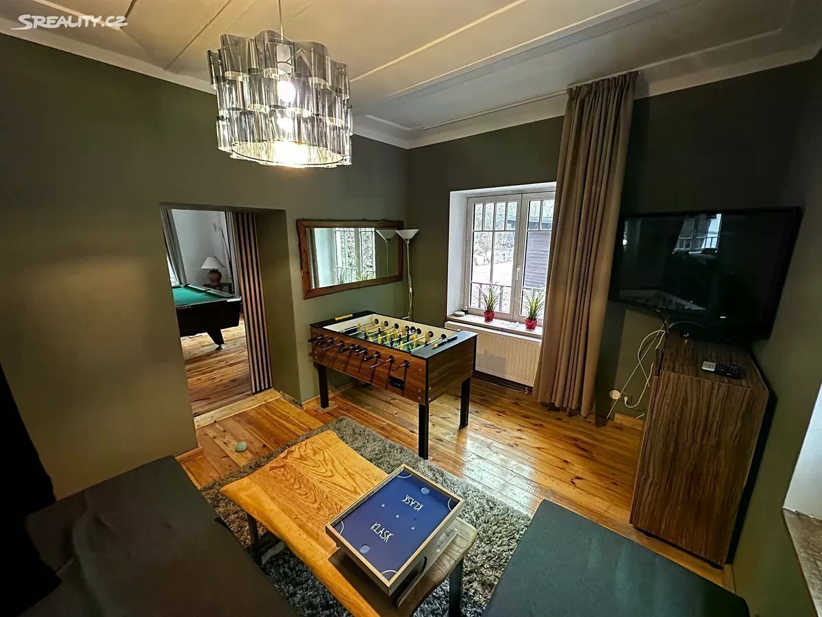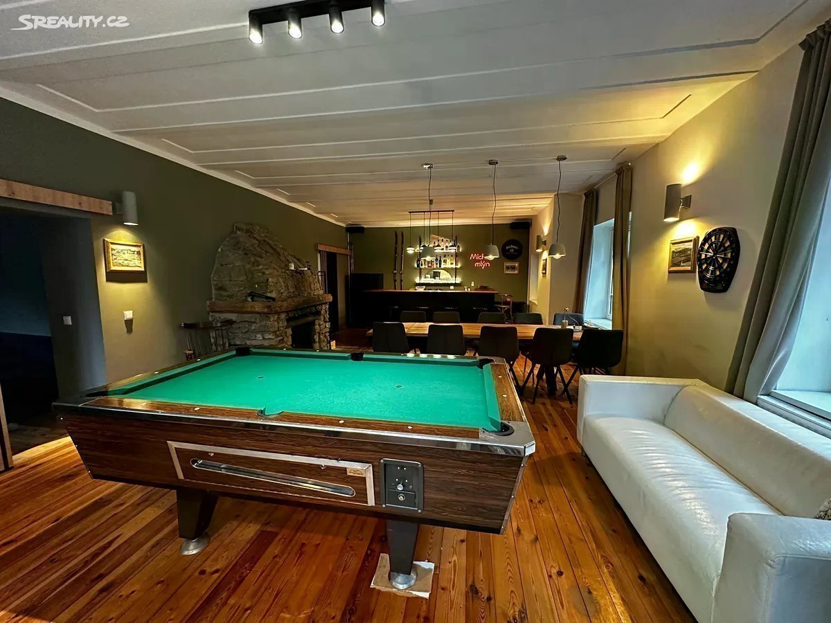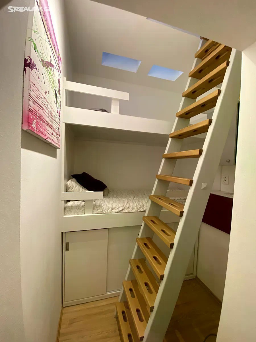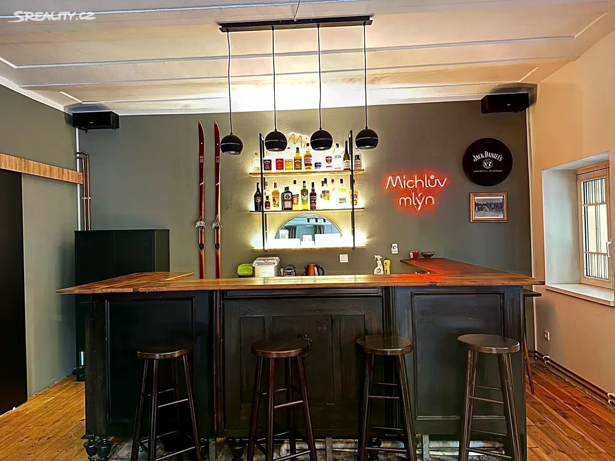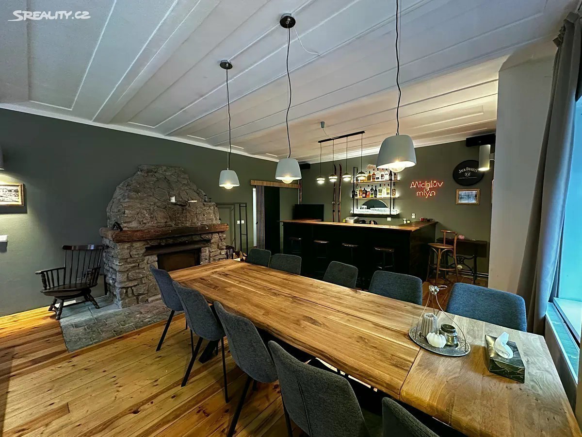 Jedinečný podkrovní byt s věží u Špindlerova Mlýna Nabízíme k prodeji originální podkrovní byt o velikosti 47 m² po rekonstrukci (2021), který se nachází ve 3. patře historického domu jen 5 km od sjezdovek ve Špindlerově Mlýně. Dispozice: vstupní chodba kuchyň + koupelna (vana, WC) obývací část s patrem na spaní (2 lůžka, střešní okno) šatna dětský pokoj s palandou a vstupem do věže (pracovna, knihovna) Bonusy pro majitele: společenská místnost s barem, krbem a kulečníkem sauna s odpočívárnou lyžárna se sušákem bot zahrada s altánem Další výhody: prodej převodem 100% podílu ve společnosti s.r.o. nízké náklady cca 1 500 Kč/měsíc výborný sousedský kolektiv