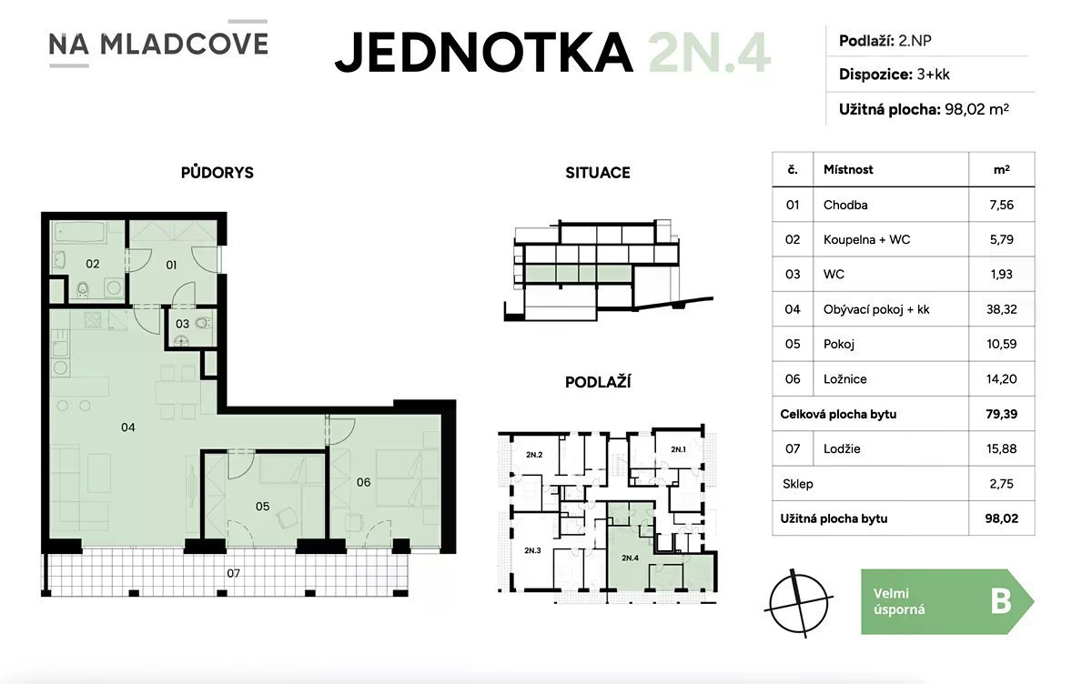 V exkluzivním zastoupení Vám nabízíme ke koupi byt o dispozici 3+kk (79,39 m2) s lodžií (15,88 m2) a sklepem (2,75 m2) ve 2.NP komorního developerského projektu "Byty na Mladcové". Tento bytový dům s výtahem je situovaný v žádané místní části krajského města Zlína a nabízí ve třech nadzemních podlažích 11 bytových jednotek, při jejichž výstavbě je kladen především důraz na kvalitu, soukromí a pohodlí moderního bydlení. Součástí tohoto domu je 19 vnitřních parkovacích stání, které jsou umístěny v podzemním podlaží a jsou rozděleny na tři samostatné stání a 16 parkovacích míst v zakladačích, což je výrazně více, než je běžné u jiných projektů. Cena parkovacího stání je 750.000,- Kč vč. DPH a cena zakladače je 450.000,- Kč vč. DPH a nejsou zahrnuty v ceně bytu. Každý z bytů v projektu "Byty na Mladcové" reprezentuje spojení vyššího standardu a kvalitních materiálů, které zajišťují nejen komfort, ale i dlouhodobou hodnotu bydlení. Bytový dům disponuje energetickou třídou B - což nejen snižuje provozní náklady pro majitele, ale zároveň podtrhuje vizi dlouhodobé udržitelnosti. Více informací o standardech vybavení a o celém projektu najdete na našem webu projektu. Výstavba byla zahájena ve 04/2025 a předpokládaný termín dokončení a předání bytů novým majitelům je 12/2026. Výhradně Vám také zajistíme nejvýhodnější financování na trhu a to díky nezávislé spolupráci se všemi komerčními bankami na trhu. Můžeme také poskytnout i alternativní možnosti financování např. skrze družstevní vlastnictví. Mladcová, to není je dobrá adresa s luxusními výhledy do okolí, ale i bezpečné bydlení v zeleni s výbornou dostupností do centra města. Autem zhruba 10 minut či MHD, kdy linka č. 31 jezdí několikrát do hodiny. V těsné blízkosti projektu se nachází yoga studio i příjemná kavárna, v místní části Mladcová je i MŠ, fotbalové a tartanové hřiště, dětské hřiště a tenisové kurty. Spoustu možností k volnočasovým aktivitám, ale i množství škol všech stupňů vzdělávání a veškeré další zázemí městského života Vám Baťovo město nabídne dosyta.
