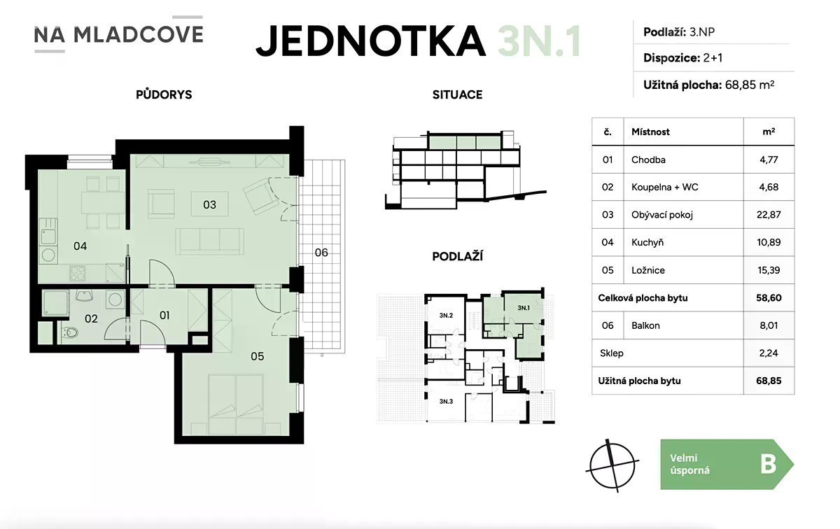 V exkluzivním zastoupení Vám nabízíme ke koupi byt o dispozici 2+1 (58,60 m2) s balkonem (8,01 m2) a sklepem (2,24 m2) ve 3.NP komorního developerského projektu "Byty na Mladcové". Tento bytový dům s výtahem je situovaný v žádané místní části krajského města Zlína a nabízí ve třech nadzemních podlažích 11 bytových jednotek, při jejichž výstavbě je kladen především důraz na kvalitu, soukromí a pohodlí moderního bydlení. Součástí tohoto domu je 19 vnitřních parkovacích stání, které jsou umístěny v podzemním podlaží a jsou rozděleny na tři samostatné stání a 16 parkovacích míst v zakladačích, což je výrazně více, než je běžné u jiných projektů. Cena parkovacího stání je 750.000,- Kč vč. DPH a cena zakladače je 450.000,- Kč vč. DPH a nejsou zahrnuty v ceně bytu. Každý z bytů v projektu "Byty na Mladcové" reprezentuje spojení vyššího standardu a kvalitních materiálů, které zajišťují nejen komfort, ale i dlouhodobou hodnotu bydlení. Bytový dům disponuje energetickou třídou B - což nejen snižuje provozní náklady pro majitele, ale zároveň podtrhuje vizi dlouhodobé udržitelnosti. Více informací o standardech vybavení a o celém projektu najdete na našem webu projektu. Výstavba byla zahájena ve 04/2025 a předpokládaný termín dokončení a předání bytů novým majitelům je 12/2026. Výhradně Vám také zajistíme nejvýhodnější financování na trhu a to díky nezávislé spolupráci se všemi komerčními bankami na trhu. Můžeme také poskytnout i alternativní možnosti financování např. skrze družstevní vlastnictví. Mladcová, to není je dobrá adresa s luxusními výhledy do okolí, ale i bezpečné bydlení v zeleni s výbornou dostupností do centra města. Autem zhruba 10 minut či MHD, kdy linka č. 31 jezdí několikrát do hodiny. V těsné blízkosti projektu se nachází yoga studio i příjemná kavárna, v místní části Mladcová je i MŠ, fotbalové a tartanové hřiště, dětské hřiště a tenisové kurty. Spoustu možností k volnočasovým aktivitám, ale i množství škol všech stupňů vzdělávání a veškeré další zázemí městského života Vám Baťovo město nabídne dosyta.