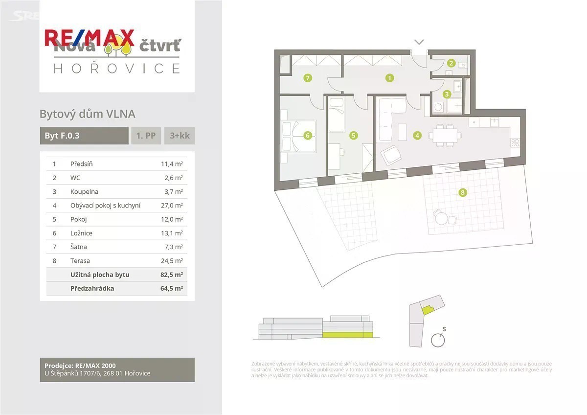 Nový byt o dispozici 3+kk, celková podlahová plocha 82,5 m2 + předzahrádka 63 m2 v 1.PP, označený F.0.3 - budova F, projekt VLNA. Uvedená cena zahrnuje variantu bytu v základním provedení. Kupující si vybírá standardy nutné ke kolaudaci - podlahy, dveře, sanitu, obklady, dlažby u sjednaných dodavatelů a cena za tento standard není součástí uvedené ceny. Kuchyňskou linku Vám rád zhotoví na míru náš dodavatel kuchyní. K bytu náleží sklepní kóje. Vyhrazené venkovní parkovací stání v areálu bytového komplexu Nová čtvrť Hořovice v ul. Dr. Maličkého. Krátkodobé zastavení bude možné přímo u bytového domu VLNA. Cena parkovacího stání je 250 000 Kč. Předpokládaný termín dokončení je 2.Q/2027. Využijte plný komfort města a výborným spojením s Prahou či Plzní. Jedná se o atraktivní lokalitu v Hořovicích ( cca 8 tis. obyvatel ). Tento moderní objekt přímo u parku se pyšní nejen svou strategickou polohou nedaleko obchodní a rezidenční zóny, ale i svým svěžím a současným designem, který jistě zaujme na první pohled. Nemovitost je v současné době ve fázi zahájení výstavby, což vám dává jedinečnou příležitost podílet se na dokončení interiéru podle vašich představ a potřeb. Rádi zodpovíme Vaše dotazy.
