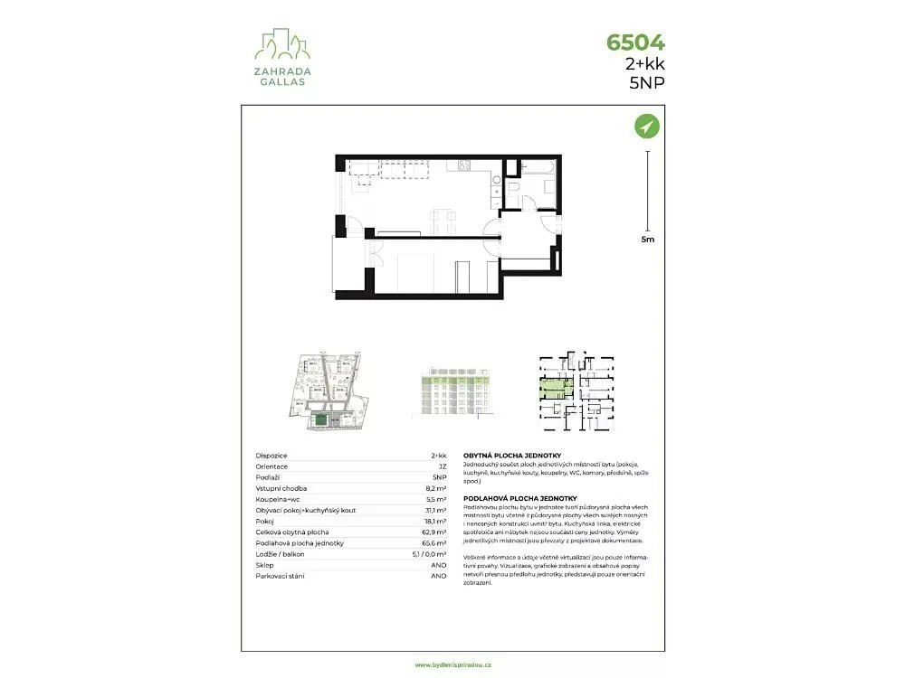 Hledáte moderní bydlení v klidné lokalitě s výbornou dostupností? Nabízíme vám krásný byt 2+kk o velikosti 62,09 m² na hezkém místě v Liberci. Tento světlý byt se nachází v 5. nadzemním podlaží a potěší příjemnou jihozápadní orientací - odpolední slunce si vychutnáte na lodžii o rozloze 5,1 m². Dispozice je promyšlená: prostorný obývací pokoj s kuchyňským koutem má 31,1 m², ložnice 18,1 m², koupelna s WC 5,5 m² a vstupní chodba 8,2 m². Celková obytná plocha činí 62,9 m², podlahová plocha bytu 65,6 m². K bytu náleží sklep a parkovací stání - praktický bonus pro pohodlné bydlení. Byt působí vzdušně a klidně, ideální pro páry nebo jednotlivce, kteří ocení prostor pro společné vaření i chvíle odpočinku. Lodžie je jako stvořená na ranní kávu i večerní posezení při západu slunce. V domě najdete vše, co k modernímu životnímu stylu potřebujete, a díky skvělé dostupnosti se rychle dostanete jak do centra, tak i za přírodou. Architektonický koncept projektu vychází z návrhu renomovaného anglického studia Chapman Tailor a je inspirován prvorepublikovými vilami. Výstavba nabízí dostatek prostoru mezi budovami a pečlivě řešené veřejné prostory, což vytváří přívětivé a neanonymní prostředí. S maximálně 40 byty v každé budově zde můžete očekávat klid a soukromí. Strategická poloha v blízkosti libereckého nádraží zajišťuje vynikající dostupnost do centra města i mimo něj. Užijte si moderní bydlení v srdci Liberce s projektem Zahrada Gallas. Kontaktujte nás a my vám rádi připravíme individuální finanční plán podle vašich potřeb. Byt je v družstevním vlastnictví, což znamená, že nepotřebujete hypotéku, stačí zaplatit převod družstevního podílu a můžete se nastěhovat. Zbytek ceny můžete pohodlně splácet v měsíčních splátkách. Družstevní podíl lze snadno a rychle převést na třetí osobu, pokud byste se rozhodli byt v budoucnu prodat. Více informací o družstevní formě vlastnictví najdete na našich stránkách. Ozvěte se nám a dohodněte si individuální prohlídku bytu. Prohlédnete si standard kvality naší výstavby, dozvíte se, proč je družstevní bydlení díky financování tak výhodné, získáte na míru šitý návrh financování dle vašich možností a dozvíte se všechno o družstevní formě vlastnictví. Pokud vás tento byt zaujal, neváhejte nás kontaktovat. Připravíme vám individuální finanční model na míru vašim požadavkům.