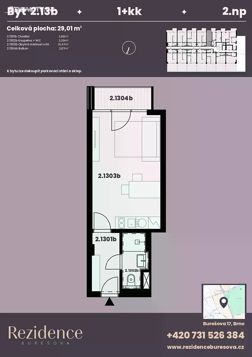 Nabízíme k prodeji moderní byt 1+kk o podlahové ploše 26,14 m2 s balkonem 2,87 m2 nacházející se v námi připravovaném projektu Rezidence Burešova v atraktivní lokalitě Veveří. K bytu lze koupit parkovací místo v zakladači i sklep. Orientace tohoto bytu je jih. Velkorysý balkon umožňuje po dlouhém pracovním dni nejen relaxaci, ale i příjemné posezení s rodinou. Podlahové vytápění zajišťuje rovnoměrné a příjemné teplo po celém bytě. Celý byt je navržen s důrazem na moderní design a kvalitní materiály, což splňuje vysoké standardy. Byt disponuje přípravou na předokenní žaluzie, přípravou na centrální klimatizaci a rekuperací. V domě se nachází prostorná místnost určená pro kočárky a kola. Rezidence Burešova se nachází v oblíbené a vyhledávané lokalitě v blízkosti parku Lužánky umožňující relaxaci v zeleni i sportovní vyžití. Umístění domu nabízí veškerou občanskou vybavenost, včetně obchodů, restaurací a kaváren, divadel a kin v docházkové vzdálenosti. Dále se vyznačuje výbornou dopravní dostupností do centra města. Dokončení projektu je plánováno ke konci roku 2027. Pokud hledáte komfortní a moderní bydlení v blízkosti centra města Brna, je tento byt tou pravou volbou pro vás. Pro více informací nebo sjednání prohlídky s možností výhledu ze stávající budovy nás neváhejte kontaktovat.