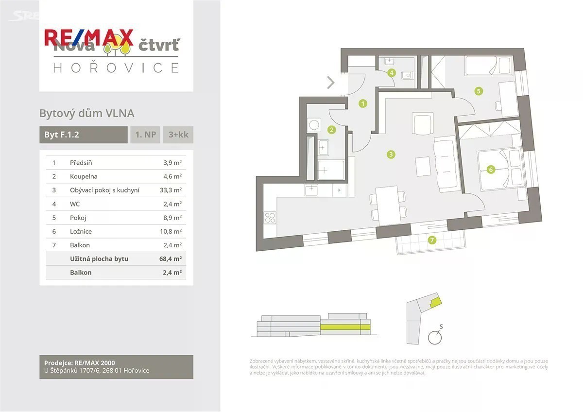 Prodej nového bytu o dispozici 3+kk 63,9 m2 a s balkonem ve výstavbě v projektu Nová čtvrť - etapa Vlna, vznikající uprostřed krásného parku v Hořovicích. Budoucí byt označený jako F 1.2 v novostavbě bytového domu s výtahem má podlahovou plochu 68,4 m2 (včetně příček) a nachází se v 1 NP, náleží k němu balkon 2,4 m2. Uvedená cena zahrnuje variantu bytu v základním provedení. Kupující si vybírá standardy nutné ke kolaudaci - podlahy, dveře, sanitu, obklady, dlažby a cena za tento standard není součástí uvedené ceny. Cena dále zahrnuje přípravu na venkovní žaluzie, podlahové topení a sklepní kóji. Nadstandardní vybavení jako jsou rekuperace, klimatizace a venkovní žaluzie je možné na přání klienta s doplatkem. Budoucí majitel si může vybrat zařizovací předměty, podlahy, dveře, obklady a dlažby dle svého vkusu u sjednaných dodavatelů. Kuchyňskou linku Vám rád zhotoví na míru náš dodavatel kuchyní. Byt je orientovaný na Jih a Východ s výhledem do parku a na jezírko. K bytu je možné dokoupit venkovní parkovací stání za 250.000,- Kč. Venkovní parkovací stání rezidentů budou na uzavřeném parkovišti v okolí domu. Zahájení výstavby červenec 2025. Předpokládaný termín dokončení je 2.Q/2027. Využijte plný komfort města a výborným spojením s Prahou či Plzní. Okolní park bude místem, kde budete chtít trávit svůj volný čas s rodinou a přáteli. Najdete zde místo pro pro příjemné procházky uprostřed zeleně. Hořovice nabízí veškerou občanskou vybavenost města, kulturní centra, obchody, sportoviště, úřady, školy, zdravotnická zařízení, a hlavně blízkost překrásné přírody brdských lesů i kulturních památek. Víkendové výlety se stanou dostupnější i díky množství cyklostezek a turistických tras. Pracujete nebo studujete v Praze nebo v Plzni? Dopravní dostupnost je více než příznivá, Hořovice se totiž nachází téměř přesně mezi Prahou a Plzní - autem na dálnici D5 (EXIT 34), vlakem přímo na Hlavní nádraží v Praze nebo Plzni (vlakové nádraží je 5 min. chůze od domu), autobusem do Příbrami i do Berouna. Více informací najdete na webových stránkách Nová čtvrť Hořovice. Rádi zodpovíme Vaše dotazy.