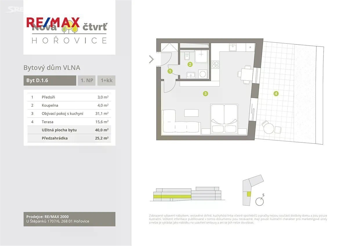 Prodej nového bytu o dispozici 1+kk 38,1 m2 a s předzahrádkou 25,2 m2 ve výstavbě v projektu Nová čtvrť - etapa Vlna, vznikající uprostřed krásného parku v Hořovicích. Budoucí byt označený jako D 1.6 v novostavbě bytového domu s výtahem má podlahovou plochu 40 m2 (včetně příček) a nachází se v 1 NP, náleží k němu předzahrádka s celkovou plochou 25,2 m2 z toho je terasa 15,6 m2. Uvedená cena zahrnuje variantu bytu v základním provedení. Kupující si vybírá standardy nutné ke kolaudaci - podlahy, dveře, sanitu, obklady, dlažby a cena za tento standard není součástí uvedené ceny. Cena dále zahrnuje přípravu na venkovní žaluzie, podlahové topení a sklepní kóji. Nadstandardní vybavení jako jsou rekuperace, klimatizace a venkovní žaluzie je možné na přání klienta s doplatkem. Budoucí majitel si může vybrat zařizovací předměty, podlahy, dveře, obklady a dlažby dle svého vkusu u sjednaných dodavatelů. Kuchyňskou linku Vám rád zhotoví na míru náš dodavatel kuchyní. Byt je orientovaný na Východ. K bytu je možné dokoupit venkovní parkovací stání za 250.000,- Kč. Venkovní parkovací stání rezidentů budou na uzavřeném parkovišti v okolí domu. Zahájení výstavby červenec 2025. Předpokládaný termín dokončení je 2.Q/2027. Využijte plný komfort města a výborným spojením s Prahou či Plzní. Okolní park bude místem, kde budete chtít trávit svůj volný čas s rodinou a přáteli. Najdete zde místo pro pro příjemné procházky uprostřed zeleně. Hořovice nabízí veškerou občanskou vybavenost města, kulturní centra, obchody, sportoviště, úřady, školy, zdravotnická zařízení, a hlavně blízkost překrásné přírody brdských lesů i kulturních památek. Víkendové výlety se stanou dostupnější i díky množství cyklostezek a turistických tras. Pracujete nebo studujete v Praze nebo v Plzni? Dopravní dostupnost je více než příznivá, Hořovice se totiž nachází téměř přesně mezi Prahou a Plzní - autem na dálnici D5 (EXIT 34), vlakem přímo na Hlavní nádraží v Praze nebo Plzni (vlakové nádraží je 5 min. chůze od domu), autobusem do Příbrami i do Berouna. Více informací najdete na webových stránkách Nová čtvrť Hořovice. Rádi zodpovíme Vaše dotazy.