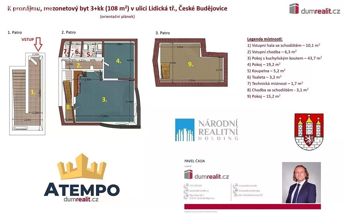Naše společnost Vám zprostředkuje pronájem světlého prostorného mezonetového bytu 3+kk (108 m²) ve zděném domě v docházkové vzdálenosti 5 minut od historického centra Českých Budějovic, ulici Lidická tř. Podrobné rozkreslení dispozice bytu naleznete na orientačním plánku mezi fotografiemi. Vytápění včetně ohřevu vody je plynovým kotlem. Nájemné činí 16.000,- Kč + zálohové platby na energie 3.500,- Kč měsíčně (el. energie, plyn, voda a topení). Doporučuji osobní prohlídku. Více informací Vám poskytne realitní makléř Pavel Čada z RK A TEMPO fungující pod ochranou známkou naše společnost. Ev. číslo: 652786.
