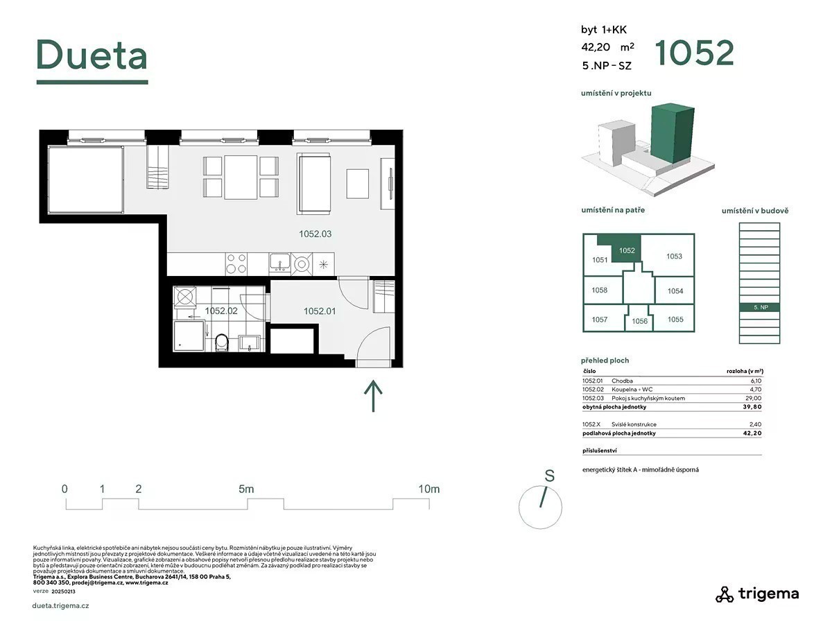 Byt č. 1042: Prostorné 1+kk s chytrým řešením interiéru Výstavba zahájena - 40 % bytů prodáno během 6 měsíců! Neváhejte s výběrem - právě teď máte možnost zvolit si ideální dispozici i orientaci bytu v atraktivním projektu Dueta Kamýk, který spojuje moderní bydlení s přírodou. Byt č. 1042 o dispozici 1+kk s podlahovou plochou 42,20 m² se nachází v 4. nadzemním podlaží a je orientovaný na severozápad, což zajišťuje příjemné odpolední světlo bez přehřívání v létě. Dispozice zahrnuje hlavní obytný prostor s kuchyňským koutem, chodbu a koupelnu s WC. Obytná plocha jednotky činí 39,80 m², doplněná o konstrukční části. • Prostorný hlavní obytný prostor • Světlá severozápadní orientace • Energetická třída A - mimořádně úsporná Vhodné pro: Singles nebo mladé profesionály hledající komfortní a moderní městské bydlení. Projekt Dueta Kamýk přináší jedinečnou kombinaci klidného bydlení uprostřed přírody a skvělé dostupnosti do centra Prahy díky plánované trase metra D. Lokalita nabízí nejen blízkost lesoparku a rozsáhlé zeleně, ale i atraktivní výhledy, které ocení každý milovník přírody. Byty jsou vybaveny nadstandardními technologiemi - rekuperací, podlahovým vytápěním, předokenními žaluziemi a kvalitními materiály, které zaručují pohodlí i úsporný provoz. Dueta Kamýk je ideálním řešením jak pro vlastní bydlení, tak jako chytrá investice v rychle se rozvíjející lokalitě.