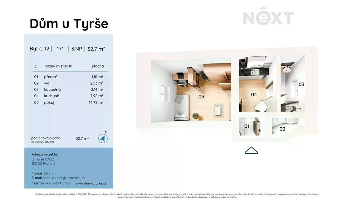 Dovolujeme si vám nabídnout projekt „Dům U Tyrše". Tento projekt vznikl rekonstrukcí historického bytového domu v prestižní pražské lokalitě Košíře. Rekonstrukcí vznikly moderní rezidenční jednotky, které nabízí komfortní a moderní bydlení v atraktivní lokalitě s výbornou dostupností do centra Prahy. Nabízíme k prodeji byt o celkové ploše 30,1 m2 v 1.NP rezidence,Dům u Tyrše". Jednotka se skládá z pokoje o ploše 12,2 m2, kuchyně s přípravou na kuchyňskou linku o ploše 8,1 m2, kompletně zařízenou koupelnou se sprchovým koutem o ploše 3,25 m2, toaletou o ploše 2,4 m2 a předsíní o ploše 1,75 m2. Nemovitost je vhodná jako investiční příležitost nebo startovací byt ve velmi žádané lokalitě. V docházkové vzdálenosti se nachází tramvajová zastávka U Zvonu, z které jste za 3 minuty na metru "B" Anděl, kde se nachází OC Nový Smíchov, multikina, restaurace, poliklinika, MŠ, ZŠ a veškerá další infrastruktura. K odpočinku lze využít nedalekou náplavku, Petřínské sady nebo vyhlášené Švandovo divadlo. Součástí naší nabídky je kompletní servis, tedy právní služby a zajištění všech potřebných dokumentů, pomoc se zajištěním financování, pojištění nemovitosti i domácnosti, přepisy energií. Pouze u nás vám zajistíme moderní financování až na 30 let, bez ohledu na věk a prokazování příjmů, či nutnosti předkládat daňové přiznání (u podnikatelů). Zeptejte se nás a bydlete chytře! Bližší informace Vám rád sdělím na osobní prohlídce tohoto bytu. Pro komunikaci uvádějte evidenční číslo zakázky N109736.