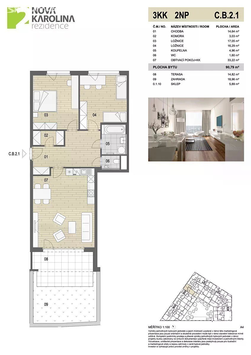 Nabízíme k prodeji exkluzivní byt 3+kk v centru Ostravy v rozvíjející se lokalitě Nové Karoliny. Byt o užitné ploše 91 m² nabízí komfortní bydlení se zahradou o výměře 19 m² a terasou o ploše 15 m². Zahrada i terasa jsou situovány do klidové části vnitřního traktu. Součástí jednotky je komora a sklep. Je zde možnost koupit jedno parkovací místo v garážové hale za cenu 495.000 Kč. Celý objekt je nyní ve výstavbě s plánovaným nastěhováním od pol. roku 2027. Nabízená jednotka je situována v objektu C, který je součástí moderní výstavby, která postupně vzniká v lokalitě Nové Karoliny. Celý projekt respektuje urbanistický plán města Ostravy, jehož cílem je vytvořit novou, přívětivou městskou čtvrť s jasně definovanými ulicemi a městskými bloky. Budova C zaujme svou promyšlenou architekturou a respektem k okolnímu prostředí. Tvarem tvoří lichoběžníkový polouzavřený blok, který díky rozčlenění na menší sekce připomíná jednotlivé městské domy. Vnitroblok je navržen jako klidný prostor se zelení a společnou zahradou, poskytující obyvatelům příjemné místo k relaxaci. V objektu se nachází celkem 127 bytů a 6 komerčních jednotek v osmi nadzemních podlažích. V podzemním podlaží se nachází parkovací stání a sklepy. Byty jsou prostorné, navržené pro komfortní bydlení. Velký důraz je kladen na funkčnost a efektivní využití prostoru, který splňuje moderní standardy bydlení. Byty v posledních patrech jsou atypické, nadstandardně řešené a díky své pozici mají atraktivní výhledy. Více informací na stránkách projektu Rezidence Nová Karolina.
