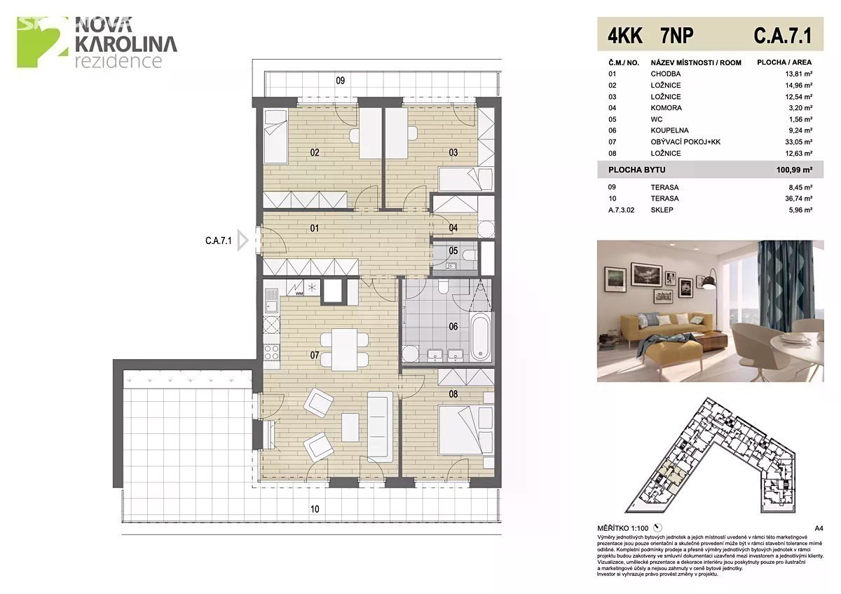 Nabízíme k prodeji exkluzivní byt 4+kk situovaný v srdci Ostravy, který je součástí moderní výstavby v rámci Nové Karoliny. Tato jednotka se nachází v 7. podlaží, v této části domu se jedná o podlaží poslední a je ideální pro ty, kteří hledají komfortní bydlení a exkluzivní lokalitu. Byt o užitné ploše 101 m2 oslní prostornou terasou, která je ideální pro letní relaxaci nebo společenská setkání. V bytě se nachází komora, součástí je také sklep. Je zde možnost zakoupit až dvě parkovací místa v garážové hale, cena jednoho je 495.000 Kč. Celý objekt je nyní ve výstavbě s plánovaným nastěhováním od pol. roku 2027. Nabízená jednotka je situována v objektu C, který je součástí moderní výstavby, která postupně vzniká v lokalitě Nové Karoliny. Celý projekt respektuje urbanistický plán města Ostravy, jehož cílem je vytvořit novou, přívětivou městskou čtvrť s jasně definovanými ulicemi a městskými bloky. Budova C zaujme svou promyšlenou architekturou a respektem k okolnímu prostředí. Tvarem tvoří lichoběžníkový polouzavřený blok, který díky rozčlenění na menší sekce připomíná jednotlivé městské domy. Vnitroblok je navržen jako klidný prostor se zelení a společnou zahradou, poskytující obyvatelům příjemné místo k relaxaci. V objektu se nachází celkem 127 bytů a 6 komerčních jednotek v osmi nadzemních podlažích. V podzemním podlaží se nachází parkovací stání a sklepy. Byty jsou prostorné, navržené pro komfortní bydlení. Velký důraz je kladen na funkčnost a efektivní využití prostoru, který splňuje moderní standardy bydlení. Byty v posledních patrech jsou atypické, nadstandardně řešené a díky své pozici mají atraktivní výhledy. Více informací na stránkách projektu Rezidence Nová Karolina.