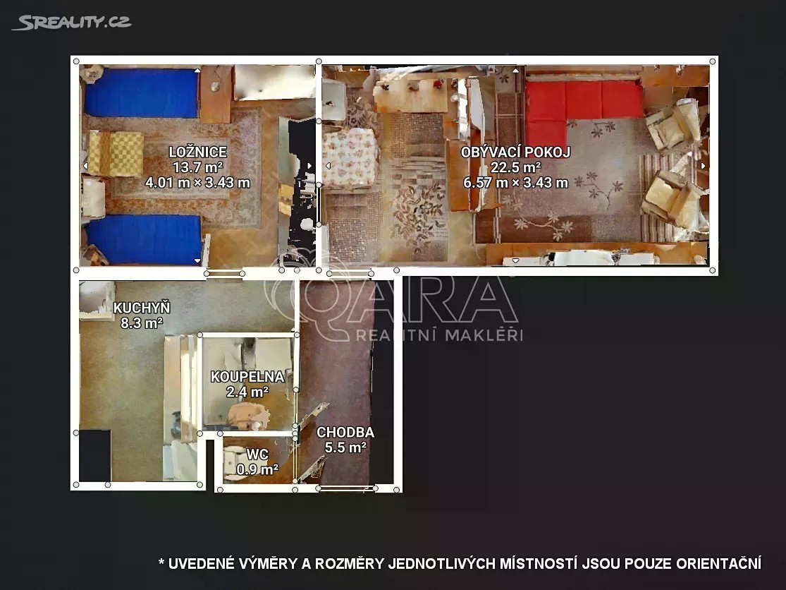 Dovoluji si Vám nabídnout prodej bytu v osobním vlastnictví o dispozici 2+1, 53 m2, v ulici Dr. E. Beneše, v Kralupech nad Vltavou - Lobečku. Byt se nachází ve čtvrtém - posledním patře zatepleného panelového domu bez výtahu. Dispozici bytu tvoří vstupní chodba (5,5 m2), koupelna s vanou (2,5 m2), samostatná toaleta (1 m2), kuchyň (7,3 m2), chodbička (1,4 m2), ložnice (13,8 m2)a obývací pokoj (22,6 m2). Okna kuchyně a ložnice jsou orientovaná do zeleně ve vnitrobloku na severovýchodní stranu, obývací pokoj má okna orientovaná jak na jihovýchodní, tak i na jihozápadní stranu. Díky umístění oken je možné obývací pokoj rozdělit jednoduchou příčkou na dvě místnosti, a získat tak byt o dispozici 3+1. Byt je v původním stavu vhodný pro rekonstrukci podle vlastních představ. Byt má plastová okna se žaluziemi, na podlahách jsou v pokojích parkety kryté koberci, v kuchyni, chodbě, koupelně a toaletě je dlažba krytá PVC. K bytu patří zděná sklepní kóje (2 m2) umístěná v suterénu domu, kde je rovněž k dispozici kolárna a další společné prostory jako sušárna a mandlovna. Měsíční poplatky na provoz bytu jsou aktuálně 4.116,- Kč včetně fondu údržby (800,- Kč) + spotřeba elektřiny a plynu. V bytě je k dispozici přípojka kabelové televize s internetem od Vodafone, v domě pak optický kabel od T-mobile. Součástí této prezentace je virtuální prohlídka, ve které si můžete byt detailně prohlédnout z pohodlí vašeho domova, nebo na mobilním telefonu. Městem prochází množství cyklostezek, v letních měsících je možné využívat moderní venkovní koupaliště, v zimě krytou plaveckou halu, a také zimní stadion. V blízkosti bytu jsou v docházkové vzdálenosti potraviny, supermarkety Lidl, Tesco a Penny, lékařské centrum, lékárna, základní a mateřská škola, restaurace, zastávka MHD, vlakové nádraží s přímým vlakovým spojem na Masarykovo nebo Hlavní nádraží a autobusové nádraží PID - směr metro C Kobylisy. Parkování automobilu je možné před domem. Výborná dostupnost automobilem do Prahy po D8. Koupi bytu lze financovat hypotéčním úvěrem, který Vám rádi pomůžeme zajistit. Více podrobností Vám rád poskytnu na níže uvedeném telefonickém kontaktu nebo emailu. Prodávající si vyhrazuje právo vybrat kupujícího na základě jím zvolených kritérií, v případě více zájemců bude nemovitost prodána nejvhodnější nabídce. Veškeré údaje obsažené v tomto inzerátu mají pouze informativní charakter a nejsou nabídkou ve smyslu § 1731 nebo § 1732 občanského zákoníku, ani se nejedná o veřejný příslib dle § 1733 občanského zákoníku. Z této nabídky tak nikomu nevzniká nárok na uzavření smlouvy.