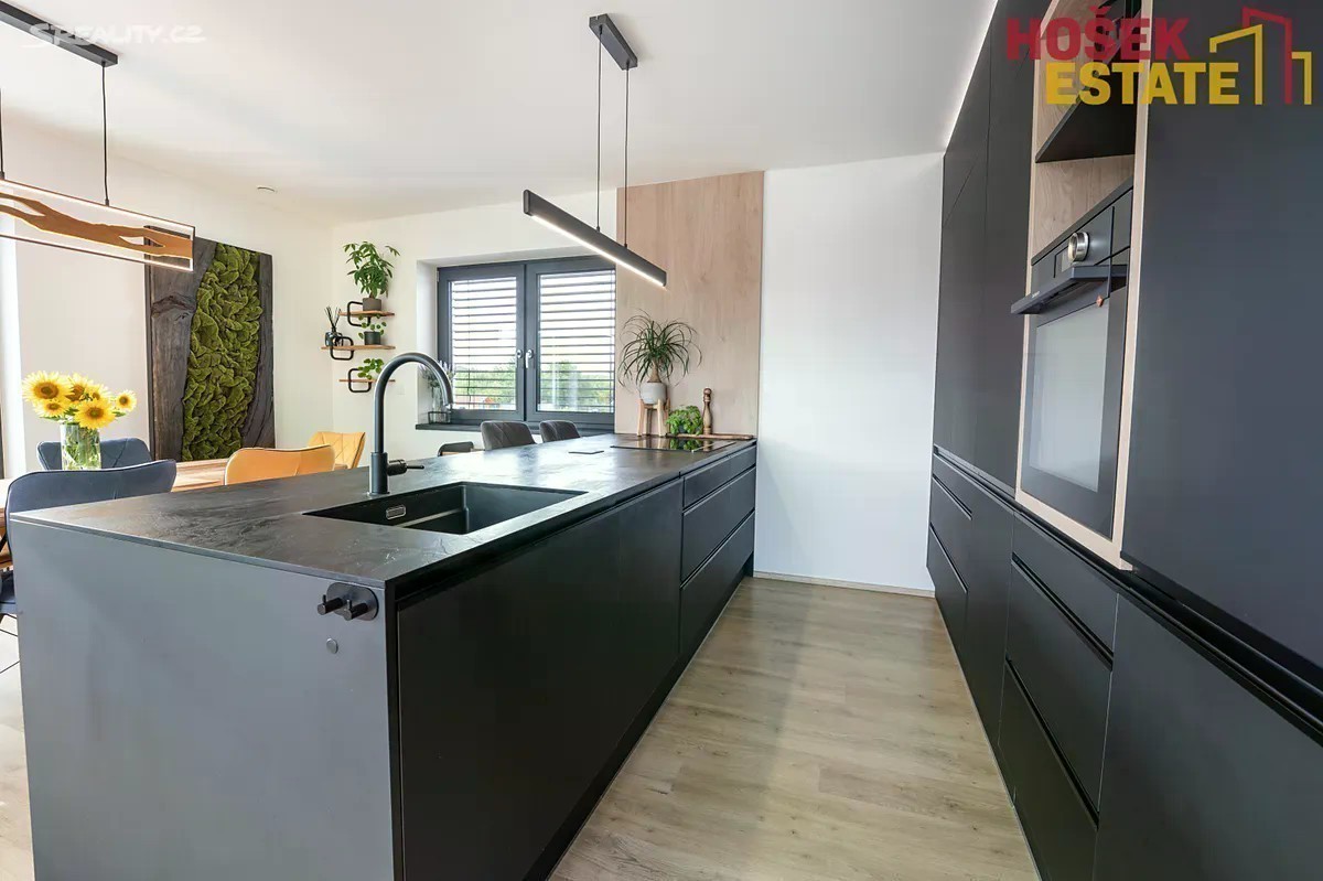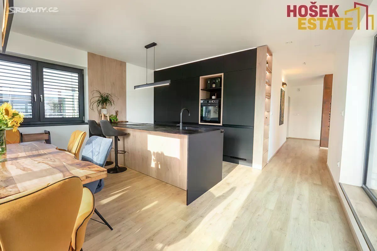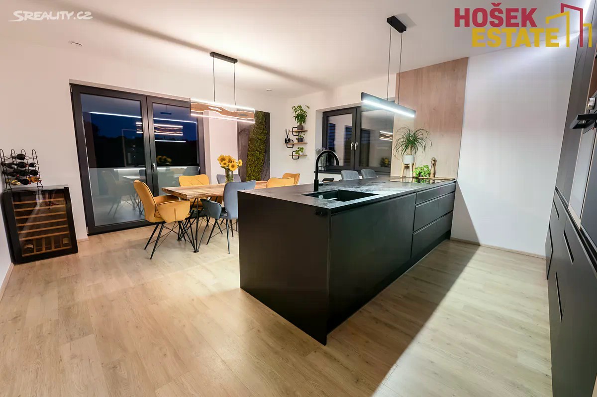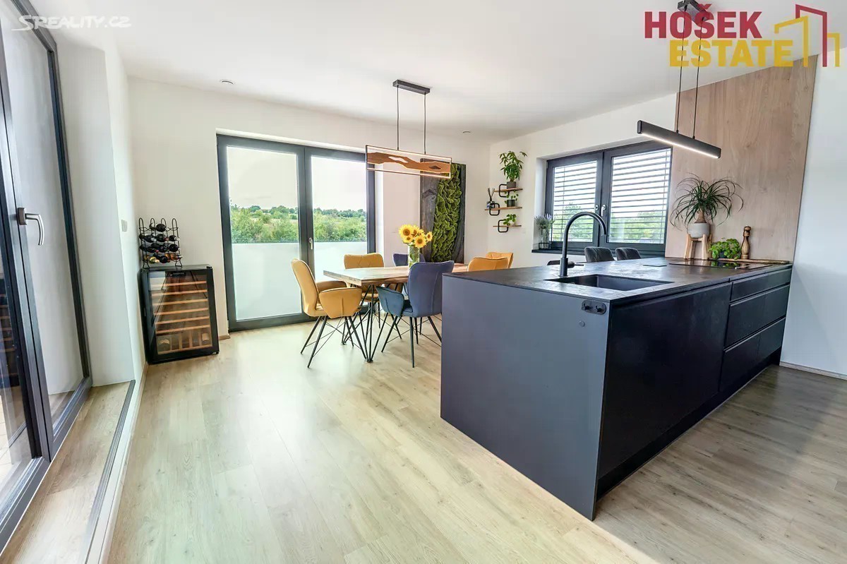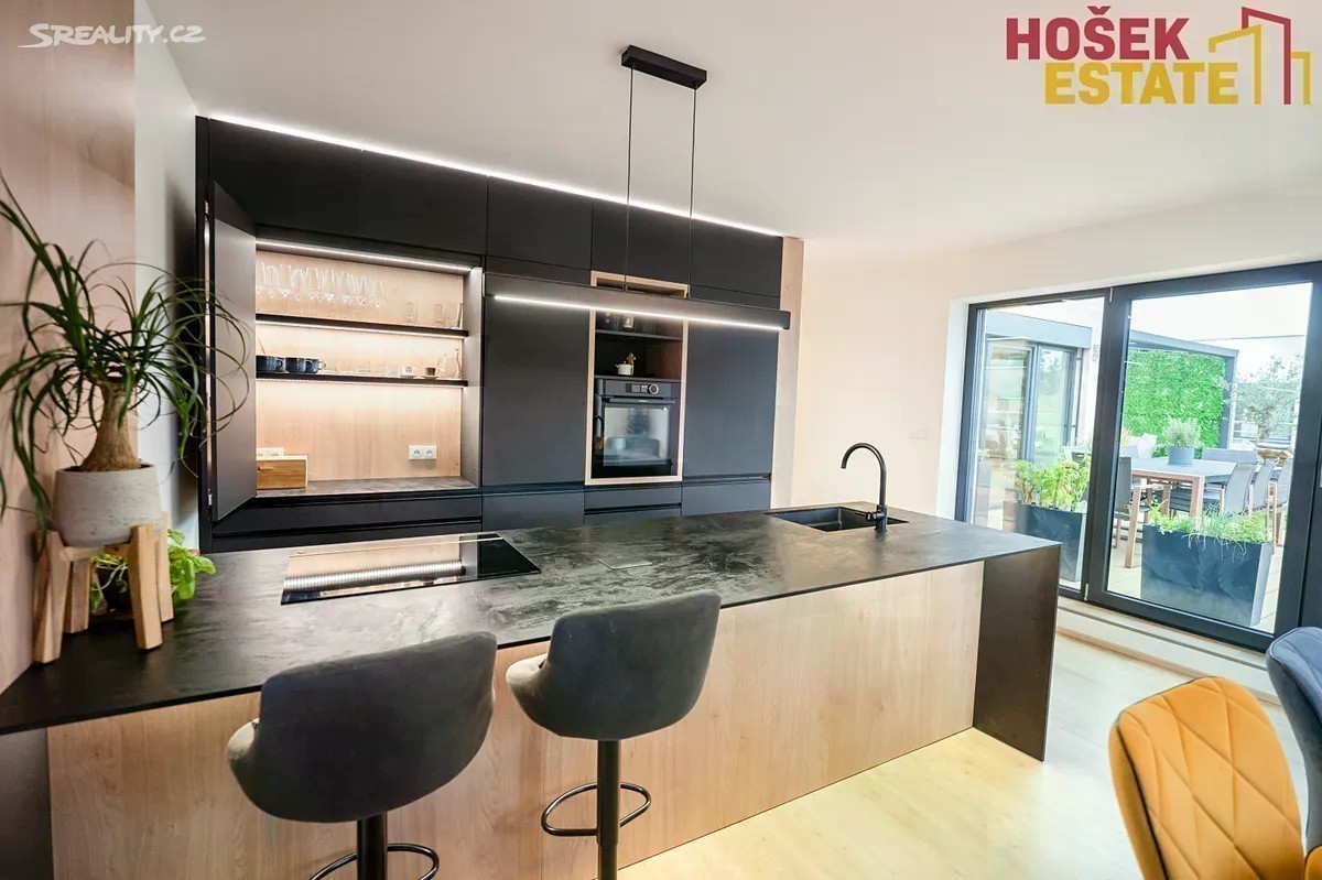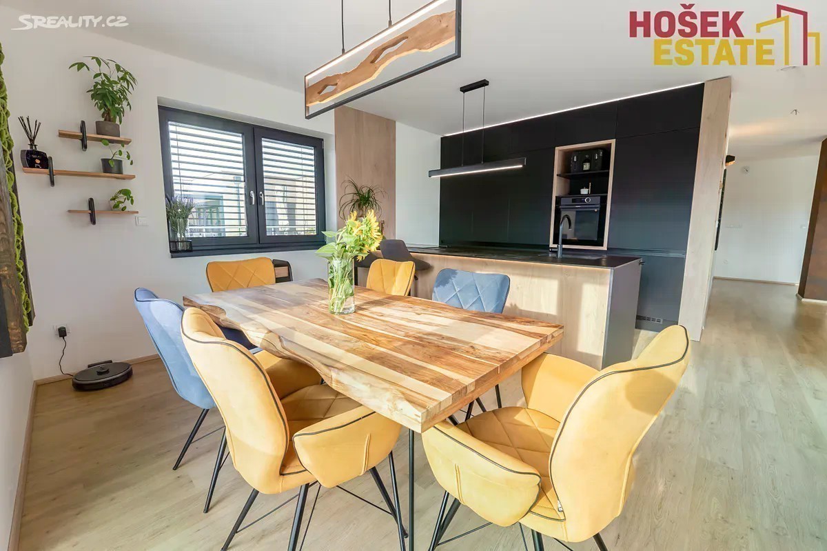 Hošek Estate Vám exkluzivně nabízí luxusní, moderní byt o dispozici 4+kk. Pokud hledáte domov, který spojuje moderní design, dostatek prostoru a klidné rodinné bydlení, pak vás nadchne tento luxusní byt o velikosti 135 m² se soukromým vstupem, velkou terasou a garáží pro dvě auta, který se nachází ve vyhledávané lokalitě Holubice. Byt se nachází ve 2. podlaží domu o 3 bytových jednotkách. Disponuje terasou o velikosti 65m², která je orientovaná na jiho-západ. Díky této skvělé orientaci je na terase slunce téměř po celý den. V suterénu domu se nachází velká garáž na dvě vozidla o velikosti 51m² a sklep o velikosti 17m². Tento byt je ideální volbou pro mladou rodinu, který ocení jednak výbornou, nově vzniklou komunitu složenou především z mladých rodin, zároveň však velmi praktické rozložení bytu. V bytě se nachází 2 šatny. Jedna hned u vstupu, druhá v hlavní ložnici, který byla dodělávaná v rámci nadstandardu. Dále se v bytě nachází velmi praktická technická místnost, kde se nachází místo na pračku, sušičku a tepelné čerpadlo s rekuperací zajišťující teplo, teplou vodu a zároveň čerstvý vzduch v celém bytě pro úsporný a zdravý provoz. V koupelně, kde se nachází jak sprchový kout tak i vana a dvojité umyvadlo, byla na zdi použita betonová stěrka místo klasických obkladů. Stejně tak i na samostatné toaletě. Betonová stěrka je nejen velmi praktická, ale i velmi dobře vypadá. V bytě jsou 2 dětské pokoje o velikosti 14m², které mají společný balkón 5m². Pokoje i ložnice, kde se nachází druhá zmíněná šatna s celkovou plochou 23m², jsou orientované na východ a mají krásný výhled. Díky tomu vstáváte za někdy až dech beroucích východů slunce a zároveň pokoje nejsou tak vyhřáté během letních dní. Obývací pokoj je ze dvou stran celý prosklený s výhledem a vstupem na terasu. Díky netypickému, ale velmi zajímavému řešení máte jednak velké soukromí, zároveň však další hezké výhledy do okolí na západní stranu. Kuchyňský kout s jídelnou je prakticky oddělený od zbytku bytu. Kuchyně je vybavena špičkovými spotřebiči De Dietrich (varná deska, myčka, trouba) a širokou vestavěnou ledničkou Whirpool. Luxusní vzhled pak uceluje kompaktní pracovní deska. Z kuchyně je pak další vstup na terasu skrze velkoformátová okna. Byt je vytápěn skrze podlahové topení. Okna jsou vybavena trojskly a venkovními elektrickými žaluziemi. Dům je postaven v energetické třídě B, což zajišťuje celkové provozní náklady do 4.000Kč/měsíc. Využijte této jedinečně nabídky a přijďte na prohlídku. Prodej tohoto bytu je časově omezen.