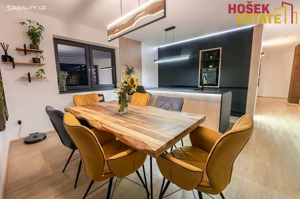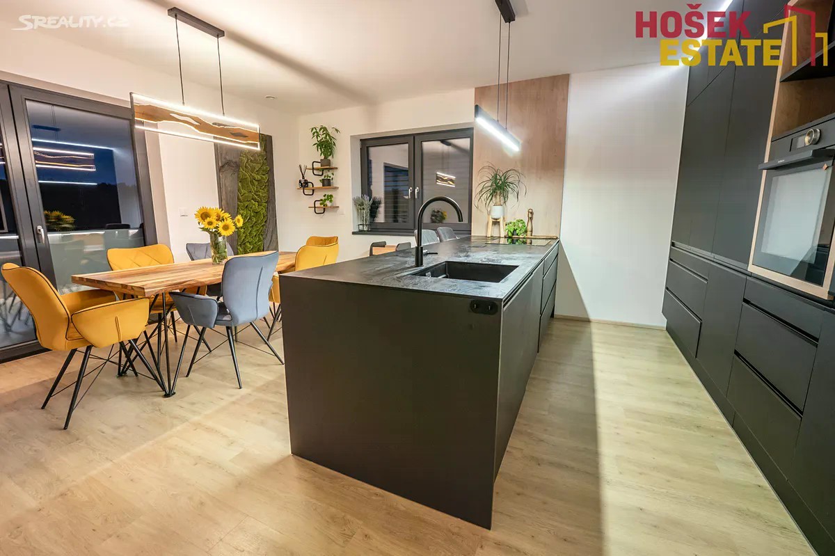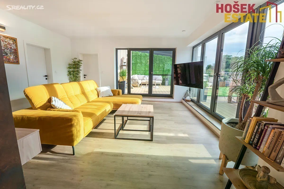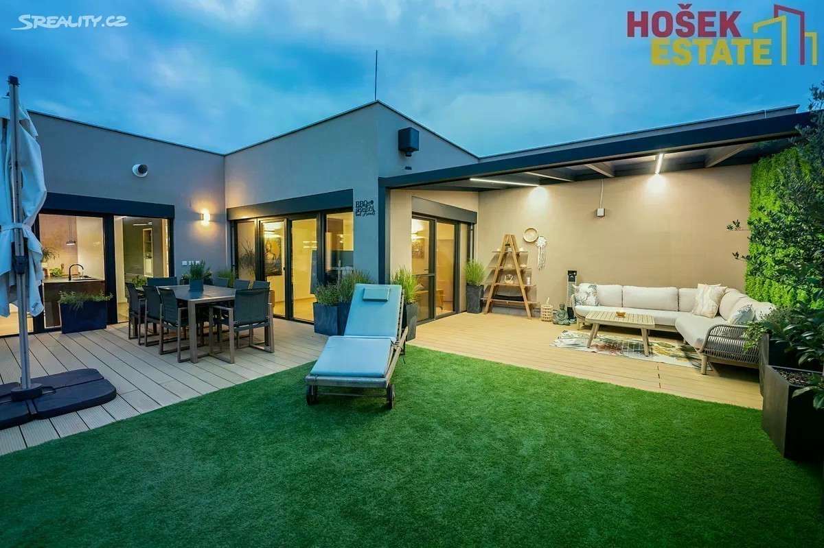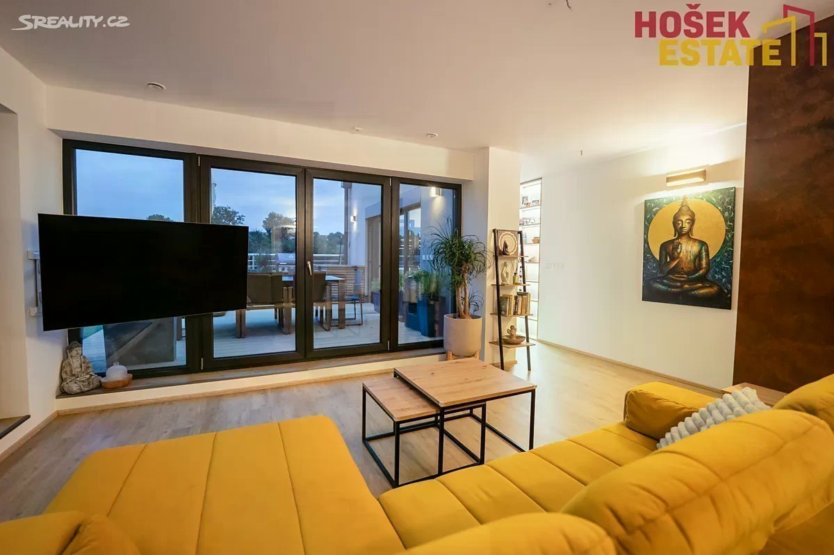 Hošek Estate Vám exkluzivně nabízí luxusní, moderní byt o dispozici 4+kk. Pokud hledáte domov, který spojuje moderní design, dostatek prostoru a klidné rodinné bydlení, pak vás nadchne tento luxusní byt o velikosti 135 m² se soukromým vstupem, velkou terasou a garáží pro dvě auta, který se nachází ve vyhledávané lokalitě Holubice. Byt se nachází ve 2. podlaží domu o 3 bytových jednotkách. Disponuje terasou o velikosti 65m², která je orientovaná na jiho-západ. Díky této skvělé orientaci je na terase slunce téměř po celý den. V suterénu domu se nachází velká garáž na dvě vozidla o velikosti 51m² a sklep o velikosti 17m². Tento byt je ideální volbou pro mladou rodinu, který ocení jednak výbornou, nově vzniklou komunitu složenou především z mladých rodin, zároveň však velmi praktické rozložení bytu. V bytě se nachází 2 šatny. Jedna hned u vstupu, druhá v hlavní ložnici, který byla dodělávaná v rámci nadstandardu. Dále se v bytě nachází velmi praktická technická místnost, kde se nachází místo na pračku, sušičku a tepelné čerpadlo s rekuperací zajišťující teplo, teplou vodu a zároveň čerstvý vzduch v celém bytě pro úsporný a zdravý provoz. V koupelně, kde se nachází jak sprchový kout tak i vana a dvojité umyvadlo, byla na zdi použita betonová stěrka místo klasických obkladů. Stejně tak i na samostatné toaletě. Betonová stěrka je nejen velmi praktická, ale i velmi dobře vypadá. V bytě jsou 2 dětské pokoje o velikosti 14m², které mají společný balkón 5m². Pokoje i ložnice, kde se nachází druhá zmíněná šatna s celkovou plochou 23m², jsou orientované na východ a mají krásný výhled. Díky tomu vstáváte za někdy až dech beroucích východů slunce a zároveň pokoje nejsou tak vyhřáté během letních dní. Obývací pokoj je ze dvou stran celý prosklený s výhledem a vstupem na terasu. Díky netypickému, ale velmi zajímavému řešení máte jednak velké soukromí, zároveň však další hezké výhledy do okolí na západní stranu. Kuchyňský kout s jídelnou je prakticky oddělený od zbytku bytu. Kuchyně je vybavena špičkovými spotřebiči De Dietrich (varná deska, myčka, trouba) a širokou vestavěnou ledničkou Whirpool. Luxusní vzhled pak uceluje kompaktní pracovní deska. Z kuchyně je pak další vstup na terasu skrze velkoformátová okna. Byt je vytápěn skrze podlahové topení. Okna jsou vybavena trojskly a venkovními elektrickými žaluziemi. Dům je postaven v energetické třídě B, což zajišťuje celkové provozní náklady do 4.000Kč/měsíc. Využijte této jedinečně nabídky a přijďte na prohlídku. Prodej tohoto bytu je časově omezen.