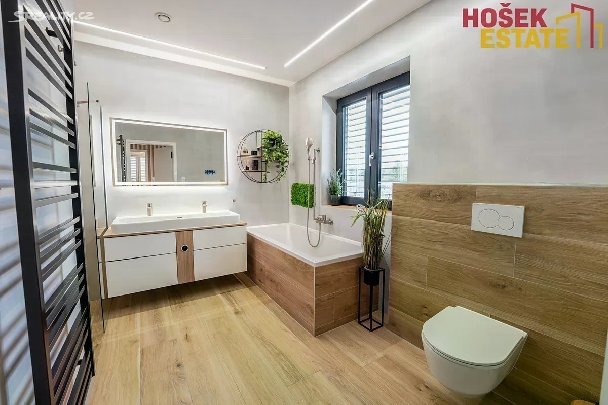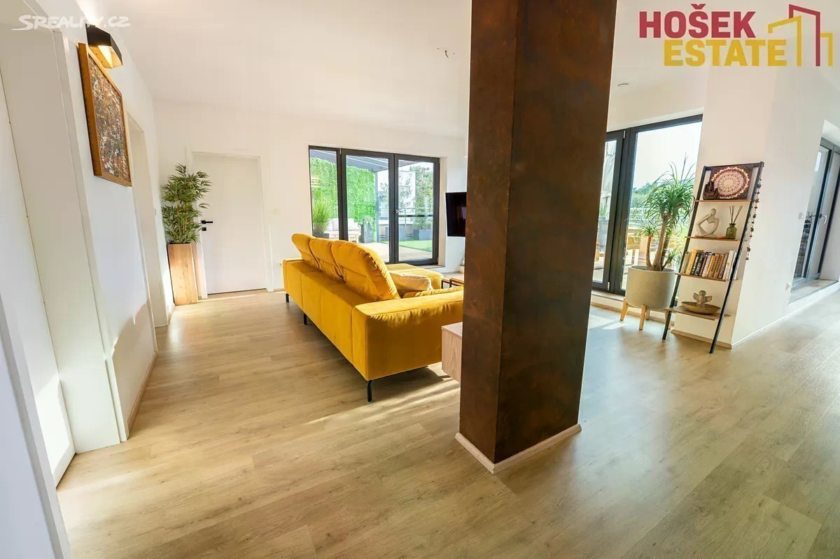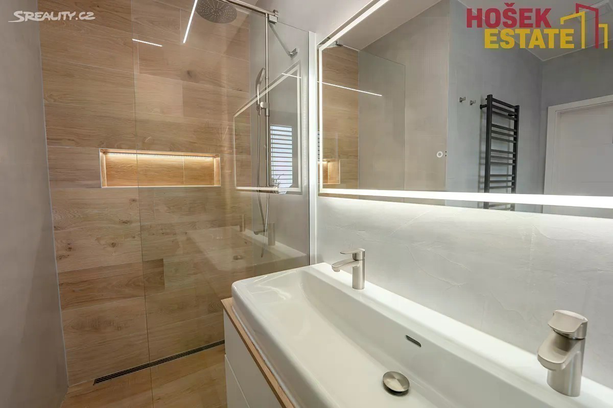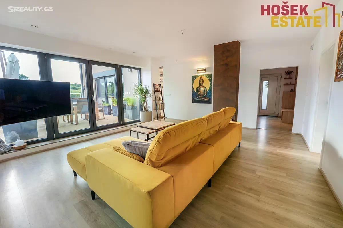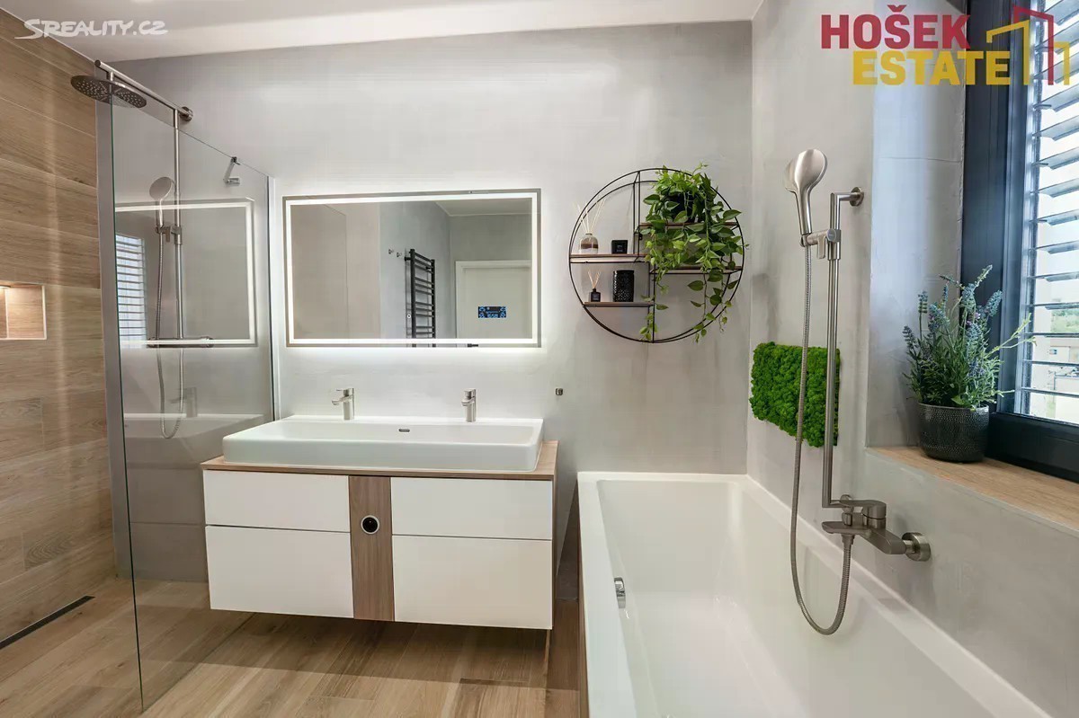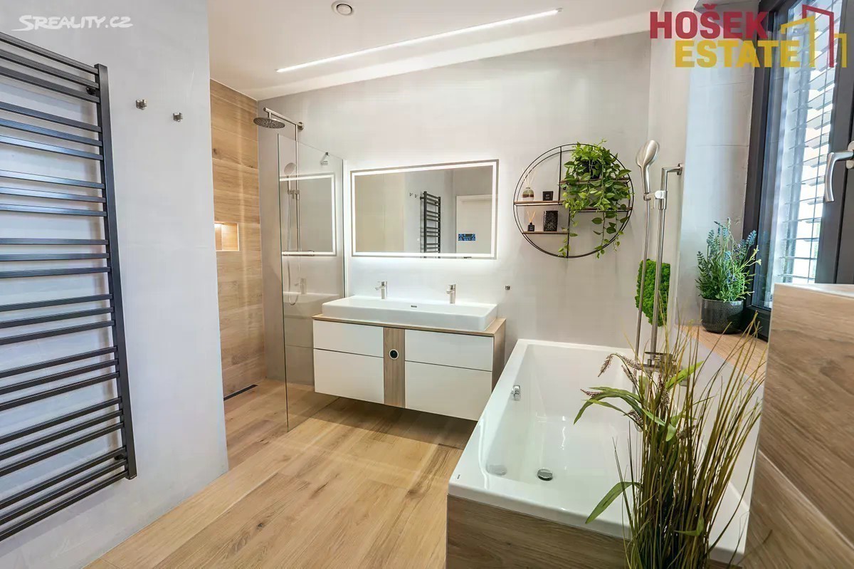 Hošek Estate Vám exkluzivně nabízí luxusní, moderní byt o dispozici 4+kk. Pokud hledáte domov, který spojuje moderní design, dostatek prostoru a klidné rodinné bydlení, pak vás nadchne tento luxusní byt o velikosti 135 m² se soukromým vstupem, velkou terasou a garáží pro dvě auta, který se nachází ve vyhledávané lokalitě Holubice. Byt se nachází ve 2. podlaží domu o 3 bytových jednotkách. Disponuje terasou o velikosti 65m², která je orientovaná na jiho-západ. Díky této skvělé orientaci je na terase slunce téměř po celý den. V suterénu domu se nachází velká garáž na dvě vozidla o velikosti 51m² a sklep o velikosti 17m². Tento byt je ideální volbou pro mladou rodinu, který ocení jednak výbornou, nově vzniklou komunitu složenou především z mladých rodin, zároveň však velmi praktické rozložení bytu. V bytě se nachází 2 šatny. Jedna hned u vstupu, druhá v hlavní ložnici, který byla dodělávaná v rámci nadstandardu. Dále se v bytě nachází velmi praktická technická místnost, kde se nachází místo na pračku, sušičku a tepelné čerpadlo s rekuperací zajišťující teplo, teplou vodu a zároveň čerstvý vzduch v celém bytě pro úsporný a zdravý provoz. V koupelně, kde se nachází jak sprchový kout tak i vana a dvojité umyvadlo, byla na zdi použita betonová stěrka místo klasických obkladů. Stejně tak i na samostatné toaletě. Betonová stěrka je nejen velmi praktická, ale i velmi dobře vypadá. V bytě jsou 2 dětské pokoje o velikosti 14m², které mají společný balkón 5m². Pokoje i ložnice, kde se nachází druhá zmíněná šatna s celkovou plochou 23m², jsou orientované na východ a mají krásný výhled. Díky tomu vstáváte za někdy až dech beroucích východů slunce a zároveň pokoje nejsou tak vyhřáté během letních dní. Obývací pokoj je ze dvou stran celý prosklený s výhledem a vstupem na terasu. Díky netypickému, ale velmi zajímavému řešení máte jednak velké soukromí, zároveň však další hezké výhledy do okolí na západní stranu. Kuchyňský kout s jídelnou je prakticky oddělený od zbytku bytu. Kuchyně je vybavena špičkovými spotřebiči De Dietrich (varná deska, myčka, trouba) a širokou vestavěnou ledničkou Whirpool. Luxusní vzhled pak uceluje kompaktní pracovní deska. Z kuchyně je pak další vstup na terasu skrze velkoformátová okna. Byt je vytápěn skrze podlahové topení. Okna jsou vybavena trojskly a venkovními elektrickými žaluziemi. Dům je postaven v energetické třídě B, což zajišťuje celkové provozní náklady do 4.000Kč/měsíc. Využijte této jedinečně nabídky a přijďte na prohlídku. Prodej tohoto bytu je časově omezen.