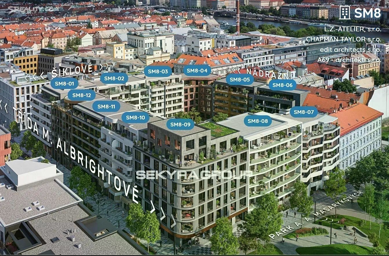 Dovolujeme si Vám nabídnout k prodeji byt 4+kk o výměře 112,7 m2 s lodžií 9,6 m2 v rezidenčním projektu Smíchov City, blok SM8. K bytu je možné přikoupit 2 parkovací stání. V ceně bytu je podlahové topení, předokenní žaluzie a příprava na dochlazování. SM8 navazuje na již realizované rezidenční bloky SM1/2 a SM3 a zahrnuje celkem 12 bytových domů. Je součástí projektu Smíchov City, jehož záměrem je nabídnout obyvatelům moderní bydlení s vysokým standardem provedení, vybavené špičkovými technologiemi. Nespornou výhodou je navíc umístění v centru města. Exkluzivní byty doplní v přízemí objektů funkční městský parter s obchody a službami. V ulicích budou vysázeny stromy, které zpříjemní klima a v horkých dnech poskytnou chladivý stín. Blok sousedí s třídou Madeleine Albrightové pojatou jako pěší podélný park a budoucím parkem Alice a Anny Masarykových. Byty v bloku SM8 jsou navrženy tak, aby si podle svých preferencí a možností mohl vybrat opravdu každý. Dispozičně tu naleznete vše - od malých bytů 1+kk až po velké byty kategorie 5+kk s nádhernými výhledy na Prahu. Samozřejmostí je dostatek parkovacích míst, technické zázemí a sklepní kóje v suterénu objektu. V posledním podlaží jsou pak ty nejexkluzivnější byty, z nichž některé nabízí jedinečný pohled na Vyšehrad. Všechny byty jsou navrženy ve vysokém standardu, což se týká povrchových materiálů i zařízení, jako je podlahové topení či vzduchotechnika s rekuperací vzduchu. Standard bytů lze samozřejmě přizpůsobit potřebám budoucích majitelů. Stačí se obrátit na naše prodejce.