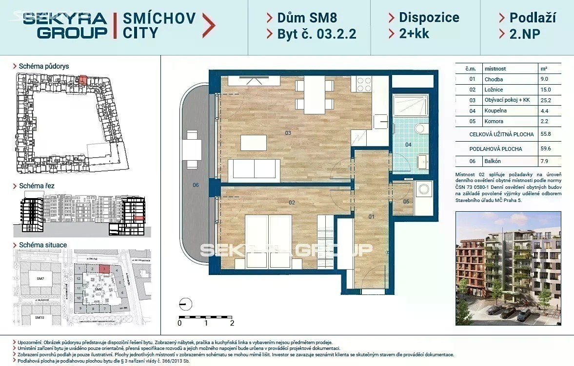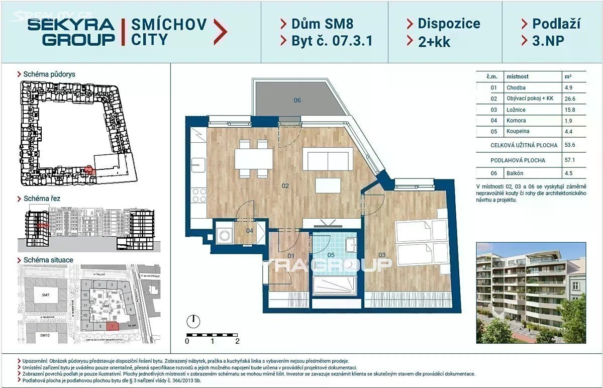 Dovolujeme si Vám nabídnout k prodeji byt 2+kk o výměře 57,1 m² s balkónem 4,5 m² v rezidenčním projektu Smíchov City, blok SM8. K bytu je možné přikoupit 1 parkovací stání. V ceně bytu je podlahové topení, předokenní žaluzie a příprava na dochlazování. SM8 navazuje na již realizované rezidenční bloky SM1/2 a SM3 a zahrnuje celkem 12 bytových domů. Je součástí projektu Smíchov City, jehož záměrem je nabídnout obyvatelům moderní bydlení s vysokým standardem provedení, vybavené špičkovými technologiemi. Nespornou výhodou je navíc umístění v centru města. Exkluzivní byty doplní v přízemí objektů funkční městský parter s obchody a službami. V ulicích budou vysázeny stromy, které zpříjemní klima a v horkých dnech poskytnou chladivý stín. Blok sousedí s třídou Madeleine Albrightové pojatou jako pěší podélný park a budoucím parkem Alice a Anny Masarykových. Byty v bloku SM8 jsou navrženy tak, aby si podle svých preferencí a možností mohl vybrat opravdu každý. Dispozičně tu naleznete vše - od malých bytů 1+kk až po velké byty kategorie 5+kk s nádhernými výhledy na Prahu. Samozřejmostí je dostatek parkovacích míst, technické zázemí a sklepní kóje v suterénu objektu. V posledním podlaží jsou pak ty nejexkluzivnější byty, z nichž některé nabízí jedinečný pohled na Vyšehrad. Všechny byty jsou navrženy ve vysokém standardu, což se týká povrchových materiálů i zařízení, jako je podlahové topení či vzduchotechnika s rekuperací vzduchu. Standard bytů lze samozřejmě přizpůsobit potřebám budoucích majitelů. Stačí se obrátit na naše prodejce.