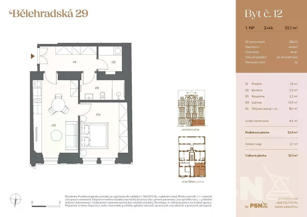 Severně orientovaný byt o dispozici 2+kk a podlahovou plochou 53 m² je součástí nového rezidenčního projektu Bělehradská 29, který vzniká kompletní rekonstrukcí novobarokního činžovního domu z roku 1910. Nachází se na pomezí Vinohrad a Nuslí - v živé čtvrti s kavárnami, službami i zelení, jen minutu od tramvajové zastávky Nuselské schody. Dokončení je plánováno na 3. čtvrtletí roku 2026. Půdorys bytu v 1. podlaží zahrnuje obývací pokoj s přípravou na kuchyni, ložnici, vstupní chodbu, praktickou komoru, koupelnu se sprchovým koutem a WC. K jednotce náleží také sklepní kóje. Dům projde kompletní rekonstrukcí. Vzniknou reprezentativní společné prostory, moderní výtah, repasované kamenné schodiště se zdobným zábradlím a nové technické zázemí. Rezidentům bude k dispozici sauna, fitness, kolárna a kočárkárna, ve vnitrobloku pak klidné místo k posezení mezi zelení. Budova stojí v klidném úseku ulice Bělehradská, jen pár kroků od tramvajové zastávky Nuselské schody. V okolí jsou oblíbené podniky jako Solo Bakery, Ô-mai coffee, Las Adelitas nebo pizzerie Da Pietro, v docházkové vzdálenosti také parky Folimanka a Grébovka. Nechybí zde lékárny, školy, fitness centra ani běžné služby. Na metro I. P. Pavlova se dostanete tramvají za čtyři minuty, do centra během deseti.