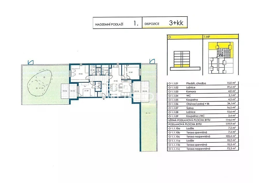 Nabízíme byt 4+kk o výměře 119 m² se dvěma soukromými zahradami, situovaný v prvním patře domu s výtahem. Nemovitost se nachází v krásné lokalitě Prahy 9 - Vysočany disponující veškerou občanskou vybaveností a dobrou dopravní infrastrukturou. Tento prostorný byt se nabízí nezařízený, disponující vstupní chodbou s vestavěnou skříní, obývacím pokojem s plně vybaveným kuchyňský koutem (sklokeramická deska, trouba, lednice, mrazák a myčka nádobí) a přímým vstupem terasu s předzahrádkou, 3 ložnicemi přičemž jedna z nich má přímý vstup na druhou terasu s předzahrádkou, 2 koupelnami (vana, sprchový kout a toaleta) a komorou. K bytu náleží dvě garážová stání a sklep. Čtvrť se skvělou dopravní dostupností s převážně novými bytovými domy. V pěší vzdálenosti jsou zastávky tramvají a stanice metra Kolbenova. Autem na městský okruh dojedete už za 2 minuty, na letiště Václava Havla za 29 minut a do nákupního a zábavního centra Galerie Harfa za 4 minuty. V místě najdete veškerou občanskou vybavenost - mateřské a základní školy, gymnázium, The English College in Prague, restaurace, supermarkety, lékárny, polikliniku, dětská hřiště, poštu. Pro volnočasové aktivity můžete využít v okolí fitness park, volejbalové hřiště, tenisové kurty, discgolf, skatepark, venkovní posilovny a cyklostezky. Na procházku se lze vydat do Klíčovských sadů, Parku nad Klíčovem nebo vyrazit na kole pro fitness stezce k rybníku Zahrádky. Výše vyúčtovatelných měsíčních záloh činí 7.000 Kč + elektřina a internet se převádí na nájemce. Poptávající klient je srozuměn s úhradou provize ve výši 1 měsíčního nájmu plus DPH. Pokud si nemovitost nemůžete prohlédnout osobně, nabízíme Vám také videoprohlídku z pohodlí Vašeho domova v reálném čase přes Messenger, WhatsApp a další komunikační platformy.
