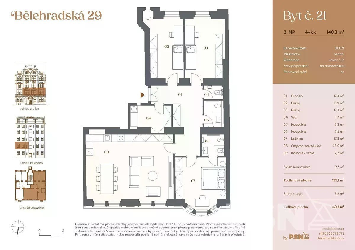 Jižně / Severně orientovaný byt o dispozici 4+kk a podlahové ploše 135,1 m² je součástí nového rezidenčního projektu Bělehradská 29, který vzniká kompletní rekonstrukcí novobarokního činžovního domu z roku 1910. Nachází se na pomezí Vinohrad a Nuslí - v živé čtvrti s kavárnami, službami i zelení, jen minutu od tramvajové zastávky Nuselské schody. Dokončení je plánováno na 3. čtvrtletí roku 2026. Půdorys bytu v 2. podlaží zahrnuje obývací pokoj s přípravou na kuchyni, tři ložnice, vstupní chodbu, praktickou komoru, koupelnu se sprchovým koutem a samostatnou toaletu. K jednotce náleží také sklepní kóje. Vybavení zahrnuje dubové podlahy, dřevěná špaletová okna s dvojsklem, elegantní interiérové dveře, koupelnu v nadčasovém designu se sanitou značek Laufen a Grohe a decentně řešená otopná tělesa a elektroinstalaci, která neruší celkový výraz interiéru. Byt bude dokončen v provedení fit out - připravený k okamžitému nastěhování. Dům projde kompletní rekonstrukcí. Vzniknou reprezentativní společné prostory, moderní výtah, repasované kamenné schodiště se zdobným zábradlím a nové technické zázemí. Rezidentům bude k dispozici sauna, fitness, kolárna a kočárkárna, ve vnitrobloku pak klidné místo k posezení mezi zelení. Budova stojí v klidném úseku ulice Bělehradská, jen pár kroků od tramvajové zastávky Nuselské schody. V okolí jsou oblíbené podniky jako Solo Bakery, Ô-mai coffee, Las Adelitas nebo pizzerie Da Pietro, v docházkové vzdálenosti také parky Folimanka a Grébovka. Nechybí zde lékárny, školy, fitness centra ani běžné služby. Na metro I. P. Pavlova se dostanete tramvají za čtyři minuty, do centra během deseti.