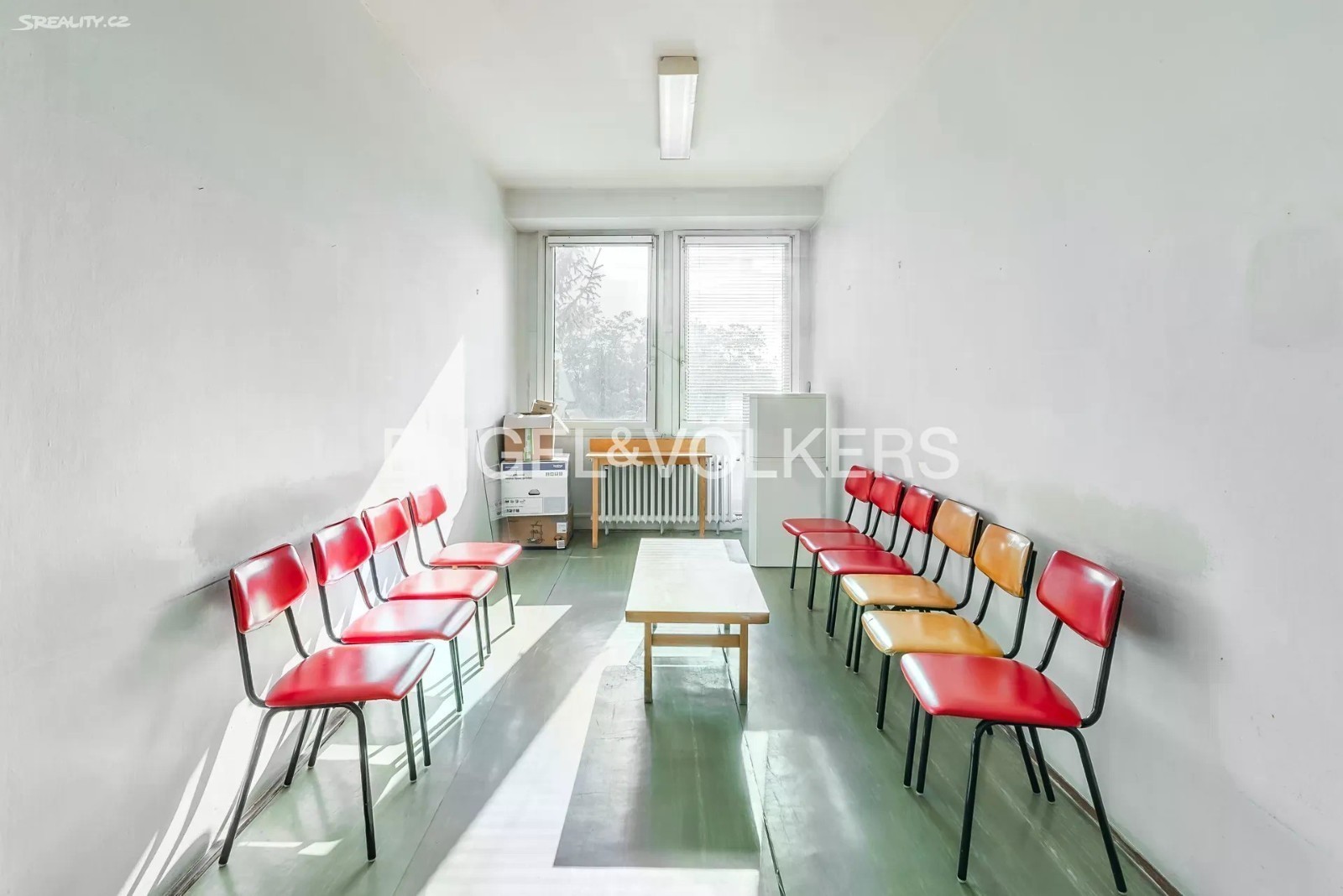 K pronájmu nabízíme prostory, které jsou vhodné pro zubní ordinaci (ale ne pro dentální hygienu), pneumologii a ftizeologii, alergologii nebo revmatologii v poliklinice na pražském Břevnově. Vstup do prostor je přes vstupní halu budovy, přístup do patra je možný po schodech nebo výtahem. K ordinaci patří čekárna v samostatné místnosti, která je sdílená se sousední stomatologickou ordinací. Prostorná místnost obdélníkového tvaru má dvě plastová otevíratelná okna s dvojsklem a s kovovými vodorovnými žaluziemi, je dostatečně prosvětlená, přírodní světlo doplňují dva lustry a lampa nad každým ze dvou umyvadel. Podlaha s dlažbou splňuje hygienické podmínky pro lehké omývání. V podlaze je zasazen přípojný bod elektrického vedení pro napojení zubařského křesla. Pro více informací nebo prohlídku nás kontaktujte. Fotografie jsou ilustrativní a místnost sousedí se společnou čekárnou na pravé straně.